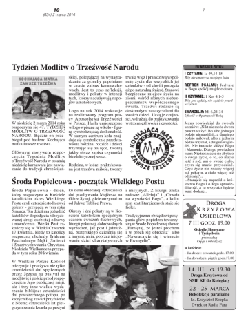10 1 (634) 2 marca 2014 Tydzień Modlitw o Trzeźwość Narodu skiej, polegającej na wynagradzaniu za grzechy popełniane w czasie zabaw karnawałowych. Jest to czas refleksji, modlitwy i pokuty w intencji tych, którzy nadużywają napojów alkoholowych. W niedzielę 2 marca 2014 roku rozpoczyna się 47. TYDZIEŃ MODLITW O TRZEŹWOŚĆ NARODU. Będzie on przebiegał pod hasłem: Kochająca matka zawsze trzeźwa. Logo na rok 2014 wskazuje na realizowany program pracy Apostolstwa Trzeźwości w Polsce. Hasła umieszczone w logo wpisane są w koło - figurę symbolizującą doskonałość. W samym centrum koła znajduje się symbolicznie przedstawiona rodzina: rodzice i dzieci trzymając się za ręce, tworzą jakby obraz zapisu czynności bioelektrycznej serca. trwałą więź i prawdziwą wspólnotę życia dla wszystkich jej członków - od chwili poczęcia aż po naturalną śmierć. Stanowi bezpieczne miejsce życia na ziemi, wśród różnych niebezpieczeństw współczesnego świata. Trzeźwi rodzice są doskonałymi nauczycielami dla swoich dzieci. Uczą je czujności, wdrażają do praktykowania wstrzemięźliwości i czystości. Głównym motywem rozpoczęcia Tygodnia Modlitw o Trzeźwość Narodu w ostatnią niedzielę karnawału jest nawią- Rodzina, w której praktykowazanie do tradycji chrześcijań- na jest trzeźwa miłość, tworzy Środa Popielcowa - początek Wielkiego Postu Środa Popielcowa - dzień, który rozpoczyna w Kościele katolickim okres Wielkiego Postu czyli czterdziestodniowej pokuty - przypada w tym roku 5 marca. Ten dzień ma pobudzić katolików do podjęcia zdecydowanej drogi osobistej odnowy i nawrócenia. Wielki Post zakończy się w Wielki Czwartek 17 kwietnia, kiedy to katolicy rozpoczną obchody Triduum Paschalnego Męki, Śmierci i Zmartwychwstania Chrystusa. Niedziela Wielkanocna przypada w tym roku 20 kwietnia. W Wielkim Poście Kościół odczytuje i przeżywa nie tylko czterdzieści dni spędzonych przez Jezusa na pustyni na modlitwie i poście przed rozpoczęciem Jego publicznej misji, ale i trzy inne wielkie wydarzenia biblijne: czterdzieści dni powszechnego potopu, po których Bóg zawarł przymierze z Noem; czterdzieści lat pielgrzymowania Izraela po pustyni ku ziemi obiecanej; czterdzieści dni przebywania Mojżesza na Górze Synaj, gdzie otrzymał on od Jahwe Tablice Prawa. Okresy i dni pokuty są w Kościele katolickim specjalnym czasem ćwiczeń duchowych, liturgii pokutnej, dobrowolnych wyrzeczeń, jak post i jałmużna, braterskiego dzielenia się z innymi, m.in. poprzez inicjowanie dzieł charytatywnych i misyjnych. Z liturgii znika radosne „Alleluja” i „Chwała na wysokości Bogu”, a kolorem szat liturgicznych staje się fiolet. Tradycyjnemu obrzędowi posypania głów popiołem towarzyszą w Środę Popielcową słowa: „Pamiętaj, że jesteś prochem i w proch się obrócisz” albo „Nawracajcie się i wierzcie w Ewangelię”. VIII NIEDZIELA ZWYKŁA I CZYTANIE: Iz 49,14-15 Bóg nie opuszcza swojego ludu REFREN PSALMU: Jedynie w Bogu spokój znajdzie dusza. II CZYTANIE: 1 Kor 4,1-5 Bóg jest sędzią, nie sądźcie przedwcześnie EWANGELIA: Mt 6,24-34 Ufność w Opatrzność Bożą Jezus powiedział do swoich uczniów: „Nikt nie może dwom panom służyć. Bo albo jednego będzie nienawidził, a drugiego będzie miłował; albo z jednym będzie trzymał, a drugim wzgardzi. Nie możecie służyć Bogu i Mamonie. Dlatego powiadam wam: Nie troszczcie się zbytnio o swoje życie, o to, co macie jeść i pić; ani o swoje ciało, czym się macie przyodziać. Czyż życie nie znaczy więcej niż pokarm, a ciało więcej niż odzienie?... ...Starajcie się naprzód o królestwo Boga i o Jego sprawiedliwość, a to wszystko będzie wam dodane... Droga Krzyżowa Osiedlowa 7 III godz. 19.00 Osiedle Słoneczne i Tysiąclecia prowadzą kręgi i młodzież w kościele: - dla dzieci: czwartek godz. 17.00 - dla dorosłych: piątek godz.17.00 14. III. g. 19.30 Droga Krzyżowa od NMP KP do Kolegiaty 22 - 25 Marca Rekolekcje parafialne ks. Krzysztof Rzepka Dyrektor Radia Fara 2 Chrystus Królem Przed kanonizacją... Dawca wolności Papież przyniósł nam wolność w różnych wymiarach, w tym także w politycznym. Wolności, choć jest fantastycznym darem i wartością, można używać źle i dobrze. Wielu ludzi koncentruje się na samej wolności, mówiąc „Najważniejsze, aby być wolnym i używać tej wolności w sposób niczym nieskrępowany”. Wielu zatem nie potrafi być naprawdę wolnymi. Nie ma wolności - niezmordowanie powtarzał Papież - bez odpowiedzialności i bez umiłowania prawdy. Wolność nie może prowadzić tylko do korzyści własnej. W przykazaniu miłości Boga i człowieka wolność znajduje najpełniejsze urzeczywistnienie, bo jest ona dla miłości. Wolność jest człowiekowi dana i zadana, by ukazywała prawdę o dobru. Poprzez nią człowiek zobowiązany jest do przyjęcia prawdy i jej realizowania. Jeśli wolność przestaje być związana z prawdą, a uzależnia prawdę od siebie, zmierza w prostej linii do różnego rodzaju totalitaryzmów (niekiedy pod pozorami demokracji) czyli dąży do samozniszczenia, czego dowodem był XX wiek. Umiłowanie wolności wiąże się u Jana Pawła II z umiłowaniem ojczyzny. Papież Pięknie tłumaczył to swoim życiem, ale i słowami: „Ojczyzna to jest poniekąd to samo, co ojcowizna, czyli zasób dóbr, które otrzymaliśmy w dziedzictwie po ojcach” (Jan Paweł II, Pamięć i tożsamość, Znak, Kraków 2005). To nie tylko ziemia i język, to kultura, a więc duchowe dobra narodu. Ojczyzna to ojciec i matka, a ponieważ przykazanie Boże mówi, że trzeba ich czcić, to i ojczyznę należy szanować. Tak rodzi się patriotyzm, czyli umiłowanie tego, co ojczyste: historii, tradycji, języka, a nawet krajobrazu. To także miłość do dzieł genialnych rodaków - muzyki, sztuki, li- teratury. Ojczyzna jest naszym „zbiorowym obowiązkiem” pisał Norwid,