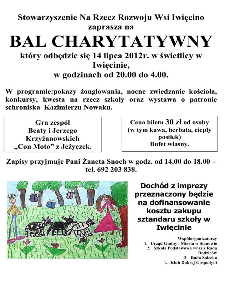 Stowarzyszenie Na Rzecz Rozwoju Wsi Iwięcino zaprasza na BAL CHARYTATYWNY który odbędzie się 14 lipca 2012r. w świetlicy w Iwięcinie, w godzinach od 20.00 do 4.00. W programie:pokazy żonglowania, nocne zwiedzanie kościoła, konkursy, kwesta na rzecz szkoły oraz wystawa o patronie schroniska Kazimierzu Nowaku. Gra zespół Beaty i Jerzego Krzyżanowskich „Con Moto” z Jeżyczek. Cena biletu 30 zł od osoby (w tym kawa, herbata, ciepły posiłek) Bufet własny. Zapisy przyjmuje Pani Żaneta Snoch w godz. od 14.00 do 18.00 – tel. 692 203 838. Dochód z imprezy przeznaczony będzie na dofinansowanie kosztu zakupu sztandaru szkoły w Iwięcinie Współorganizatorzy 1. Urząd Gminy i Miasta w Sianowie 2. Szkoła Podstawowa wraz z Radą Rodziców 3. Rada Sołecka 4. Klub Dobrej Gospodyni