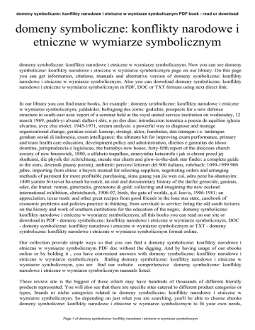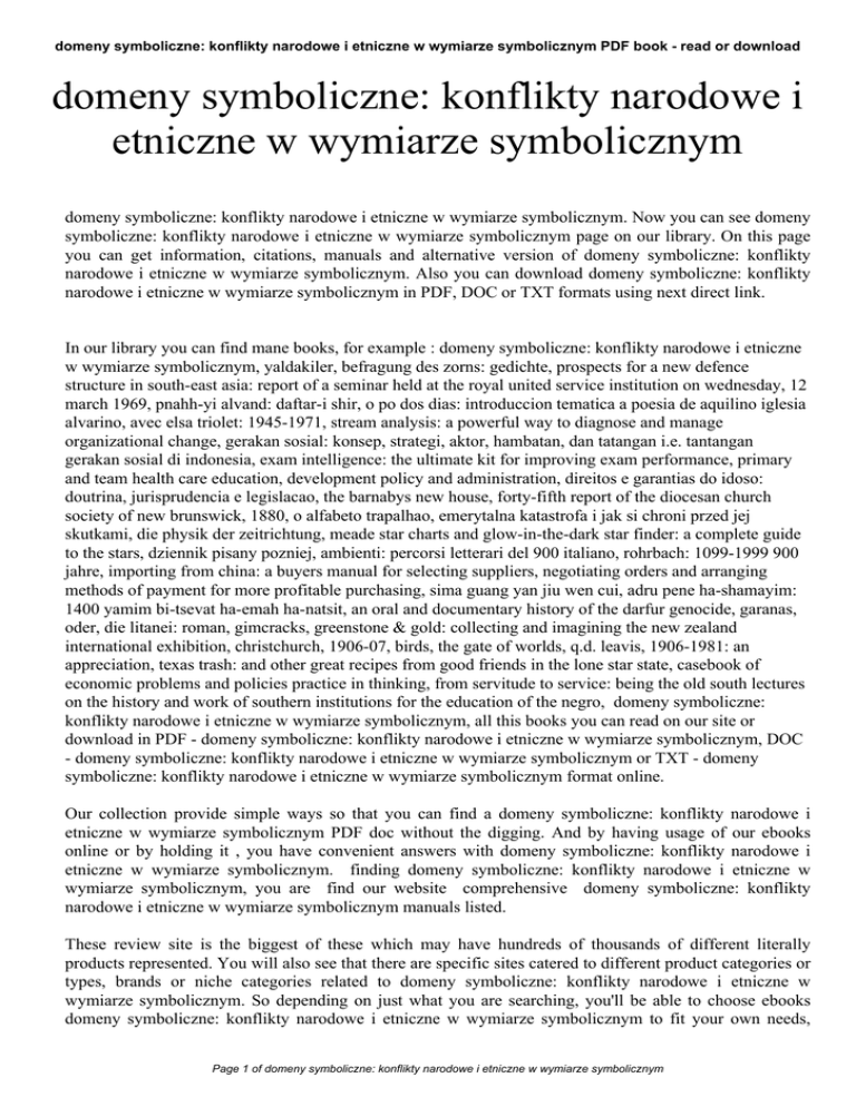 domeny symboliczne: konflikty narodowe i etniczne w wymiarze symbolicznym PDF book - read or download domeny symboliczne: konflikty narodowe i etniczne w wymiarze symbolicznym domeny symboliczne: konflikty narodowe i etniczne w wymiarze symbolicznym. Now you can see domeny symboliczne: konflikty narodowe i etniczne w wymiarze symbolicznym page on our library. On this page you can get information, citations, manuals and alternative version of domeny symboliczne: konflikty narodowe i etniczne w wymiarze symbolicznym. Also you can download domeny symboliczne: konflikty narodowe i etniczne w wymiarze symbolicznym in PDF, DOC or TXT formats using next direct link. In our library you can find mane books, for example : domeny symboliczne: konflikty narodowe i etniczne w wymiarze symbolicznym, yaldakiler, befragung des zorns: gedichte, prospects for a new defence structure in south-east asia: report of a seminar held at the royal united service institution on wednesday, 12 march 1969, pnahh-yi alvand: daftar-i shir, o po dos dias: introduccion tematica a poesia de aquilino iglesia alvarino, avec elsa triolet: 1945-1971, stream analysis: a powerful way to diagnose and manage organizational change, gerakan sosial: konsep, strategi, aktor, hambatan, dan tatangan i.e. tantangan gerakan sosial di indonesia, exam intelligence: the ultimate kit for improving exam performance, primary and team health care education, development policy and administration, direitos e garantias do idoso: doutrina, jurisprudencia e legislacao, the barnabys new house, forty-fifth report of the diocesan church society of new brunswick, 1880, o alfabeto trapalhao, emerytalna katastrofa i jak si chroni przed jej skutkami, die physik der zeitrichtung, meade star charts and glow-in-the-dark star finder: a complete guide to the stars, dziennik pisany pozniej, ambienti: percorsi letterari del 900 italiano, rohrbach: 1099-1999 900 jahre, importing from china: a buyers manual for selecting suppliers, negotiating orders and arranging methods of payment for more profitable purchasing, sima guang yan jiu wen cui, adru pene ha-shamayim: 1400 yamim bi-tsevat ha-emah ha-natsit, an oral and documentary history of the darfur genocide, garanas, oder, die litanei: roman, gimcracks, greenstone & gold: collecting and imagining the new zealand international exhibition, christchurch, 1906-07, birds, the gate of worlds, q.d. leavis, 1906-1981: an appreciation, texas trash: and other great recipes from good friends in the lone star state, casebook of economic problems and policies practice in thinking, from servitude to service: being the old south lectures on the history and work of southern institutions for the education of the negro, domeny symboliczne: konflikty narodowe i etniczne w wymiarze symbolicznym, all this books you can read on our site or download in PDF - domeny symboliczne: konflikty narodowe i etniczne w wymiarze symbolicznym, DOC - domeny symboliczne: konflikty narodowe i etniczne w wymiarze symbolicznym or TXT - domeny symboliczne: konflikty narodowe i etniczne w wymiarze symbolicznym format online. Our collection provide simple ways so that you can find a domeny symboliczne: konflikty narodowe i etniczne w wymiarze symbolicznym PDF doc without the digging. And by having usage of our ebooks online or by holding it , you have convenient answers with domeny symboliczne: konflikty narodowe i etniczne w wymiarze symbolicznym. finding domeny symboliczne: konflikty narodowe i etniczne w wymiarze symbolicznym, you are find our website comprehensive domeny symboliczne: konflikty narodowe i etniczne w wymiarze symbolicznym manuals listed. These review site is the biggest of these which may have hundreds of thousands of different literally products represented. You will also see that there are specific sites catered to different product categories or types, brands or niche categories related to domeny symboliczne: konflikty narodowe i etniczne w wymiarze symbolicznym. So depending on just what you are searching, you'll be able to choose ebooks domeny symboliczne: konflikty narodowe i etniczne w wymiarze symbolicznym to fit your own needs, Page 1 of domeny symboliczne: konflikty narodowe i etniczne w wymiarze symbolicznym domeny symboliczne: konflikty narodowe i etniczne w wymiarze symbolicznym PDF book - read or download domeny symboliczne: konflikty narodowe i etniczne w wymiarze symbolicznym. Page 2 of domeny symboliczne: konflikty narodowe i etniczne w wymiarze symbolicznym