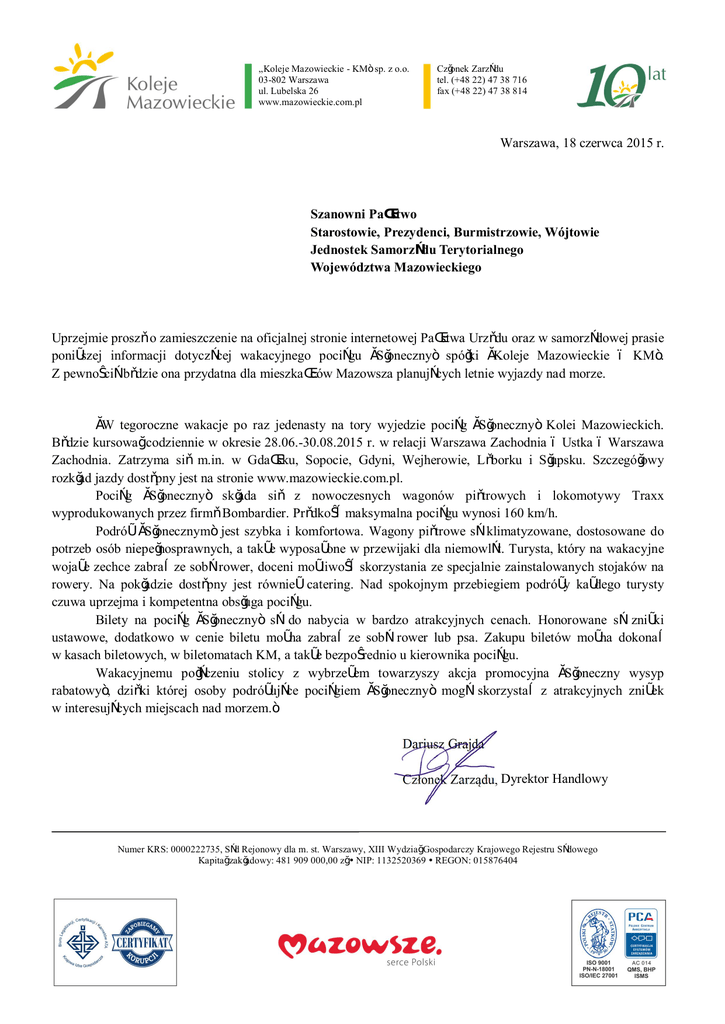 ,,Koleje Mazowieckie - KM” sp. z o.o. 03-802 Warszawa ul. Lubelska 26 www.mazowieckie.com.pl Członek Zarządu tel. (+48 22) 47 38 716 fax (+48 22) 47 38 814 Warszawa, 18 czerwca 2015 r. Szanowni Państwo Starostowie, Prezydenci, Burmistrzowie, Wójtowie Jednostek Samorządu Terytorialnego Województwa Mazowieckiego Uprzejmie proszę o zamieszczenie na oficjalnej stronie internetowej Państwa Urzędu oraz w samorządowej prasie poniższej informacji dotyczącej wakacyjnego pociągu „Słoneczny” spółki „Koleje Mazowieckie – KM”. Z pewnością będzie ona przydatna dla mieszkańców Mazowsza planujących letnie wyjazdy nad morze. „W tegoroczne wakacje po raz jedenasty na tory wyjedzie pociąg „Słoneczny” Kolei Mazowieckich. Będzie kursował codziennie w okresie 28.06.-30.08.2015 r. w relacji Warszawa Zachodnia – Ustka – Warszawa Zachodnia. Zatrzyma się m.in. w Gdańsku, Sopocie, Gdyni, Wejherowie, Lęborku i Słupsku. Szczegółowy rozkład jazdy dostępny jest na stronie www.mazowieckie.com.pl. Pociąg „Słoneczny” składa się z nowoczesnych wagonów piętrowych i lokomotywy Traxx wyprodukowanych przez firmę Bombardier. Prędkość maksymalna pociągu wynosi 160 km/h. Podróż „Słonecznym” jest szybka i komfortowa. Wagony piętrowe są klimatyzowane, dostosowane do potrzeb osób niepełnosprawnych, a także wyposażone w przewijaki dla niemowląt. Turysta, który na wakacyjne wojaże zechce zabrać ze sobą rower, doceni możliwość skorzystania ze specjalnie zainstalowanych stojaków na rowery. Na pokładzie dostępny jest również catering. Nad spokojnym przebiegiem podróży każdego turysty czuwa uprzejma i kompetentna obsługa pociągu. Bilety na pociąg „Słoneczny” są do nabycia w bardzo atrakcyjnych cenach. Honorowane są zniżki ustawowe, dodatkowo w cenie biletu można zabrać ze sobą rower lub psa. Zakupu biletów można dokonać w kasach biletowych, w biletomatach KM, a także bezpośrednio u kierownika pociągu. Wakacyjnemu połączeniu stolicy z wybrzeżem towarzyszy akcja promocyjna „Słoneczny wysyp rabatowy”, dzięki której osoby podróżujące pociągiem „Słoneczny” mogą skorzystać z atrakcyjnych zniżek w interesujących miejscach nad morzem.” Dariusz Grajda Członek Zarządu, Dyrektor Handlowy Numer KRS: 0000222735, Sąd Rejonowy dla m. st. Warszawy, XIII Wydział Gospodarczy Krajowego Rejestru Sądowego Kapitał zakładowy: 481 909 000,00 zł Ÿ NIP: 1132520369 Ÿ REGON: 015876404