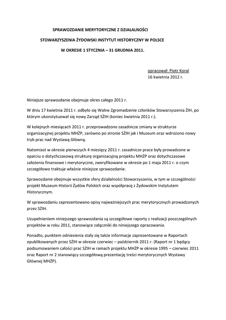 SPRAWOZDANIE MERYTORYCZNE Z DZIAŁALNOŚCI STOWARZYSZENIA ŻYDOWSKI INSTYTUT HISTORYCZNY W POLSCE W OKRESIE 1 STYCZNIA – 31 GRUDNIA 2011. opracował: Piotr Koral 16 kwietnia 2012 r. Niniejsze sprawozdanie obejmuje okres całego 2011 r. W dniu 17 kwietnia 2011 r. odbyło się Walne Zgromadzenie członków Stowarzyszenia ŻIH, po którym ukonstytuował się nowy Zarząd SŻIH (koniec kwietnia 2011 r.). W kolejnych miesiącach 2011 r. przeprowadzono zasadnicze zmiany w strukturze organizacyjnej projektu MHŻP, zarówno po stronie SŻIH jak i Muzeum oraz wdrożono nowy tryb prac nad Wystawą Główną. Natomiast w okresie pierwszych 4 miesięcy 2011 r. zasadnicze prace były prowadzone w oparciu o dotychczasową strukturę organizacyjną projektu MHŻP oraz dotychczasowe założenia finansowe i merytoryczne, zweryfikowane w okresie po 1 maja 2011 r. o czym szczegółowo traktuje właśnie niniejsze sprawozdanie. Sprawozdanie obejmuje wszystkie sfery działalności Stowarzyszenia, w tym w szczególności projekt Muzeum Historii Żydów Polskich oraz współpracę z Żydowskim Instytutem Historycznym. W sprawozdaniu zaprezentowano opisy najważniejszych prac merytorycznych prowadzonych przez SŻIH. Uzupełnieniem niniejszego sprawozdania są szczegółowe raporty z realizacji poszczególnych projektów w roku 2011, stanowiące załączniki do niniejszego opracowania. Ponadto, punktem odniesienia stały się także informacje zaprezentowane w Raportach opublikowanych przez SŻIH w okresie czerwiec – październik 2011 r. (Raport nr 1 będący podsumowaniem całości prac SŻIH w ramach projektu MHŻP w okresie 1995 – czerwiec 2011 oraz Raport nr 2 stanowiący szczegółową prezentację treści merytorycznych Wystawy Głównej MHŻP). I. Muzeum Historii Żydów Polskich: Na niniejszy okres sprawozdawczy przypadają kluczowe zmiany w odniesieniu do obsady personalnej, trybu działania i struktury organizacyjnej MHŻP, w tym także po stronie prac realizowanych przez SŻIH na rzecz powstającego Muzeum. W zasadniczej części zmiany odnotowane po stronie SŻIH dotyczą prac nad Wystawą Główną ale również i pozostałe działania prowadzone przez SŻIH w ramach projektu MHŻP uległy poważnym modyfikacjom na przestrzeni 2011 r. Ukonstytuowanie się nowego Zarządu Stowarzyszenia (kwiecień 2011) zbiegło się w czasie ze zmianami personalnymi w obsadzie stanowiska dyrektora Muzeum Historii Żydów Polskich, który poprzednio (od roku 2005) pełnił jednocześnie funkcję Koordynatora SŻIH ds. MHŻP nadając dominujący kierunek i charakter wszystkim pracom prowadzonym w ramach projektu MHŻP, w tym także przygotowaniom Wystawy Głównej. W okresie maj – czerwiec 2011 r. decyzjami Zarządu SŻIH został powołany Komitet Zarządzający SŻIH, w którym skupiono osoby odpowiedzialne za koordynację wszystkich prac merytorycznych realizowanych przez Stowarzyszenie na rzecz MHŻP. Grupa ta została także wyposażona w pełnomocnictwa finansowe umożliwiające realizowanie bieżących zobowiązań i sprawne podejmowanie decyzji. (Wszystkie opisane powyżej działania zostały szczegółowo zaprezentowane w Raporcie nr 1 opublikowanym przez SŻIH w czerwcu 2011 r.). Poniżej zaprezentowano wszystkie najważniejsze prace nadzorowane przez Komitet Zarządzający w niniejszym okresie sprawozdawczym. 1. Wystawa Główna: Uzupełnieniem poniższych informacji jest szczegółowy raport z realizacji prac nad Wystawą Główną, który stanowi załącznik do niniejszego opracowania. Zmiany w strukturze organizacyjnej i decyzyjnej wdrożone w I połowie 2011 r. umożliwiły przeprowadzenie poważnych rewizji dotychczasowych założeń finansowych i organizacyjnych dotyczących Wystawy Głównej i wypracowanie w ich miejsce nowych, bardziej racjonalnych rozwiązań (szczegółowo o działaniach tych informował Raport nr 1 str. 20 – 23 i 31 - 32). Podstawową zmianą było opracowanie nowych założeń finansowych dla realizacji Wystawy Głównej. Dzięki ograniczeniu liczby multimediów oraz zastosowaniu mniej kosztownych rozwiązań technologicznych, ale przy zachowaniu zaplanowanej zawartości merytorycznej i struktury narracyjnej Wystawy, osiągnięto znaczące redukcje kosztów w stosunku do poprzednich wycen (Raport nr 1 str. 20). Kolejną decyzją racjonalizującą prace nad Wystawą było zakończenie współpracy z brytyjską firmą Event Communications na etapie projektowania szczegółowego – tzw. Detailed Design (etap zakończony w maju 2011 r.) i powierzenie realizacji pozostałych prac nad Wystawą (modyfikacje projektowe i produkcja wraz z nadzorem) firmie Nizio Design International. Przyjęte rozwiązania umożliwiły wypracowanie racjonalnego budżetu pozwalającego na zakończenie prac nad Wystawą Główną do 2013 r. (Raport nr 1 str. 22). W dniu 2 września 2011 r. została podpisana umowa z Nizio Design International, która uwzględnia zmienione parametry finansowe oraz określa harmonogram wykonania Wystawy do kwietnia 2013 r. W grudniu 2011 r. zostało utworzone stanowisko Pełnomocnika Zarządu SŻIH ds. Wystawy Głównej. Pełnomocnikiem została p. Alicja Knast, kurator Muzeum Fryderyka Chopina w Warszawie. Zadaniem Pełnomocnika jest wsparcie SŻIH na etapie produkcji i instalowania Wystawy Głównej Muzeum Historii Żydów Polskich. W okresie czerwiec – grudzień 2011 r. uporządkowano kwestie wynagrodzeń w Zespole ds. Wystawy. Waloryzowano wynagrodzenia osobom najsłabiej uposażonym i ujednolicono poziom wynagrodzeń wśród koordynatorów i ich asystentów. Stan prac nad Wystawą Główną, w tym nad poszczególnymi jej galeriami, prezentuje Raport nr 1 opublikowany w czerwcu 2011 r. Uzupełnieniem informacji zawartych w tym Raporcie jest Raport nr 2 „Opowieść o Wystawie”, opublikowany przez SŻIH na początku października 2011 r., w którym zamieszczono szczegółowe opisy treści merytorycznych poszczególnych Galerii. 2. Pozyskiwanie zbiorów i eks