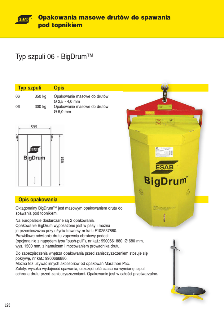 Opakowania masowe drutów do spawania pod topnikiem Typ szpuli 06 - BigDrum™ Typ szpuli 06 350 kg 06 300 kg Opis Opakowanie masowe do drutów Ø 2,5 - 4,0 mm Opakowanie masowe do drutów Ø 5,0 mm Opis opakowania Oktagonalny BigDrum™ jest masowym opakowaniem drutu do spawania pod topnikiem. Na europalecie dostarczane są 2 opakowania. Opakowanie BigDrum wyposażone jest w pasy i można je przemieszczać przy użyciu trawersy nr kat.: F102537880. Prawidłowe odwijanie drutu zapewnia obrotowy podest (opcjonalnie z napędem typu "push-pull"), nr kat.: 9900661880, Ø 680 mm, wys. 1500 mm, z hamulcem i mocowaniem prowadnika drutu. Do zabezpieczenia wnętrza opakowania przed zanieczyszczeniem stosuje się pokrywę, nr kat.: 9900666880. Można też używać innych akcesoriów od opakowań Marathon Pac. Zalety: wysoka wydajność spawania, oszczędność czasu na wymianę szpul, ochrona drutu przed zanieczyszczeniami. Opakowanie jest w całości przetwarzalne. L25 Opakowania masowe drutów do spawania pod topnikiem Typ szpuli 18 - drut w kręgach na stelażu "Spider" Typ szpuli 18-01 400 kg 18-51 400 kg 18-41 800 kg 18-91 800 kg Opis Masowe opakowanie do drutów niestopowych i niskostopowych, kierunek odwijania - w lewo Masowe opakowanie do drutów niestopowych i niskostopowych, kierunek odwijania - w prawo Masowe opakowanie do drutów niestopowych i niskostopowych, kierunek odwijania - w lewo Masowe opakowanie do drutów niestopowych i niskostopowych, kierunek odwijania - w prawo Opis opakowania Bezzwrotny stelaż z kręgami drutu do spawania pod topnikem o wadze 400 kg i 800 kg. Prawidłowe odwijanie drutu zapewnia obrotowy podest (opcjonalnie z napędem typu "push-pull"), nr kat.: 9900662880, Ø 1050 mm, wys. 1500 mm, z hamulcem i mocowaniem prowadnika drutu. W celu ochrony przed kurzem i zanieczyszczeniami, kręgi owinięte są folią, która stopniowo jest usuwana w trakcie zużywania drutu. L Zalety: wysoka wydajność spawania, oszczędność czasu na wymianę szpul, ochrona drutu przed zanieczyszczeniami. Elementy opakowania Spider są w całości przetwarzalne. L26 Opakowania masowe drutów do spawania pod topnikiem Typ szpuli 33-3 "EcoCoil" Typ szpuli 33-3 1000 kg Opis Opakowanie masowe drutów do spawania pod topnikiem Opis opakowania Bezzwrotne kręgi drutu do spawania pod topnikem o wadze 1000 kg. Prawidłowe odwijanie drutu zapewnia obrotowy podest (opcjonalnie z napędem typu "push-pull"), nr kat.: 9900662880, Ø 1050 mm, wys. 1500 mm, z hamulcem i mocowaniem prowadnika drutu. W celu ochrony przed kurzem i zanieczyszczeniami, kręgi owinięte są folią, która stopniowo jest usuwana w trakcie zużywania drutu. Zalety: wysoka wydajność spawania, oszczędność czasu na wymianę szpul, ochrona drutu przed zanieczyszczeniami. Elementy opakowania EcoCoil są w całości przetwarzalne. L27