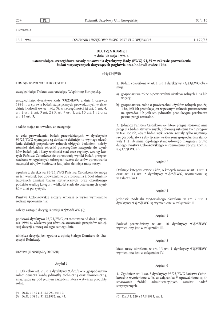 254 PL Dziennik Urzędowy Unii Europejskiej 03/t. 16 DZIENNIK URZĘDOWY WSPÓLNOT EUROPEJSKICH L 179/33 31994D0434 13.7.1994 DECYZJA KOMISJI z dnia 30 maja 1994 r. ustanawiająca szczegółowe zasady stosowania dyrektywy Rady (EWG) 93/25 w zakresie prowadzenia badań statystycznych dotyczących pogłowia oraz hodowli owiec i kóz (94/434/WE) KOMISJA WSPÓLNOT EUROPEJSKICH, uwzględniając Traktat ustanawiający Wspólnotę Europejską, uwzględniając dyrektywę Rady 93/25/EWG z dnia 1 czerwca 1993 r. w sprawie badań statystycznych prowadzonych w dziedzinie hodowli owiec i kóz (1), w szczególności jej art. 1 ust. 4, art. 2 ust. 2, art. 3 ust. 2 i 3, art. 7 ust. 1, art. 10 ust. 1 i 2 oraz art. 13 ust. 3, a także mając na uwadze, co następuje: w celu prowadzenia badań przewidzianych w dyrektywie 93/25/EWG wymagane są dokładne definicje; to wymaga określenia definicji gospodarstw rolnych objętych badaniem; należy również dokładnie określić poszczególne kategorie do wyników badań, jak i klasy wielkości stad oraz regiony, według których Państwa Członkowskie opracowują wyniki badań przeprowadzane w regularnych odstępach czasu; do celów opracowania statystyki ubojów konieczna jest jedna definicja masy tuszy; zgodnie z dyrektywą 93/25/EWG Państwa Członkowskie mogą na ich wniosek być upoważnione do stosowania źródeł administracyjnych zamiast badań statystycznych oraz określonego podziału według kategorii wielkości stada do ostatecznych wyników z lat parzystych; Państwa Członkowskie złożyły wnioski o wyżej wymienione rodzaje upoważnienia; 2. Badania określone w art. 1 ust. 1 dyrektywy 93/23/EWG obejmują: a) gospodarstwa rolne o powierzchni użytków rolnych 1 ha lub więcej; b) gospodarstwa rolne o powierzchni użytków rolnych poniżej 1 ha, jeśli ich produkcja jest w pewnym zakresie przeznaczona na sprzedaż lub jeśli ich jednostka produkcyjna przekracza pewne progi naturalne. 3. Jednakże Państwa Członkowskie, które pragną stosować inne progi dla badań statystycznych, dokonują ustalenia tych progów w taki sposób, aby z badań wykluczone zostały tylko najmniejsze gospodarstwa i aby łącznie wykluczone gospodarstwa stanowiły 1 % lub mniej ogólnego standardowego marginesu brutto danego Państwa Członkowskiego w rozumieniu decyzji Komisji 85/377/EWG (3). Artykuł 2 Definicje kategorii owiec i kóz, o których mowa w art. 3 ust. 1 oraz art. 13 ust. 2 dyrektywy 93/25/EWG, wymienione są w załączniku I. Artykuł 3 Jednostki podziału terytorialnego określone w art. 7 ust. 1 dyrektywy 93/25/EWG są wymienione w załączniku II. należy zastąpić decyzję Komisji 82/958/EWG (2); Artykuł 4 ponieważ dyrektywa 93/25/EWG jest stosowana od dnia 1 stycznia 1994 r., właściwe jest również stosowanie przepisów niniejszej decyzji z mocą od tego samego dnia; Podział przewidziany w art. 10 dyrektywy 93/25/EWG wymieniony jest w załączniku III. niniejsza decyzja jest zgodna z opinią Stałego Komitetu ds. Statystyki Rolniczej, Artykuł 5 PRZYJMUJE NINIEJSZĄ DECYZJĘ: Artykuł 1 1. Dla celów art. 2 ust. 2 dyrektywy 93/25/EWG „gospodarstwo rolne” oznacza każdą jednostkę techniczną oraz ekonomiczną, znajdującą się pod jednym zarządem, która wytwarza produkty rolne. (1) Dz.U. L 149 z 21.6.1993, str. 10. (2) Dz.U. L 386 z 31.12.1982, str. 43. Masa tuszy określona w art. 13 ust. 1 dyrektywy 93/25/EWG wymieniona jest w załączniku IV. Artykuł 6 1. Zgodnie z art. 1 ust. 3 dyrektywy 93/25/EWG Państwa Członkowskie wymienione w lit. a) załącznika V upoważnione są do stosowania źródeł administracyjnych zamiast badań statystycznych. (3) Dz.U. L 220 z 17.8.1985, str. 1. 03/t. 16 Dziennik Urzędowy Unii Europejskiej PL 2. Zgodnie z art. 10 ust. 2 dyrektywy 93/25/EWG Państwa Członkowskie wymienione w lit. b) załącznika V upoważnione są do stosowania podziału według klasy wielkości stada do ostatecznych wyników z lat parzystych. Artykuł 7 Decyzja 82/958/EWG niniejszym traci moc. 255 Artykuł 9 Niniejsza decyzja skierowana jest do Państw Członkowskich. Sporządzono w Brukseli, dnia 30 maja 1994 r. W imieniu Komisji Artykuł 8 Henning CHRISTOPHERSEN Niniejszą decyzję stosuje się z mocą od dnia 1 stycznia 1994 r. Wiceprzewodniczący 256 PL Dziennik Urzędowy Unii Europejskiej ZAŁĄCZNIK I Definicje kategorii Maciorki i jarki dopuszczone do tryka Samice owiec, które przynajmniej raz okociły się, jak również te, które zostały dopuszczone do tryka po raz pierwszy. Mleczne owce Maciorki, które są hodowane tylko i wyłącznie lub głównie do produkcji mleka do spożycia przez ludzi i/lub dla przetwórstwa na produkty mleczarskie. Obejmuje również wybrakowane owce (niezależnie od tego, czy były tuczone między ostatnią laktacją i ubojem). Inne maciorki Maciorki inne niż owce mleczne. Jagnięta Samce i samice owiec poniżej 12 miesięcy. 03/t. 16 03/t. 16 Dziennik Urzędowy Unii Europejskiej PL 257 ZAŁĄCZNIK II Jednostki podziału terytorialnego Belgia: Prowincje /Provincies Dania: — Niemcy: Bundesländer Grecja: Regiony Służby Rozwoju Regionalnego Hiszpania: País Vasco Francja: — dla owiec, następujące regiony: Midi-Pyrénées Poitou — Charentes Limousin Aquitaine Provence-Alpes-Côte d’Azur Auvergne inne regiony — dla kóz, następujące regiony: Rhône-Alpes Poitou-Charentes Centre-Pays-de-la-Loire Bourgogne Midi — Pyrénées inne regiony Irlandia: — Włochy: — dla owiec: Regioni — dla kóz: Regioni: Piemonte Lombardia Tosca Lazio Campania Puglia Basilicata Calabria Sicili Sardegna inne Comunidades Autónomas Luksemburg: — Niderlandy: Provincies Portugalia: Regiões Zjednoczone Królestwo: Standard Regions Navarra La Rioja Aragón Cataluña Baleares Castilla y Léon Madrid Castilla-La Mancha Comunidad Valenciana Región de Murcia Extremadura Andalucía inne regiony Klasy wielkości hodowanych stad owiec TABELA 1 ZAŁĄCZNIK III 258 PL Dziennik Urzędowy Unii Europejs