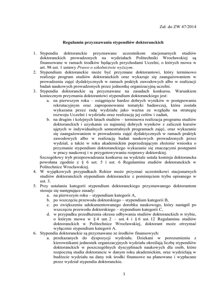 Zał. do ZW 47/2014 Regulamin przyznawania stypendiów doktoranckich 1. Stypendia doktoranckie przyznawane uczestnikom stacjonarnych studiów doktoranckich prowadzonych na wydziałach Politechniki Wrocławskiej są finansowane w ramach środków będących przychodami Uczelni, o których mowa w art. 98 ust. 1 ustawy Prawo o szkolnictwie wyższym. 2. Stypendium doktoranckie może być przyznane doktorantowi, który terminowo realizuje program studiów doktoranckich oraz wykazuje się zaangażowaniem w prowadzeniu zajęć dydaktycznych w ramach praktyk zawodowych albo w realizacji badań naukowych prowadzonych przez jednostkę organizacyjną uczelni. 3. Stypendia doktoranckie są przyznawane na zasadach konkursu. Warunkiem koniecznym przyznania doktorantowi stypendium doktoranckiego jest: a. na pierwszym roku – osiągnięcie bardzo dobrych wyników w postępowaniu rekrutacyjnym oraz zaproponowanie tematyki badawczej, która została wykazana przez radę wydziału jako ważna ze względu na strategię rozwoju Uczelni i wydziału oraz realizację jej celów i zadań, b. na drugim i kolejnych latach studiów – terminowa realizacja programu studiów doktoranckich i uzyskanie co najmniej dobrych wyników z zaliczeń kursów ujętych w indywidualnych semestralnych programach zajęć, oraz wykazanie się zaangażowaniem w prowadzeniu zajęć dydaktycznych w ramach praktyk zawodowych albo w realizację badań naukowych prowadzonych przez wydział, a także w roku akademickim poprzedzającym złożenie wniosku o przyznanie stypendium doktoranckiego wykazanie się znaczącymi postępami w pracy naukowej i w przygotowywaniu rozprawy doktorskiej. Szczegółowy tryb przeprowadzania konkursu na wydziale ustala komisja doktorancka powołana zgodnie z § 6 ust. 5 i ust. 6 Regulaminu studiów doktoranckich w Politechnice Wrocławskiej. 4. W wyjątkowych przypadkach Rektor może przyznać uczestnikowi stacjonarnych studiów doktoranckich stypendium doktoranckie z pominięciem trybu opisanego w ust. 3. 5. Przy ustalaniu kategorii stypendium doktoranckiego przyznawanego doktorantom stosuje się następujące zasady: a. na pierwszym roku – stypendium kategorii A, b. po wszczęciu przewodu doktorskiego – stypendium kategorii B, c. po zwiększeniu udokumentowanego dorobku naukowego, który nastąpił po wszczęciu przewodu doktorskiego – stypendium kategorii C, d. w przypadku przedłużenia okresu odbywania studiów doktoranckich w trybie, o którym mowa w § 4 ust. 2 – ust. 4 i § 6 ust. 12 Regulaminu studiów doktoranckich w Politechnice Wrocławskiej, doktorant może otrzymać wyłącznie stypendium kategorii A. 6. Stypendia doktoranckie są przyznawane ze środków finansowych: a. przekazanych do dyspozycji wydziału. Dziekani w porozumieniu z kierownikami jednostek organizacyjnych wydziału określają liczbę stypendiów doktoranckich w poszczególnych dyscyplinach naukowych dla osób, które rozpoczną studia doktorancie w danym roku akademickim, oraz wydzielają w budżecie wydziału na dany rok środki finansowe na planowane i wypłacane przez wydział stypendia doktoranckie. 1 b. pozostających w dyspozycji Rektora najlepszym doktorantom, którzy podejmują badania kreujące nowe, priorytetowe kierunki nauki. Liczbę tych stypendiów doktoranckich na poszczególnych wydziałach określa Rektor. c. pozostających w dyspozycji Rektora w przypadku stypendiów doktoranckich, o których mowa w ust. 4. 7. Stypendium doktoranckie przyznaje Rektor na wniosek doktoranta (wzór – załączniki nr 1 i nr 2), zaopiniowany przez komisję doktorancką. Komisja doktorancka, po zaopiniowaniu wniosków o przyznanie stypendium doktoranckiego, przekazuje Rektorowi listę doktorantów rekomendowanych do przyznania stypendium ze środków finansowych , o których mowa w ust. 6 pkt a i pkt b, zgodnie z wytycznymi rady wydziału. Rektor może przyznać doktorantowi tylko jedno stypendium doktoranckie, które jest wypłacane w danym okresie. 8. Stypendia doktoranckie na dany rok akademicki są przyznawane w trzech kategoriach oznaczonych literami A, B i C, w zróżnicowanej wysokości. Wysokość stypendium doktoranckiego nie może być niższa niż 60 % minimalnego wynagrodzenia zasadniczego asystenta, ustalonego w przepisach o wynagradzaniu nauczycieli akademickich. Wysokości stypendiów doktoranckich w danym roku akademickim w poszczególnych kategoriach są ustalane przed rozpoczęciem roku akademickiego. 9. Stypendium doktoranckie jest przyznawane na okres 12 miesięcy i wypłacane co miesiąc z góry na początku każdego miesiąca przelewem na podany przez doktoranta rachunek oszczędnościowo-rozliczeniowy. Wypłata stypendium doktoranckiego dokonywana w semestrze zimowym obejmuje miesiące: październik, listopad, grudzień, styczeń, luty i marzec, wypłata stypendium doktoranckiego dokonywana w semestrze letnim obejmuje miesiące: kwiecień, maj, czerwiec, lipiec, sierpień i wrzesień. Zmiana kategorii stypendium doktoranckiego może nastąpić wyłącznie z początkiem kolejnego semestru. 10. Stypendium doktoranckie jest przyznawane niezależnie od innych otrzymywanych przez doktoranta świadczeń i stypendiów. 11. W przypadku niewypełniania przez doktoranta postanowień § 5. ust. 2 Regulaminu studiów doktoranckich w Politechnice Wrocławskiej, a w szczególności nieskładania w wyznaczonych terminach sprawozdań, stypendium doktoranckie może zostać wstrzymane. Wznowienie wypłat stypendium doktoranckiego, z jednoczesną wypłatą wstrzymanych wypłat stypendium doktoranckiego, powinno nastąpić od kolejnego miesiąca po miesiącu, w którym nastąpi usunięcie przyczyn wstrzymania stypendium doktoranckiego. 12. W przypadku skreślenia doktoranta z listy uczestników studiów doktoranckich zaprzestaje się wypłaty stypendium doktoranckiego z pierwszym dniem miesiąca następującego po miesiącu, w którym decyzja o skreśleniu stała się ostateczna. 13. Doktorant, który przedłożył roz