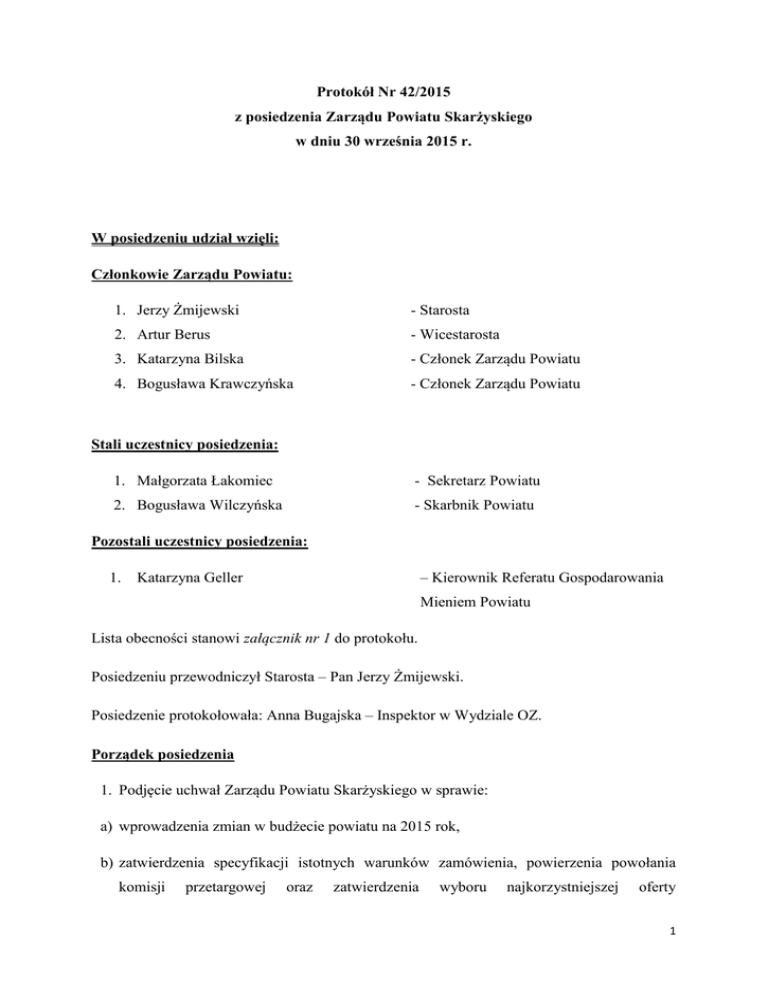 Protokół Nr 42/2015 z posiedzenia Zarządu Powiatu Skarżyskiego w dniu 30 września 2015 r. W posiedzeniu udział wzięli: Członkowie Zarządu Powiatu: 1. Jerzy Żmijewski - Starosta 2. Artur Berus - Wicestarosta 3. Katarzyna Bilska - Członek Zarządu Powiatu 4. Bogusława Krawczyńska - Członek Zarządu Powiatu Stali uczestnicy posiedzenia: 1. Małgorzata Łakomiec - Sekretarz Powiatu 2. Bogusława Wilczyńska - Skarbnik Powiatu Pozostali uczestnicy posiedzenia: 1. – Kierownik Referatu Gospodarowania Katarzyna Geller Mieniem Powiatu Lista obecności stanowi załącznik nr 1 do protokołu. Posiedzeniu przewodniczył Starosta – Pan Jerzy Żmijewski. Posiedzenie protokołowała: Anna Bugajska – Inspektor w Wydziale OZ. Porządek posiedzenia 1. Podjęcie uchwał Zarządu Powiatu Skarżyskiego w sprawie: a) wprowadzenia zmian w budżecie powiatu na 2015 rok, b) zatwierdzenia specyfikacji istotnych warunków zamówienia, powierzenia powołania komisji przetargowej oraz zatwierdzenia wyboru najkorzystniejszej oferty 1 w postępowaniu o udzielenie zamówienia publicznego pn. „Dostawa sprzętu komputerowego i oprogramowania” 2. Rozpatrzenie pism skierowanych do Zarządu Powiatu. 3. Sprawy różne. Starosta – Pan Jerzy Żmijewski powitał zebranych. Następnie przedstawił porządek posiedzenia oraz zapytał o uwagi lub wnioski. Wicestarosta – Pan Artur Berus zgłosił wniosek o rozszerzenie porządku posiedzenia o podjęcie uchwały Zarządu Powiatu w sprawie: przeprowadzenia postępowania w celu wyłonienia kandydata na biegłego rewidenta do badania sprawozdania finansowego za 2015 rok w Zespole Opieki Zdrowotnej w Skarżysku-Kamiennej Szpitalu Powiatowym im. Marii Skłodowskiej-Curie. Kolejny wniosek o rozszerzenie porządku zgłosiła Członek Zarządu – Pani Katarzyna Bilska. Pani Katarzyna Bilska poprosiła o wprowadzenie dwóch projektów uchwał Zarządu Powiatu w sprawie: upoważnienia Pana Janusza Maciejewskiego – Dyrektora Zespołu Szkół Technicznych im. Armii Krajowej w Skarżysku-Kamiennej. Zarząd Powiatu jednogłośnie przyjął porządek posiedzenia z uwzględnieniem zgłoszonych wniosków. Porządek posiedzenia, po zmianie: 1. Podjęcie uchwał Zarządu Powiatu Skarżyskiego w sprawie: a) wprowadzenia zmian w budżecie powiatu na 2015 rok, b) zatwierdzenia specyfikacji istotnych warunków zamówienia, powierzenia powołania komisji przetargowej oraz zatwierdzenia wyboru najkorzystniejszej oferty w postępowaniu o udzielenie zamówienia publicznego pn. „Dostawa sprzętu komputerowego i oprogramowania”, c) przeprowadzenia postępowania w celu wyłonienia kandydata na biegłego rewidenta do badania sprawozdania finansowego za 2015 rok w Zespole Opieki Zdrowotnej w Skarżysku-Kamiennej Szpitalu Powiatowym im. Marii Skłodowskiej-Curie, 2 d) upoważnienia Pana Janusza Maciejewskiego – Dyrektora Zespołu Szkół Technicznych im. Armii Krajowej w Skarżysku-Kamiennej, e) upoważnienia Pana Janusza Maciejewskiego – Dyrektora Zespołu Szkół Technicznych im. Armii Krajowej w Skarżysku-Kamiennej. 2. Rozpatrzenie pism skierowanych do Zarządu Powiatu. 3. Sprawy różne. Streszczenie posiedzenia: Ad. pkt. 1 . Podjęcie uchwał Zarządu Powiatu Skarżyskiego w sprawie: a) wprowadzenia zmian w budżecie powiatu na 2015 rok, (załącznik nr 2) Referująca: Skarbnik Powiatu – Pani Bogusława Wilczyńska wyjaśniła, że zmiany wprowadzone w uchwale wynikają z: 1. Decyzji Wojewody Świętokrzyskiego znak FN.I.3111.605.2015 z dnia 24.09.2015 r. – w sprawie zwiększenia dotacji celowej o 6.642 zł na sfinansowanie kosztów sporządzenia operatów szacunkowych nieruchomości Skarbu Państwa, 2. Decyzji Wojewody Świętokrzyskiego znak FN.I.3111.607.2015 z dnia 25.09.2015 r. – w sprawie zwiększenia dotacji celowej o 1.000 zł na zakup podręczników dla Zespołu Placówek Edukacyjno-Wychowawczych zgodnie z Rządowym programem wspierania w 2015 r. organów prowadzących szkoły podstawowe i szkoły artystyczne realizujące kształcenie ogólne w zakresie szkoły podstawowej w obszarze rozwijania zainteresowań uczniów przez promocję czytelnictwa wśród dzieci i młodzieży „Książki naszych marzeń”. Wkład własny w wysokości 20% tj. 250 zł. zabezpieczony zostaje z rezerwy celowej na oświatę i wychowanie, 3. Pisma Zespołu Placówek Opieki, Wychowania i Interwencji Kryzysowej Przystań z dnia 17 września 2015 r. w sprawie przeniesienia planu wydatków pomiędzy paragrafami w wysokości 18.200 zł. w związku ze zmianami regulacji płac pracowników placówki, 4. Pisma Specjalnego Ośrodka Szkolno-Wychowawczego Nr 2 z dnia 23 września 2015r. w sprawie przeniesienia planu wydatków pomiędzy paragrafami i rozdziałami 3 w wysokości 2.900 zł. w celu zabezpieczenia niezbędnych wydatków jednostki: ubezpieczenie samochodu służbowego oraz pochodne od wynagrodzeń, 5. Pisma I Liceum Ogólnokształcącego z dnia 28 września 2015 r. zawierającego prośbę o zmiany w planie w kwocie 3.000 zł na zabezpieczenie niezbędnych do funkcjonowania jednostki usług, 6. Pisma Wydziału Edukacji z dnia 28 września 2015 r. w sprawie przeniesienia z rezerwy celowej przeznaczonej na oświatę i wychowanie kwoty 15.000 zł. na zakup energii oraz wywóz nieczystości i inne niezbędne wydatki w Zespole Placówek Resocjalizacyjno-Wychowawczych, 7. Pisma Zespołu Placówek Edukacyjno-Wychowawczych z dnia 28.09.2015 r. w sprawie przeniesienia wydatków płacowych w łącznej kwocie 144.200 zł. pomiędzy rozdziałami w związku ze zmianą przydziału godzin nauczycieli w poszczególnych szkołach, 8. Pisma Komendy Powiatowej Państwowej Straży Pożarnej z dnia 25 września 2015 r. w sprawie przeniesienia wydatków płacowych w wysokości 1.331 zł. pomiędzy paragrafami. Zarząd Powiatu jednogłośnie podjął przedmiotową uchwałę. b) zatwierdzenia specyfikacji istotnych warunków zamówienia, powierzenia powołania komisji przetargowej oraz zatwierdzenia wy