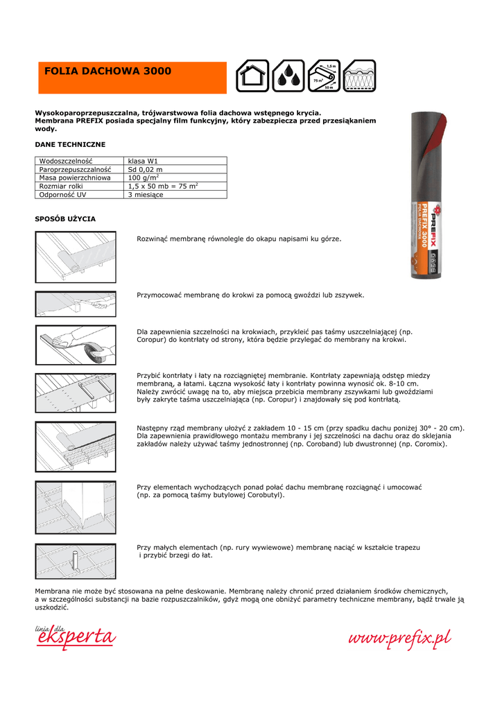 FOLIA DACHOWA 3000 Wysokoparoprzepuszczalna, trójwarstwowa folia dachowa wstępnego krycia. Membrana PREFIX posiada specjalny film funkcyjny, który zabezpiecza przed przesiąkaniem wody. DANE TECHNICZNE Wodoszczelność Paroprzepuszczalność Masa powierzchniowa Rozmiar rolki Odporność UV klasa W1 Sd 0,02 m 100 g/m2 1,5 x 50 mb = 75 m2 3 miesiące SPOSÓB UŻYCIA Rozwinąć membranę równolegle do okapu napisami ku górze. Przymocować membranę do krokwi za pomocą gwoździ lub zszywek. Dla zapewnienia szczelności na krokwiach, przykleić pas taśmy uszczelniającej (np. Coropur) do kontrłaty od strony, która będzie przylegać do membrany na krokwi. Przybić kontrłaty i łaty na rozciągniętej membranie. Kontrłaty zapewniają odstęp miedzy membraną, a łatami. Łączna wysokość łaty i kontrłaty powinna wynosić ok. 8-10 cm. Należy zwrócić uwagę na to, aby miejsca przebicia membrany zszywkami lub gwoździami były zakryte taśma uszczelniająca (np. Coropur) i znajdowały się pod kontrłatą. Następny rząd membrany ułożyć z zakładem 10 - 15 cm (przy spadku dachu poniżej 30° - 20 cm). Dla zapewnienia prawidłowego montażu membrany i jej szczelności na dachu oraz do sklejania zakładów należy używać taśmy jednostronnej (np. Coroband) lub dwustronnej (np. Coromix). Przy elementach wychodzących ponad połać dachu membranę rozciągnąć i umocować (np. za pomocą taśmy butylowej Corobutyl). Przy małych elementach (np. rury wywiewowe) membranę naciąć w kształcie trapezu i przybić brzegi do łat. Membrana nie może być stosowana na pełne deskowanie. Membranę należy chronić przed działaniem środków chemicznych, a w szczególności substancji na bazie rozpuszczalników, gdyż mogą one obniżyć parametry techniczne membrany, bądź trwale ją uszkodzić.