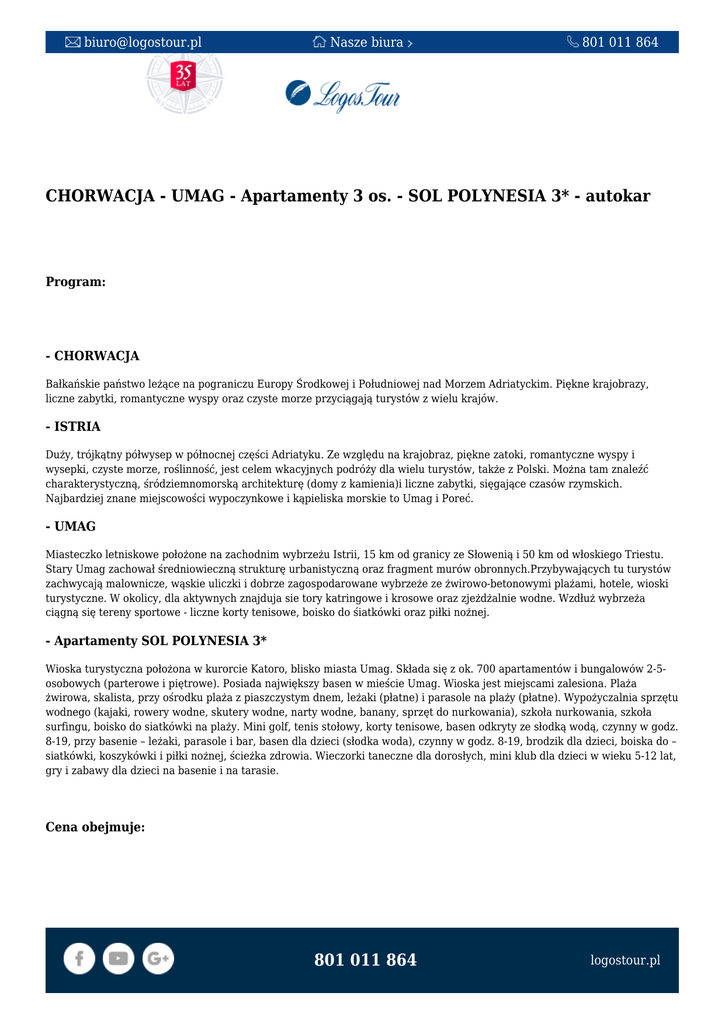 [email protected] Nasze biura 801 011 864 CHORWACJA - UMAG - Apartamenty 3 os. - SOL POLYNESIA 3* - autokar Program: - CHORWACJA Bałkańskie państwo leżące na pograniczu Europy Środkowej i Południowej nad Morzem Adriatyckim. Piękne krajobrazy, liczne zabytki, romantyczne wyspy oraz czyste morze przyciągają turystów z wielu krajów. - ISTRIA Duży, trójkątny półwysep w północnej części Adriatyku. Ze względu na krajobraz, piękne zatoki, romantyczne wyspy i wysepki, czyste morze, roślinność, jest celem wkacyjnych podróży dla wielu turystów, także z Polski. Można tam znaleźć charakterystyczną, śródziemnomorską architekturę (domy z kamienia)i liczne zabytki, sięgające czasów rzymskich. Najbardziej znane miejscowości wypoczynkowe i kąpieliska morskie to Umag i Poreć. - UMAG Miasteczko letniskowe położone na zachodnim wybrzeżu Istrii, 15 km od granicy ze Słowenią i 50 km od włoskiego Triestu. Stary Umag zachował średniowieczną strukturę urbanistyczną oraz fragment murów obronnych.Przybywających tu turystów zachwycają malownicze, wąskie uliczki i dobrze zagospodarowane wybrzeże ze żwirowo-betonowymi plażami, hotele, wioski turystyczne. W okolicy, dla aktywnych znajduja sie tory katringowe i krosowe oraz zjeżdżalnie wodne. Wzdłuż wybrzeża ciągną się tereny sportowe - liczne korty tenisowe, boisko do śiatkówki oraz piłki nożnej. - Apartamenty SOL POLYNESIA 3* Wioska turystyczna położona w kurorcie Katoro, blisko miasta Umag. Składa się z ok. 700 apartamentów i bungalowów 2-5osobowych (parterowe i piętrowe). Posiada największy basen w mieście Umag. Wioska jest miejscami zalesiona. Plaża żwirowa, skalista, przy ośrodku plaża z piaszczystym dnem, leżaki (płatne) i parasole na plaży (płatne). Wypożyczalnia sprzętu wodnego (kajaki, rowery wodne, skutery wodne, narty wodne, banany, sprzęt do nurkowania), szkoła nurkowania, szkoła surfingu, boisko do siatkówki na plaży. Mini golf, tenis stołowy, korty tenisowe, basen odkryty ze słodką wodą, czynny w godz. 8-19, przy basenie – leżaki, parasole i bar, basen dla dzieci (słodka woda), czynny w godz. 8-19, brodzik dla dzieci, boiska do – siatkówki, koszykówki i piłki nożnej, ścieżka zdrowia. Wieczorki taneczne dla dorosłych, mini klub dla dzieci w wieku 5-12 lat, gry i zabawy dla dzieci na basenie i na tarasie. Cena obejmuje: 801 011 864 logostour.pl [email protected] Nasze biura 801 011 864 Dodatkowe informacje: WARUNKI PŁATNOŚCI 30% zaliczki przy podpisaniu umowy, dopłata do 100% na 21 dni przed wyjazdem. ZAKWATEROWANIE Każdy apartament składa się z 1 sypialni dla 2 osób, pokoju dziennego (z TV i telefonem), będącego jednocześnie sypialnią dla pozostałych osób, aneksu kuchennego z wyposażeniem (kuchenka elektryczna, lodówka, sprzęt kuchenny i naczynia) oraz łazienki (WC, prysznic). WYŻYWIENIE We własnym zakresie. Istnieje możliwość wykupienia wyżywienia (śniadanie i kolacje) w cenie 90 PLN za dzień. TERMINY Turnusy tygodniowe od piątku do piątku. UBEZPIECZENIE Ubezpieczenie obowiązkowe Signal Iduna NW (7000 PLN), KL (15 000 EUR); dodatkowo płatne 25 PLN/osoba. DODATKOWE OPŁATY Opłata klimatyczna, udział w imprezach sportowych (animacje) i konkursach w cenie. TRANSPORT Dojazd autokarem za dopłatą 370 PLN. Wyjazdy w czwartki, powroty w soboty. Miejsca w autokarze są przydzielane wg kolejności zapisów na imprezę. Autokar o podwyższonym standardzie; uchylne, wysokie siedzenia, klimatyzacja, toaleta, barek, wideo. Obsługa – dwóch kierowców i pilot. Czas przejazdu Polska-półwysep Istria – ok. 16 godzin. Trasa Słowacja-Węgry-Chorwacja. Grafik transportu: Wyjazdy z Polski w czwartki Kraków; godz. 1330 – parking przy hotelu „Wyspiański”, ul. Westerplatte 15 Nowy Sącz; godz. 1600 – parking przy Dworcu PKP Wyjazdy z Chorwacji w piątki Umag (Baśanija); godz. 1800 Poreć; godz. 1845 Przyjazdy do Polski w soboty w godzinach południowych, na miejsce wyjazdu. 801 011 864 logostour.pl [email protected] Nasze biura 801 011 864 Terminy: 15.06 - 24.06.2017, 1912 PLN 06.07 - 15.07.2017, 2592 PLN 13.07 - 22.07.2017, 2592 PLN 20.07 - 29.07.2017, 2711 PLN 27.07 - 05.08.2017, 2711 PLN 10.08 - 19.08.2017, 2711 PLN 17.08 - 26.08.2017, 2592 PLN 24.08 - 02.09.2017, 2218 PLN 31.08 - 09.09.2017, 1512.5 PLN 07.09 - 16.09.2017, 1512.5 PLN 801 011 864 logostour.pl