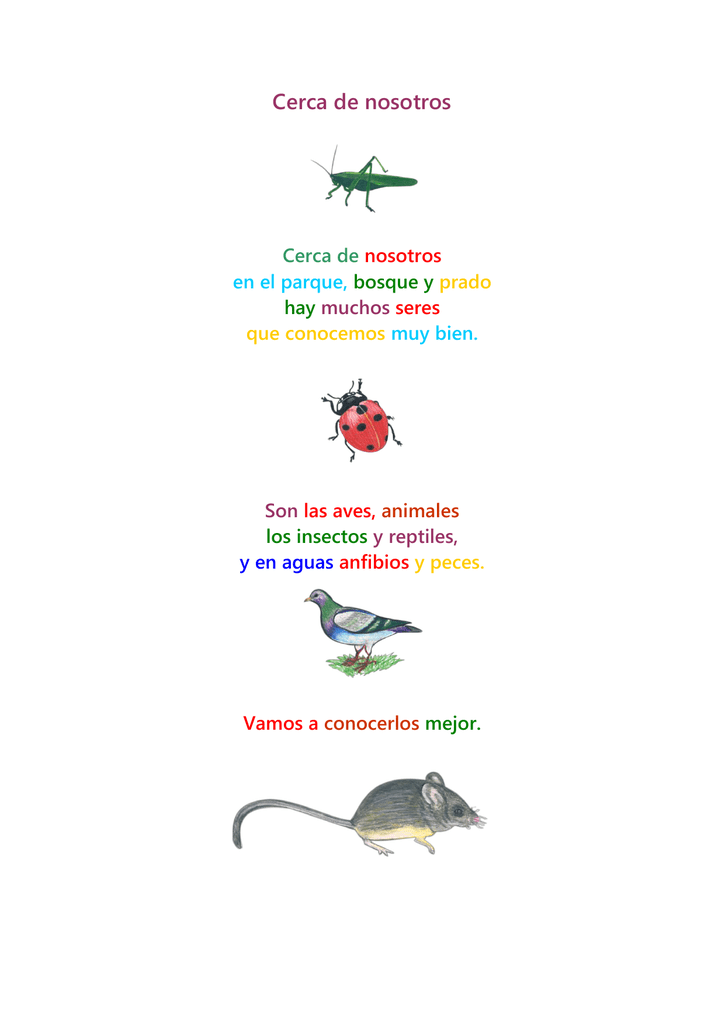 Cerca de nosotros Cerca de nosotros en el parque, bosque y prado hay muchos seres que conocemos muy bien. Son las aves, animales los insectos y reptiles, y en aguas anfibios y peces. Vamos a conocerlos mejor. la mariquita la cigűeña el cisne la rana el jabalí la hormiga Połącz liniami obrazki z ich nazwami la golondrina el loro el buho la paloma el gallo la cigűeña el ganso el pato Rozwiąż krzyżówkę 1 4 3 4 2 1 G 3 O L o R 5 A V N O O A R R 6 R O d R I n 2 A C o V E j A 6 N 5 Pokoloruj obrazki i podpisz je L a h o r m i g a L a a b e j a j a b a l i E l g a n s o l a g a r t i j a E l e r i z o E l L a