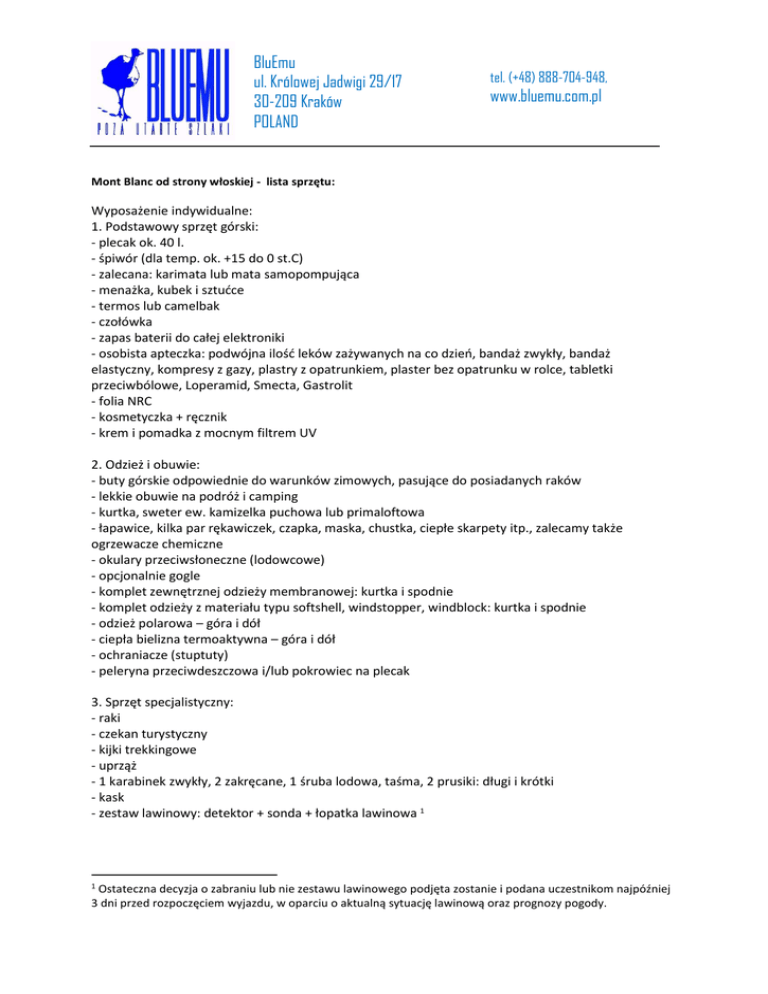 BluEmu ul. Królowej Jadwigi 29/17 30-209 Kraków POLAND tel. (+48) 888-704-948, www.bluemu.com.pl Mont Blanc od strony włoskiej - lista sprzętu: Wyposażenie indywidualne: 1. Podstawowy sprzęt górski: - plecak ok. 40 l. - śpiwór (dla temp. ok. +15 do 0 st.C) - zalecana: karimata lub mata samopompująca - menażka, kubek i sztućce - termos lub camelbak - czołówka - zapas baterii do całej elektroniki - osobista apteczka: podwójna ilość leków zażywanych na co dzień, bandaż zwykły, bandaż elastyczny, kompresy z gazy, plastry z opatrunkiem, plaster bez opatrunku w rolce, tabletki przeciwbólowe, Loperamid, Smecta, Gastrolit - folia NRC - kosmetyczka + ręcznik - krem i pomadka z mocnym filtrem UV 2. Odzież i obuwie: - buty górskie odpowiednie do warunków zimowych, pasujące do posiadanych raków - lekkie obuwie na podróż i camping - kurtka, sweter ew. kamizelka puchowa lub primaloftowa - łapawice, kilka par rękawiczek, czapka, maska, chustka, ciepłe skarpety itp., zalecamy także ogrzewacze chemiczne - okulary przeciwsłoneczne (lodowcowe) - opcjonalnie gogle - komplet zewnętrznej odzieży membranowej: kurtka i spodnie - komplet odzieży z materiału typu softshell, windstopper, windblock: kurtka i spodnie - odzież polarowa – góra i dół - ciepła bielizna termoaktywna – góra i dół - ochraniacze (stuptuty) - peleryna przeciwdeszczowa i/lub pokrowiec na plecak 3. Sprzęt specjalistyczny: - raki - czekan turystyczny - kijki trekkingowe - uprząż - 1 karabinek zwykły, 2 zakręcane, 1 śruba lodowa, taśma, 2 prusiki: długi i krótki - kask - zestaw lawinowy: detektor + sonda + łopatka lawinowa 1 1 Ostateczna decyzja o zabraniu lub nie zestawu lawinowego podjęta zostanie i podana uczestnikom najpóźniej 3 dni przed rozpoczęciem wyjazdu, w oparciu o aktualną sytuację lawinową oraz prognozy pogody.
