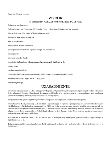 Sygn. akt III AUa 1332/14 WYROK W IMIENIU RZECZYPOSPOLITEJ POLSKIEJ Dnia 20 stycznia 2015 r. Sąd Apelacyjny we Wrocławiu III Wydział Pracy i Ubezpieczeń Społecznych w składzie: Przewodniczący: SSA Irena Różańska-Dorosz (spr.) Sędziowie:SSA Ireneusz Lejczak SSA Maria Pietkun Protokolant: Robert Purchalak po rozpoznaniu w dniu 20 stycznia 2015 r. we Wrocławiu na rozprawie sprawy z wniosku R. R. przeciwko Zakładowi Ubezpieczeń Społecznych Oddział w L. o emeryturę na skutek apelacji R. R. od wyroku Sądu Okręgowego w Legnicy Sądu Pracy i Ubezpieczeń Społecznych z dnia 03-06-2014 r. sygn. akt V U 1933/2014 oddala apelację. UZASADNIENIE Wyrokiem z 3 czerwca 2014 r. Sąd Okręgowy w Legnicy V Wydział Pracy i Ubezpieczeń Społecznych oddalił odwołanie R. R. od decyzji Zakładu Ubezpieczeń Społecznych Oddziału w L. z 19 lutego 2014 r., odmawiającej wnioskodawcy prawa do emerytury z tytułu pracy w warunkach szczególnych. Powyższe rozstrzygnięcie Sąd Okręgowy wydał w oparciu o następująco ustalony stan faktyczny: Wnioskodawca R. R., urodzony (...), na dzień 1 stycznia 1999 r. wykazał wymagane 25 lat okresów składkowych i nieskładkowych. Wnioskodawca przystąpił do OFE, ale złożył wniosek o przekazanie środków zgromadzonych na rachunku w otwartym funduszu emerytalnym za pośrednictwem Zakładu na dochody budżetu państwa. W okresie od 1 lipca 1972 r. do 31 marca 1980 r. R. R. był zatrudniony w (...) Zakłady (...) w N., w pełnym wymiarze czasu pracy, wykonując pracę kierowcy widlaków. W czasie od 1 kwietnia 1980 r. do 31 marca 1981 r. ubezpieczony wykonywał pracę kierowcy ciągnikowego w Spółdzielni (...) w O.. Taką samą pracę kierowcy ciągnikowego R. R. wykonywał w okresie od 1 kwietnia 1981 r. do 30 kwietnia 1991 r. w Spółdzielni (...). Pracę traktorzysty – mechanika ubezpieczony wykonywał w wymiarze ½ etatu w okresie od 27 listopada 1995 r. do 27 grudnia 1996 r. w Zakładzie (...) z siedzibą w B.. Przy tak ustalonym stanie faktycznym Sąd pierwszej instancji uznał, że odwołanie wnioskodawcy nie zasługiwało na uwzględnienie. Sąd ten, przytaczając treść art. 184 i art. 32 ustawy z dnia 17 grudnia 1998 r. o emeryturach i rentach z Funduszu Ubezpieczeń Społecznych oraz przepisy rozporządzenia Rady Ministrów z dnia 7 lutego 1983 r. w sprawie wieku emerytalnego pracowników zatrudnionych w szczególnych warunkach lub w szczególnym charakterze wskazał, że bezspornym było, że w dacie wydania decyzji przez organ emerytalny wnioskodawca ukończył 60 lat, zaś na dzień 1 stycznia 1999 r. udowodnił wymagane okresy składkowe i nieskładkowe w wymiarze 25 lat. Wnioskodawca przystąpił do OFE, ale złożył wniosek o przekazanie środków zgromadzonych na rachunku w otwartym funduszu emerytalnym za pośrednictwem Zakładu na dochody budżetu państwa. Sporną kwestią było natomiast to, czy wnioskodawca posiadał 15-letni staż pracy w szczególnych warunkach. Sąd stwierdził, że w świetle całokształtu zebranego w sprawie materiału dowodowego kluczowe znaczenie dla rozstrzygnięcia sprawy miała ocena charakteru pracy wykonywanej przez wnioskodawcę w okresie od 1 lipca 1972 r. do 31 sierpnia 1980 r. Zdaniem tego Sądu w okresie zatrudnienia w (...) R. R. nie wykonywał stale i w pełnym wymiarze czasu pracy prac wymienionych w stanowiącym załącznik do wymienionego rozporządzenia wykazie A, Dział VIII, poz. 2 i 3, w związku z przepisami ustawy z dnia 20 czerwca 1997 r. Prawo o ruchu drogowym (Dz. U. z 2012 r., poz. 1137 ze zm.). Wykonując pracę kierowcy widlaków ubezpieczony nie wykonywał sugerowanej przez niego pracy kierowcy ciągników, wymienionej w dziale VIII, poz. 3, czy też pracy kierowcy samochodów ciężarowych, wymienionej w dziale VIII, poz. 2. Sąd Okręgowy wskazał, że w świetle art. 2 pkt 42a i pkt 44 wymienionej ustawy, ciągnik może być samochodowy, tj. pojazd samochodowy przeznaczony konstrukcyjnie wyłącznie do ciągnięcia przyczepy; określenie to obejmuje ciągnik siodłowy i ciągnik balastowy lub rolniczy, tj. pojazd silnikowy, którego konstrukcja umożliwia rozwijanie prędkości nie mniejszej niż 6 km/h, skonstruowany do używania łącznie ze sprzętem do prac rolnych, leśnych lub ogrodniczych; ciągnik taki może być również przystosowany do ciągnięcia przyczep oraz do prac ziemnych. W przekonaniu Sądu widlaki, których operatorem był wnioskodawca nie są ciągnikami samochodowymi, gdyż nie są przeznaczone konstrukcyjnie wyłącznie do ciągnięcia przyczepy i nie mogą być uznane za ciągnik siodłowy, ani też ciągnik balastowy. Widlaki nie są również skonstruowane do używania łącznie ze sprzętem rolniczym do prac rolnych, leśnych lub ogrodniczych, ani też nie są przystosowane do ciągnięcia przyczep oraz do prac ziemnych. Konstrukcja widlaków umożliwia jedynie unoszenie ciężarów i ich przemieszczanie, i to jest ich jedyna ze względu na ich konstrukcję i przeznaczenie możliwa do wykorzystania funkcja. Wbrew argumentom ubezpieczonego, widlak nie jest także samochodem ciężarowym, gdyż nie jest pojazdem samochodowym przeznaczonym konstrukcyjnie do przewozu ładunków; jest pojazdem przystosowanym jedynie do unoszenia w celu przemieszczenia ładunków. Wyjaśnienie powyższych okoliczności nie wymagało, zdaniem Sądu, wiedzy specjalnej, stąd nieprzydatnego do rozstrzygnięcia tych okoliczności dowodu z opinii biegłego z zakresu transportu Sąd Okręgowy nie uwzględnił. W świetle zebranego w sprawie materiału Sąd pierwszej instancji uznał, że w okresie zatrudnienia w (...), R. R. nie wykonywał stale i w pełnym wymiarze czasu pracy kierowcy, czy to pojazdów samochodowych, czy też ciągników. W tych zaś okolicznościach ocena pozostałych spornych okresów, których łączny wymiar jest krótszy od wymaganych co najmniej 15 lat, jest bezprzedmiotowa. Niezależnie bowiem od charakteru wykonywanej w tych spornych okr