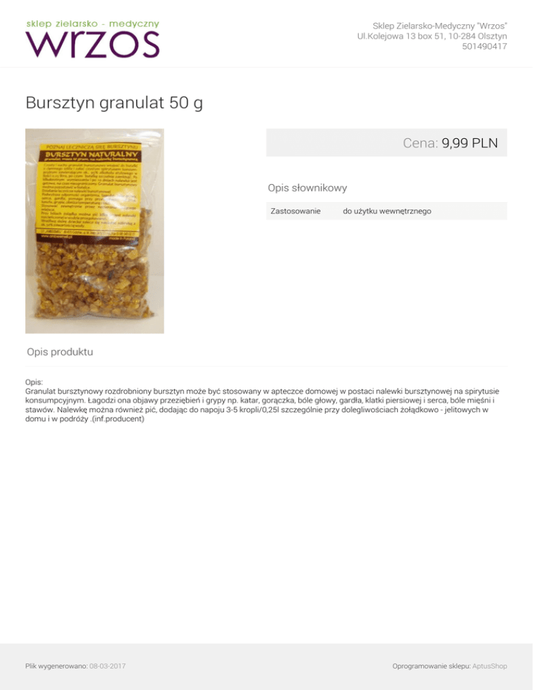 Sklep Zielarsko-Medyczny "Wrzos" Ul.Kolejowa 13 box 51, 10-284 Olsztyn 501490417 Bursztyn granulat 50 g Cena: 9,99 PLN Opis słownikowy Zastosowanie do użytku wewnętrznego Opis produktu Opis: Granulat bursztynowy rozdrobniony bursztyn może być stosowany w apteczce domowej w postaci nalewki bursztynowej na spirytusie konsumpcyjnym. Łagodzi ona objawy przeziębień i grypy np. katar, gorączka, bóle głowy, gardła, klatki piersiowej i serca, bóle mięśni i stawów. Nalewkę można również pić, dodając do napoju 3-5 kropli/0,25l szczególnie przy dolegliwościach żołądkowo - jelitowych w domu i w podróży .(inf.producent) Plik wygenerowano: 08-03-2017 Powered by TCPDF (www.tcpdf.org) Oprogramowanie sklepu: AptusShop