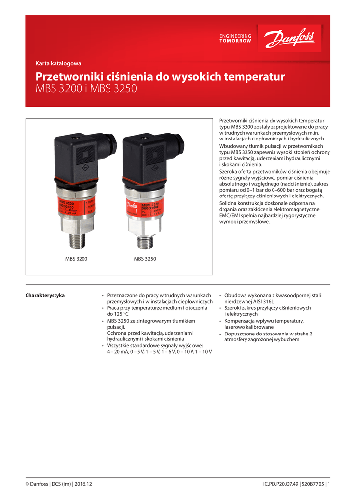 Karta katalogowa Przetworniki ciśnienia do wysokich temperatur MBS 3200 i MBS 3250 Przetworniki ciśnienia do wysokich temperatur typu MBS 3200 zostały zaprojektowane do pracy w trudnych warunkach przemysłowych m.in. w instalacjach ciepłowniczych i hydraulicznych. Wbudowany tłumik pulsacji w przetwornikach typu MBS 3250 zapewnia wysoki stopień ochrony przed kawitacją, uderzeniami hydraulicznymi i skokami ciśnienia. Szeroka oferta przetworników ciśnienia obejmuje różne sygnały wyjściowe, pomiar ciśnienia absolutnego i względnego (nadciśnienie), zakres pomiaru od 0–1 bar do 0–600 bar oraz bogatą ofertę przyłączy ciśnieniowych i elektrycznych. Solidna konstrukcja doskonale odporna na drgania oraz zakłócenia elektromagnetyczne EMC/EMI spełnia najbardziej rygorystyczne wymogi przemysłowe. MBS 3200 Charakterystyka © Danfoss | DCS (im) | 2016.12 MBS 3250 • Przeznaczone do pracy w trudnych warunkach przemysłowych i w instalacjach ciepłowniczych • Praca przy temperaturze medium i otoczenia do 125 °C • MBS 3250 ze zintegrowanym tłumikiem pulsacji. Ochrona przed kawitacją, uderzeniami hydraulicznymi i skokami ciśnienia • Wszystkie standardowe sygnały wyjściowe: 4 – 20 mA, 0 – 5 V, 1 – 5 V, 1 – 6 V, 0 – 10 V, 1 – 10 V • Obudowa wykonana z kwasoodpornej stali nierdzewnej AISI 316L • Szeroki zakres przyłączy ciśnieniowych i elektrycznych • Kompensacja wpływu temperatury, laserowo kalibrowane • Dopuszczone do stosowania w strefie 2 atmosfery zagrożonej wybuchem IC.PD.P20.Q7.49 | 520B7705 | 1 Karta katalogowa | Przetworniki ciśnienia do wysokich temperatur, MBS 3200 i 3250 MBS 3250 z tłumikiem pulsacji Zastosowanie Parametry medium Kawitacja, uderzenia hydrauliczne i piki ciśnienia mogą mieć miejsce w układach hydraulicznych, w których występują gwałtowne zmiany przepływu, np. szybkie zamykanie zaworu lub załączanie / wyłączanie pompy. Zjawiska te mogą pojawić się zarówno po stronie tłocznej, jak i ssącej pompy oraz za lub przed zaworem, nawet przy stosunkowo niskim ciśnieniu roboczym. Lepkość mediów tylko w niewielkim stopniu wpływa na czas reakcji. Czas reakcji nie przekracza 4 ms nawet przy lepkości mediów sięgającej 100 cSt. Tłumik pulsacji Dane techniczne Charakterystyka (EN 60770) Dokładność (zawiera nieliniowość, histerezę i powtarzalność) ≤ ±0,5% zakresu (typ.) ≤ ±1,0% zakresu (maks.) Nieliniowość BFSL ≤ ±0,2% zakresu Histereza i powtarzalność ≤ ±0,1% zakresu Zakres błędu termicznego (w zakresie kompensacji temp.) ≤ ±1,0% zakresu Czas reakcji Ciecze o lepkości < 100 cSt < 4 ms Powietrze i gazy (MBS 3250) < 35 ms Dopuszczalne przeciążenie ciśnienia (statyczne) 6 × zakres (maks. 1500 bar) Ciśnienie niszczące 6 × zakres (maks. 2000 bar) Żywotność, P: 10–90% zakresu > 10×106 cykli Charakterystyka elektryczna Sygnał wyjściowy (zabezpieczony przeciwzwarciowo) 4 – 20 mA 0 – 5, 1 – 5, 1 – 6 V DC 0 – 10 V, 1 – 10 V DC Napięcie zasilające [UB], zabezpieczenie przed zmianą biegunowości 9 – 32 V DC 10 – 30 V DC 15 – 30 V DC – < 5 mA < 8 mA Pobór prądu Wpływ napięcia zasilającego ≤ ±0,1% zakresu/10 V Prąd graniczny 28 mA (typ.) – – ≥ 25 kΩ Impedancja wyjściowa Obciążenie [RL] (podłączane do 0 V) RL ≤ (UB-9 V)/0,02 A RL ≥ 10 kΩ RL ≥ 15 kΩ Warunki pracy Zakres temperatury czujnika (w zależności od materiału uszczelki) Normalny -40 – 125 °C ATEX strefy 2 -10 – 85 °C Maksymalna temperatura medium 165 - (0,35×temperatura otoczenia) Temperatura otoczenia (w zależność od podłączenia elektrycznego) Patrz strona 5 Kompensacja wpływu temperatury 0 – 100 °C Temperatura przechowywania -50 – 125 °C Emisja zakłóceń elektromagnetycznych EN 61000-6-3 Odporność na zakłócenia elektromagnetyczne EN 61000-6-2 Odporność izolacji na przebicie > 100 MΩ przy 100 V DC Test częstotliwości zasilania Odporność na drgania Odporność na uderzenia Wg. normy SEN 361503 Sinusoidalne 15,9 mm-pp, 5 Hz – 25 Hz 20 g, 25 Hz – 2 kHz Losowe 7,5 gskut., 5 Hz – 1 kHz IEC 60068-2-64 Uderzenie 500 g/1 ms IEC 60068-2-27 Upadek 1m IEC 60068-2-32 Stopień ochrony (w zależności od podłączenia elektrycznego) 2 | 520B7705 | IC.PD.P20.Q7.49 IEC 60068-2-6 Patrz strona 5 © Danfoss | DCS (im) | 2016.12 Karta katalogowa | Przetworniki ciśnienia do wysokich temperatur, MBS 3200 i 3250 Dane techniczne (ciąg dalszy) Atmosfera zagrożona wybuchem Zastosowanie w Strefie 2 EN 60079-0; EN 60079-15 W aplikacjach ATEX strefy 2 przy temperaturach < -10 °C kabel i wtyczka muszą być chronione przed uderzeniami. Charakterystyka mechaniczna Materiały Elementy mające kontakt z medium EN 10088-1; 1,4404 (AISI 316 L) Obudowa EN 10088-1; 1,4404 (AISI 316 L) Podłączenie elektryczne Patrz strona 5 Przyłącze ciśnieniowe Patrz strona 4 Masa (w zależności od przyłącza ciśnieniowego i elektrycznego) 0,2 – 0,3 kg Zamawianie MBS 3200 MBS 3250 – – Zakres pomiaru 0 – 1,0 bar 0 – 1,6 bar 0 – 2,5 bar 0 – 4,0 bar 0 – 6,0 bar 0 – 10 bar 0 – 16 bar 0 – 25 bar 0 – 40 bar 0 – 60 bar 0 – 100 bar 0 – 160 bar 0 – 250 bar 0 – 400 bar 0 – 600 bar Materiał uszczelki 10 12 14 16 18 20 22 24 26 28 30 0 1 Przyłącze ciśnieniowe AB04 AB08 AC04 BC08 GA12 GB04 FA09 Absolutne G ¼ A (EN837) – MBS 3200 G ½ A (EN 837) ¼ – 18 NPT ½ – 14 NPT – MBS 3200 DIN 3852-A M18×1,5, bez uszczelki – MBS 3250 DIN 3852-E-G ¼, z uszczelką: DIN 3869-14 NBR DIN 3852-E-M14×1,5, z uszczelką: DIN 3869-14 NBR – MBS 3250 32 34 36 38 1 2 3 5 8 Ciśnienie odniesienia Względne (nadciśnienie) Brak uszczelki (patrz przyłącze ciśnienia) Viton (temp. medium: -20 – 125 °C) 1 2 Podłączenie elektryczne Wtyk EN175301-803-A * Wtyk, AMP Econoseal, seria J, męski, bez złącza żeńskiego Przewód ekranowany, 2 m * Wtyk, EN 60947-5-2, M12×1, męski, bez złącza żeńskiego * Wtyk, AMP Superseal, seria 1,5, męski, be