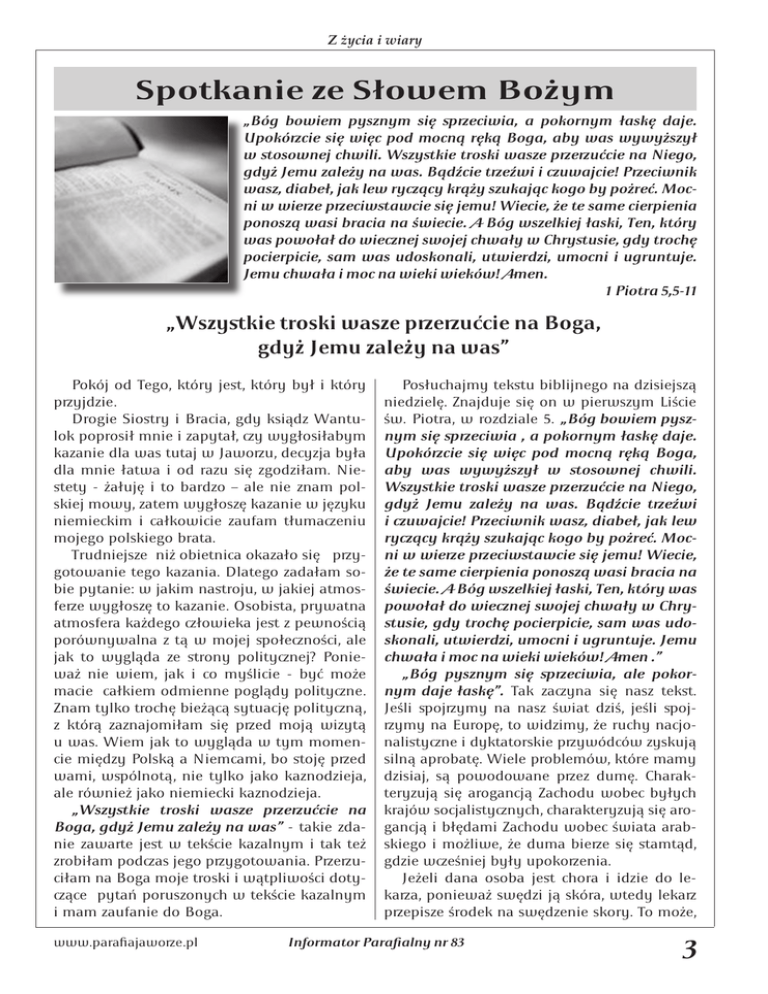 Z życia i wiary Spotkanie ze Słowem Bożym „Bóg bowiem pysznym się eciwia, a pokornym łaskę daje. Upokócie się więc pod mocną ręką Boga, aby was wywyższył w stosownej chwili. Wszystkie troski wasze peućcie na Niego, gdyż Jemu zależy na was. Bądźcie teźwi i uwajcie! Peciwnik wasz, diabeł, jak lew ryący krąży szukając kogo by pożreć. Mocni w wiee peciwstawcie się jemu! Wiecie, że te same cierpienia ponoszą wasi bracia na świecie. A Bóg wszelkiej łaski, Ten, który was powołał do wienej swojej chwały w Chrystusie, gdy trochę pocierpicie, sam was udoskonali, utwierdzi, umocni i ugruntuje. Jemu chwała i moc na wieki wieków! Amen. 1 Piotra 5,5-11 „Wszystkie troski wasze peućcie na Boga, gdyż Jemu zależy na was” Pokój od Tego, który jest, który był i który pyjdzie. Drogie Siostry i Bracia, gdy ksiądz Wantulok poprosił mnie i zapytał, y wygłosiłabym kazanie dla was tutaj w Jawou, decyzja była dla mnie łatwa i od razu się zgodziłam. Niestety - żałuję i to bardzo – ale nie znam polskiej mowy, zatem wygłoszę kazanie w języku niemieckim i całkowicie zaufam tłumaeniu mojego polskiego brata. Trudniejsze niż obietnica okazało się pygotowanie tego kazania. Dlatego zadałam sobie pytanie: w jakim nastroju, w jakiej atmosfee wygłoszę to kazanie. Osobista, prywatna atmosfera każdego łowieka jest z pewnością porównywalna z tą w mojej ołeności, ale jak to wygląda ze strony politynej? Ponieważ nie wiem, jak i co myślicie - być może macie całkiem odmienne poglądy polityne. Znam tylko trochę bieżącą sytuację polityną, z którą zaznajomiłam się ped moją wizytą u was. Wiem jak to wygląda w tym momencie między Polską a Niemcami, bo stoję ped wami, wólnotą, nie tylko jako kaznodzieja, ale również jako niemiecki kaznodzieja. „Wszystkie troski wasze peućcie na Boga, gdyż Jemu zależy na was” - takie zdanie zawae jest w tekście kazalnym i tak też zrobiłam podas jego pygotowania. Peuciłam na Boga moje troski i wątpliwości dotyące pytań poruszonych w tekście kazalnym i mam zaufanie do Boga. www.parafiajawoe.pl Posłuchajmy tekstu biblijnego na dzisiejszą niedzielę. Znajduje się on w pierwszym Liście św. Piotra, w rozdziale 5. „Bóg bowiem pysznym się eciwia , a pokornym łaskę daje. Upokócie się więc pod mocną ręką Boga, aby was wywyższył w stosownej chwili. Wszystkie troski wasze peućcie na Niego, gdyż Jemu zależy na was. Bądźcie teźwi i uwajcie! Peciwnik wasz, diabeł, jak lew ryący krąży szukając kogo by pożreć. Mocni w wiee peciwstawcie się jemu! Wiecie, że te same cierpienia ponoszą wasi bracia na świecie. A Bóg wszelkiej łaski, Ten, który was powołał do wienej swojej chwały w Chrystusie, gdy trochę pocierpicie, sam was udoskonali, utwierdzi, umocni i ugruntuje. Jemu chwała i moc na wieki wieków! Amen .” „Bóg pysznym się eciwia, ale pokornym daje łaskę”. Tak zayna się nasz tekst. Jeśli ojymy na nasz świat dziś, jeśli ojymy na Europę, to widzimy, że ruchy nacjonalistyne i dyktatorskie pywódców zyskują silną aprobatę. Wiele problemów, które mamy dzisiaj, są powodowane pez dumę. Charakteryzują się arogancją Zachodu wobec byłych krajów socjalistynych, charakteryzują się arogancją i błędami Zachodu wobec świata arabskiego i możliwe, że duma biee się stamtąd, gdzie weśniej były upokoenia. Jeżeli dana osoba jest chora i idzie do lekaa, ponieważ swędzi ją skóra, wtedy leka pepisze środek na swędzenie skory. To może, Informator Paraalny nr 83 3 Z życia i wiary ale nie musi pomóc, ponieważ swędzenie ludzkiej skóry może być tylko objawem zupełnie innego problemu: a mianowicie, że dusza łowieka jest chora. Tylko uzdrowiciel, który paty na całego łowieka i rozpozna prawdziwą pyynę ludzkiego cierpienia, będzie w stanie leyć tych ludzi. Tak samo jest z naszymi problemami ołenymi. Jeśli utkwimy wzrok tylko na objawach a nie na pyynach, wtedy nie będziemy mogli na zawsze wyeliminować wojny i terroru. Widzimy, ile terroru i pemocy jest w Europie i słusznie się go obawiamy. Weśniej amerykańscy żołniee i żołniee z innych krajów zachodnich również nie pynieśli błogosławieństwa, ale wyądzili wiele szkód narodowi irackiemu, irackich żołniey tourowano i zabito wielu cywilów, w tym wiele dzieci. To cheścijański, amerykański prezydent był odpowiedzialny za to zło. To nie urawiedliwia pojedynego ataku terrorystynego, ale nie rozwiąże również problemów, kiedy będziemy zacierać te ey w naszej pamięci i tylko po jednej stronie szukać winnego. Rodziny irackie nie usuwają tych womnień z pamięci. Jeżeli oskarżamy tylko jedną stronę, problemy staną się większe i głębsze. „Wszystkie troski wasze peućcie na Boga, gdyż Jemu zależy na was”. Tak jest powiedziane w ytanym tekście. To jest takie proste do wypowiedzenia, ale tak trudne do wdrożenia. Kościół, o którym pisze św. Piotr, jest zagrożony. Życie jest zagrożone. Jest to jedno z wielu peśladowań cheścijan w Cesarstwie Rzymskim, na które narażona jest ta ołeność. Jak w takiej sytuacji wziąć i peucić wszystkie troski na Boga i mieć na- 4 dzieję, że on się o to zatroszy. Albowiem Bóg nie ocalił wszystkich, wielu z cheścijan padło ofiarą peśladowań. Jak mogę, jak możemy peucić wszystkie obawy na Boga, kiedy jesteśmy w potebie? Co zrobić, jeśli mam poważne problemy ze zdrowiem lub problemy finansowe i te problemy są dla mnie obciążeniem, a ja po prostu nie wiem, jak mam postępować? „Wszystkie troski peućcie na Niego, Jemu zależy na Was”. Pozwól odejść temu, ego nie umiesz rozwiązać. Modlić się, prosić Boga, mieć w nim ufność, tak, może to jest właśnie dobra droga. Weź z jego ręki to, co jest ci peznaone – nawet jeżeli może się okazać inaej niż sobie żyyłeś (wyobrażałeś). Życie w stałej ufności w Bogu - szególnie w asach niepokoju i tr
