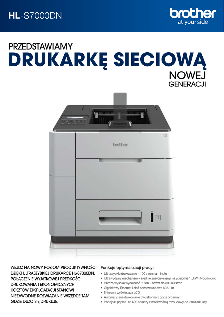 HL-S7000DN PRZEDSTAWIAMY DRUKARKĘ SIECIOWĄ NOWEJ GENERACJI WEJDŹ NA NOWY POZIOM PRODUKTYWNOŚCI DZIĘKI ULTRASZYBKIEJ DRUKARCE HL-S7000DN. POŁĄCZENIE WYJĄTKOWEJ PRĘDKOŚCI DRUKOWANIA I EKONOMICZNYCH KOSZTÓW EKSPLOATACJI STANOWI NIEZAWODNE ROZWIĄZANIE WSZĘDZIE TAM, GDZIE DUŻO SIĘ DRUKUJE. Funkcje optymalizacji pracy: • Ultraszybkie drukowanie – 100 stron na minutę • Ultrawydajny mechanizm – średnie zużycie energii na poziomie 1.5kWh tygodniowo • Bardzo wysoka wydajność tuszu – nawet do 30 000 stron • Gigabitowy Ethernet i sieć bezprzewodowa 802.11n • 5-liniowy wyświetlacz LCD • Automatyczne drukowanie dwustronne z opcją broszury • Podajniki papieru na 600 arkuszy z możliwością rozbudowy do 2100 arkuszy OPIS PRODUKTU BEZPROBLEMOWA INTEGRACJA Z TWOJĄ FIRMĄ Dzięki wykorzystaniu najnowocześniejszych technologii, urządzenie HL-S7000DN posiada szereg intuicyjnych funkcji, zapewniających bezproblemową integrację nawet w najbardziej wymagających środowiskach biznesowych. HL-S7000DN jest drukarką sieciową nowej generacji, zapewniającą wysoką prędkość druku, solidność i niezawodność. Ultraszybki, ultrawydajny mechanizm pozwala osiągnąć niezrównany poziom produktywności. 1.Intuicyjny, 5-liniowy wyświetlacz LCD z klawiaturą numeryczną 2. Wbudowany automatyczny druk dwustronny z funkcją broszury WYDAJNOŚĆ NA POZIOMIE BIZNESOWYM: Drukarka HL-S7000DN zapewnia przełomową prędkość drukowania – nawet 100 stron na minutę, a pierwsza strona gotowa jest w czasie 8,5 sekundy. Potężny procesor 800MHZ w połączeniu z 2 GB wewnętrznej pamięci czyni drukowanie dużych ilości dokumentów łatwym i bezproblemowym. Obsługa gigabitowej sieci LAN umożliwia zdalne wysyłanie nawet bardzo złożonych dokumentów przez wiele osób jednocześnie, bez żadnych kompromisów. 3. Powiadomienia wyświetlane w technologii LED 4. Wielofunkcyjny podajnik na 100 arkuszy do drukowania na grubszym papierze i kopertach 5. Łatwy dostęp do podajnika 6. Gigabitowy Ethernet (sieć przewodowa) 7. Bezprzewodowy Ethernet 802.11n 8. Opcjonalny odbiornik na 500 arkuszy papieru 9. Opcjonalne podajniki na 500 arkuszy papieru (maksymalnie 2100 arkuszy) 8 10. Opcjonalna podstawa stabilizująca 11. Pamięć wewnętrzna 2 GB 12. Wysokowydajny tuszu pozwalający na wydruk 30 000 stron 1 WYDAJNOŚĆ I OSZCZĘDNOŚĆ: Dzięki zastosowaniu rewolucyjnej technologii, urządzenie HL-S7000DN charakteryzuje się tygodniowym zużyciem energii na poziomie zaledwie 1,5 kWh, co sprawia, że jest do 60%* bardziej wydajne niż porównywalne drukarki laserowe, jeśli chodzi o realne zmniejszenie zużycia energii oraz emisji CO2. Szereg ekonomicznych rozwiązań, takich jak drukowanie dwustronne czy tryb oszczędzania tuszu, pomaga zmniejszyć zużycie zarówno papieru, jak i tuszu, redukując tym samym negatywny wpływ na środowisko. 3 12 2 5 4 11 7 6 10 9 SOLIDNOŚĆ I NIEZAWODNOŚĆ: Przy zalecanym miesięcznym obciążeniu rzędu 20 000 stron, drukarka HL-S7000DN jest w stanie sprostać wymaganiom środowisk, w których dużo się drukuje. Maksymalną pojemność urządzenia można rozszerzyć do 2100 kartek – dzięki montażowi do trzech opcjonalnych pojemników. Model można także uzupełnić o opcjonalny odbiornik na wydruki, oferujący pojemność 500 arkuszy. HL-S7000DN może więc rosnąć razem z Twoją firmą. * Według dostępnych wartości dla Energy Star. Rzeczywiste zużycie może się różnić od szacunkowego. Zużycie energii w porównaniu z konkurencyjnymi drukarkami laserowymi 60ppm. EFEKTYWNE ROZWIĄZANIA WYSOKA JAKOŚĆ DRUKU: Wysoką jakość druku HL-S7000DN zapewnia proces nanoszenia na papier specjalnego podkładu. Oznacza to, że każda litera drukowana jest z niezwykłą dokładnością i w wysokiej rozdzielczości. Raporty, prezentacje i faktury drukowane są w oparciu o najwyższe standardy. Drukarka HL-S7000DN jest kompatybilna z wieloma rozwiązaniami, co zapewnia jej bezproblemową integrację z funkcjonującymi w firmie systemami. BROTHER SOLUTIONS INTERFACE (BSI) Otwarty interfejs umożliwia producentom oprogramowania tworzenie zindywidualizowanych rozwiązań z zakresu zarządzania drukowaniem dla wybranych urządzeń Brother. Wykorzystana została tu technologia sieci Web. Wszelkie rozwiązania są przechowywane i uruchamiane z poziomu serwera, nie zaś lokalnie, co umożliwia ich łatwe przesłanie do wielu różnych urządzeń. Dodatkowo można kontrolować również dostęp poszczególnych użytkowników do różnych funkcji danego urządzenia. EFEKTYWNOŚĆ KOSZTÓW: Wysokowydajny pojemnik z tuszem HL-S7000DN pozwala na wydrukowanie nawet 30 000 stron, co przynosi Twojej firmie znaczące oszczędności. Pojemnik z tuszem znajduje się z przodu urządzenia, dlatego jego wymiana zajmuje tylko chwilę, co pozwala zredukować do minimum przestoje w pracy urządzenia. b-guard BEZPIECZEŃSTWO NA POZIOMIE BIZNESOWYM: Kluczowe informacje dotyczące Twojej firmy pozostaną bezpieczne dzięki szyfrowaniu SSL, które zapewnia maksymalne bezpieczeństwo danych przesyłanych do drukarki z komputera. Funkcja bezpiecznego drukowania pozwala na przechowywanie dokumentów do druku w pamięci urządzenia. Wydruk następuje wyłącznie po wpisaniu na klawiaturze numerycznej czterocyfrowego kodu PIN. ZARZĄDZANIE SPRZĘTEM W dzisiejszym środowisku biznesowym czas sprawności urządzenia jest kluczowy, dlatego też HL-S7000DN posiada liczne rozwiązania, stworzone w celu utrzymania produktywności w Twojej firmie: • Zarządzanie przez Internet – zarządzaj • BRAdmin Proffesional – narzędzie do zdalnego i konfiguruj swoje urządzenie HL-S7000DN, monitorowania i konfiguracji drukarek w różnych łącząc się z nim bezpośrednio przez lokalizacjach. Umożliwia zdalne diagnozowanie wyszukiwarkę. problemów, a także ustawienie automatycznych powiadomień mailowych, informujących o czasie • Centralna instalacja – pozwala na instalację 