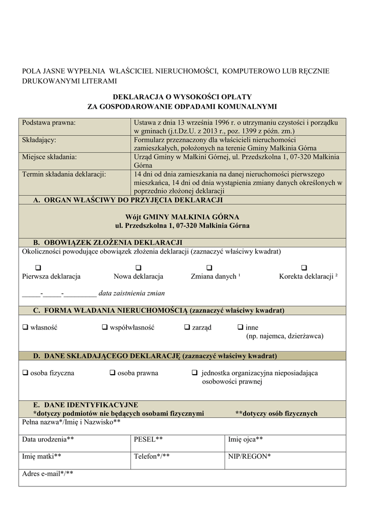 POLA JASNE WYPEŁNIA WŁAŚCICIEL NIERUCHOMOŚCI, KOMPUTEROWO LUB RĘCZNIE DRUKOWANYMI LITERAMI DEKLARACJA O WYSOKOŚCI OPŁATY ZA GOSPODAROWANIE ODPADAMI KOMUNALNYMI Ustawa z dnia 13 września 1996 r. o utrzymaniu czystości i porządku w gminach (j.t.Dz.U. z 2013 r., poz. 1399 z późn. zm.) Składający: Formularz przeznaczony dla właścicieli nieruchomości zamieszkałych, położonych na terenie Gminy Małkinia Górna Miejsce składania: Urząd Gminy w Małkini Górnej, ul. Przedszkolna 1, 07-320 Małkinia Górna Termin składania deklaracji: 14 dni od dnia zamieszkania na danej nieruchomości pierwszego mieszkańca, 14 dni od dnia wystąpienia zmiany danych określonych w poprzednio złożonej deklaracji A. ORGAN WŁAŚCIWY DO PRZYJĘCIA DEKLARACJI Podstawa prawna: Wójt GMINY MAŁKINIA GÓRNA ul. Przedszkolna 1, 07-320 Małkinia Górna B. OBOWIĄZEK ZŁOŻENIA DEKLARACJI Okoliczności powodujące obowiązek złożenia deklaracji (zaznaczyć właściwy kwadrat) Pierwsza deklaracja Nowa deklaracja Zmiana danych ¹ Korekta deklaracji ² _____-_____-_________ data zaistnienia zmian C. FORMA WŁADANIA NIERUCHOMOŚCIĄ (zaznaczyć właściwy kwadrat) własność współwłasność zarząd inne (np. najemca, dzierżawca) D. DANE SKŁADAJĄCEGO DEKLARACJĘ (zaznaczyć właściwy kwadrat) osoba fizyczna osoba prawna jednostka organizacyjna nieposiadająca osobowości prawnej E. DANE IDENTYFIKACYJNE *dotyczy podmiotów nie będących osobami fizycznymi Pełna nazwa*/Imię i Nazwisko** **dotyczy osób fizycznych Data urodzenia** PESEL** Imię ojca** Imię matki** Telefon*/** NIP/REGON* Adres e-mail*/** NR RACHUNKU BANKOWEGO WSKAZANEGO DO ZWROTU NADPŁATY ³ ………………………………………………………………………………………………………………… ………………………………………………………………. F. 1. ADRES/SIEDZIBA SKŁADAJĄCEGO DEKLARACJĘ KRAJ WOJEWÓDZTWO POWIAT GMINA ULICA NR DOMU/LOKALU MIEJSCOWOŚĆ KOD POCZTOWY POCZTA ____-_______ F. 2. ADRES DO KORESPONDENCJI (WYPEŁNIAMY JEŚLI INNY NIŻ W PUNKCIE 1) KRAJ WOJEWÓDZTWO POWIAT GMINA ULICA NR DOMU/LOKALU MIEJSCOWOŚĆ KOD POCZTOWY POCZTA ____-_______ F. 3.DANE MAŁŻONKA (ODPOWIEDZIALNEGO MAJĄTKIEM WSPÓLNYM) ADRES/SIEDZIBA Imię i Nazwisko Data urodzenia PESEL Imię ojca Imię matki Telefon Adres e-mail Kraj Województwo Powiat Gmina Ulica Nr domu/lokalu Miejscowość Kod pocztowy Poczta ____-______ G. ADRES NIERUCHOMOŚCI, Z KTÓREJ BĘDĄ ODBIERANE ODPADY KOMUNALNE MIEJSCOWOŚĆ ULICA NR DOMU/LOKALU H. WYSOKOŚĆ OPŁATY ZA GOSPODAROWANIE ODPADAMI KOMUNALNYMI Oświadczam, że na terenie nieruchomości w części G niniejszej deklaracji zamieszkuje: ……………………………………………..osób (należy podać liczbę mieszkańców) WYLICZENIE MIESIĘCZNEJ OPŁATY ZA GROMADZENIE ODPADÓW W SPOSÓB SELEKTYWNY ………………………………… x 6,00 zł = …………………………………………………… (liczba mieszkańców) (stawka opłaty) ( wysokość opłaty miesięcznej) Słownie złotych:……………………………………………………………………………………………… WYLICZENIE KWARTALNEJ OPŁATY ZA GROMADZENIE ODPADÓW W SPOSÓB SELEKTYWNY …………………………………x 3 (m-ce) = ………………………………………………… (wysokość opłaty miesięcznej) ( wysokość opłaty kwartalnej) WYLICZENIE MIESIĘCZNEJ OPŁATY ZA GROMADZENIE ODPADÓW W SPOSÓB NIESELEKTYWNY ……………………………… x 12,00 zł = …………………………………………………… (liczba mieszkańców) (stawka opłaty) ( wysokość opłaty miesięcznej) Słownie złotych:……………………………………………………………………………………………… WYLICZENIE KWARTALNEJ OPŁATY ZA GROMADZENIE ODPADÓW W SPOSÓB NIESELEKTYWNY …………………………………x 3 (m-ce) = ………………………………………………… (wysokość opłaty miesięcznej) ( wysokość opłaty kwartalnej) I. PODPIS SKŁADAJĄCEGO(YCH) DEKLARACJĘ Data Czytelny podpis Pouczenie W przypadku nie wpłacenia w określonych terminach kwoty wynikającej z deklaracji lub wpłaconej w jej niepełnej wysokości, niniejsza deklaracja stanowi podstawę do wystawienia tytułu wykonawczego, zgodnie z przepisami Ustawy z dnia 17 czerwca 1966 r. o postępowaniu egzekucyjnym w administracji (Dz.U. z 2014 r., poz.1619 z późn. zm.). W przypadku prowadzenia w części lokalu mieszkalnego obsługi biurowej działalności gospodarczej opłatę za gospodarowanie odpadami komunalnymi uiszcza się w ramach opłaty dotyczącej nieruchomości, od właścicieli nieruchomości, na których zamieszkują mieszkańcy. J. ADNOTACJE ORGANU Objaśnienia: ¹ - dotyczy zmian deklaracji określonych w art.6m ust.2 ustawy o utrzymaniu czystości i porządku w gminach (Dz.U. z 2013r. ,poz.1399 z późn. zm.). ² - zgodnie z art.81 ustawy z dnia 29 sierpnia 1997r. Ordynacji podatkowej (Dz. U. z 2015r. poz.613) wraz z korektą deklaracji niezbędne jest złożenie pisemnego uzasadnienia przyczyny korekty. ³ - podanie rachunku bankowego jest dobrowolne.