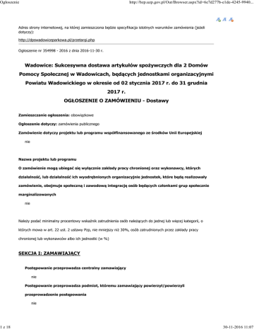 Ogłoszenie http://bzp.uzp.gov.pl/Out/Browser.aspx?id=6e7d277b-e1de-4245-9940... Adres strony internetowej, na której zamieszczona będzie specyfikacja istotnych warunków zamówienia (jeżeli dotyczy): http://dpswadowiceparkowa.pl/przetargi.php Ogłoszenie nr 354998 - 2016 z dnia 2016-11-30 r. Wadowice: Sukcesywna dostawa artykułów spożywczych dla 2 Domów Pomocy Społecznej w Wadowicach, będących jednostkami organizacyjnymi Powiatu Wadowickiego w okresie od 02 stycznia 2017 r. do 31 grudnia 2017 r. OGŁOSZENIE O ZAMÓWIENIU - Dostawy Zamieszczanie ogłoszenia: obowiązkowe Ogłoszenie dotyczy: zamówienia publicznego Zamówienie dotyczy projektu lub programu współfinansowanego ze środków Unii Europejskiej nie Nazwa projektu lub programu O zamówienie mogą ubiegać się wyłącznie zakłady pracy chronionej oraz wykonawcy, których działalność, lub działalność ich wyodrębnionych organizacyjnie jednostek, które będą realizowały zamówienie, obejmuje społeczną i zawodową integrację osób będących członkami grup społecznie marginalizowanych nie Należy podać minimalny procentowy wskaźnik zatrudnienia osób należących do jednej lub więcej kategorii, o których mowa w art. 22 ust. 2 ustawy Pzp, nie mniejszy niż 30%, osób zatrudnionych przez zakłady pracy chronionej lub wykonawców albo ich jednostki (w %) SEKCJA I: ZAMAWIAJĄCY Postępowanie przeprowadza centralny zamawiający nie Postępowanie przeprowadza podmiot, któremu zamawiający powierzył/powierzyli przeprowadzenie postępowania nie 1 z 18 30-11-2016 11:07 Ogłoszenie 2 z 18 http://bzp.uzp.gov.pl/Out/Browser.aspx?id=6e7d277b-e1de-4245-9940... Informacje na temat podmiotu któremu zamawiający powierzył/powierzyli prowadzenie postępowania: Postępowanie jest przeprowadzane wspólnie przez zamawiających tak Jeżeli tak, należy wymienić zamawiających, którzy wspólnie przeprowadzają postępowanie oraz podać adresy ich siedzib, krajowe numery identyfikacyjne oraz osoby do kontaktów wraz z danymi do kontaktów: Dom Pomocy Społecznej, 34-100Wadowice, ul. Parkowa 1, REGON 7050180085907, osoba do kontaktów: Szcześniewski Krzysztof - Dyr. DPS, tel. 503 026 415, Dom Pomocy Społecznej im. Św. O. Rafała Kalinowskiego, 34-100 Wadowice, ul. Pułaskiego 5, REGON 002405439, osoba do kontaktów Tyrpa Jarosław - Dyr. DPS, tel. 33 8731300 Postępowanie jest przeprowadzane wspólnie z zamawiającymi z innych państw członkowskich Unii Europejskiej nie W przypadku przeprowadzania postępowania wspólnie z zamawiającymi z innych państw członkowskich Unii Europejskiej – mające zastosowanie krajowe prawo zamówień publicznych: Informacje dodatkowe: I. 1) NAZWA I ADRES: Dom Pomocy Społecznej, krajowy numer identyfikacyjny 7050180085907, ul. ul. Parkowa 1, 34100 Wadowice, woj. małopolskie, państwo Polska, tel. 338 731 920, e-mail [email protected], faks . Adres strony internetowej (URL): http://dpswadowiceparkowa.pl/przetargi.php I. 2) RODZAJ ZAMAWIAJĄCEGO: Jednostki organizacyjne administracji samorządowej I.3) WSPÓLNE UDZIELANIE ZAMÓWIENIA (jeżeli dotyczy): Podział obowiązków między zamawiającymi w przypadku wspólnego przeprowadzania postępowania, w tym w przypadku wspólnego przeprowadzania postępowania z zamawiającymi z innych państw członkowskich Unii Europejskiej (który z zamawiających jest odpowiedzialny za przeprowadzenie postępowania, czy i w jakim zakresie za przeprowadzenie postępowania odpowiadają pozostali zamawiający, czy zamówienie będzie udzielane przez każdego z zamawiających indywidualnie, czy zamówienie zostanie udzielone w imieniu i na rzecz pozostałych zamawiających): 1. Strony porozumienia postanawiają wspólnie przygotować postępowanie o udzielenie zamówienia publicznego w trybie przetargu nieograniczonego, którego przedmiotem jest dostawa artykułów spożywczych do siedziby obiektów Stron tj. do: a) Dom Pomocy Społecznej, Wadowice ul. Parkowa 1, b) Dom Pomocy Społecznej im. św. O. R. Kalinowskiego, Wadowice ul. Pułaskiego 5. 2. Ostateczna wartość 30-11-2016 11:07 Ogłoszenie 3 z 18 http://bzp.uzp.gov.pl/Out/Browser.aspx?id=6e7d277b-e1de-4245-9940... zamówienia zostanie określona po wyborze najkorzystniejszej oferty i zawarciu umów z wykonawcami wyłonionymi w postępowaniu, o którym mowa w p. 1. 3. Kwota, którą na podstawie art. 86 ust. 3 ustawy Prawo zamówień publicznych zamawiający ma obowiązek podać bezpośrednio przed otwarciem ofert, stanowić będzie całkowitą kwotę, jaką Strony zamierzają przeznaczyć na sfinansowanie zamówienia. 4. Strony zobowiązują się ponieść koszty wynikające z udzielenia zamówienia na dostawę artykułów spożywczych do obiektu każdej ze Stron wskazanego w ust. 1. 5. Każda ze Stron zobowiązuje się zabezpieczyć środki finansowe w wysokości wskazanej dla niej w p. 3, niezbędne do pokrycia przypadającej na nią, zgodnie z Porozumieniem części zobowiązania, w wysokości wynikającej z zawartej w wyniku rozstrzygnięcia postępowania umów na dostawę artykułów spożywczych. 6. Postępowanie, o którym mowa w p. 1 zostanie przeprowadzone w wyniku przetargu nieograniczonego zgodnie z przepisami ustawy Prawo zamówień publicznych. 7. Strony wyznaczają spośród siebie Dyrektora Domu Pomocy Społecznej w Wadowicach, ul. Parkowa 1, jako Zamawiającego upoważnionego do przeprowadzenia postępowania o udzielenie zamówienia w imieniu Stron i na ich rzecz. 8. Dyrektor Dom Pomocy w Wadowicach, ul. Parkowa 1 jako Zamawiający upoważniony jest do przeprowadzenia postępowania o udzielenie zamówienia publicznego, o którym mowa w p. 1 I.4) KOMUNIKACJA: Nieograniczony, pełny i bezpośredni dostęp do dokumentów z postępowania można uzyskać pod adresem (URL) tak http://dpswadowiceparkowa.pl/przetargi.php Adres strony internetowej, na której zamieszczona będzie specyfikacja istotnych warunków zamówienia tak http://dpswadowiceparkowa.pl/przetargi.php Dostęp do doku