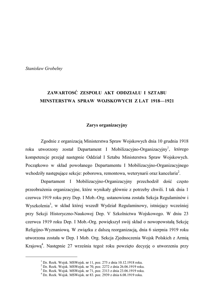 Stanisław Grobelny ZAWARTOSĆ ZESPOŁU AKT ODDZIAŁU I SZTABU MINSTERSTWA SPRAW WOJSKOWYCH Z LAT 1918—1921 Zarys organizacyjny Zgodnie z organizacją Ministerstwa Spraw Wojskowych dnia 10 grudnia 1918 roku utworzony został Departament I Mobilizacyjno-Organizacyjny1, którego kompetencje przejął następnie Oddział I Sztabu Ministerstwa Spraw Wojskowych. Początkowo w skład powołanego Departamentu I Mobilizacyjno-Organizacyjnego wchodziły następujące sekcje: poborowa, remontowa, weterynarii oraz kancelaria2. Departament I Mobilizacyjno-Organizacyjny przechodził dość często przeobrażenia organizacyjne, które wynikały głównie z potrzeby chwili. I tak dnia 1 czerwca 1919 roku przy Dep. I Mob.-Org. ustanowiona została Sekcja Regulaminów i Wyszkolenia3, w skład której wszedł Wydział Regulaminowy, istniejący wcześniej przy Sekcji Historyczno-Naukowej Dep. V Szkolnictwa Wojskowego. W dniu 23 czerwca 1919 roku Dep. I Mob.-Org. powiększył swój skład o nowopowstałą Sekcję Religijno-Wyznaniową. W związku z dalszą reorganizacją, dnia 6 sierpnia 1919 roku utworzona została w Dep. I Mob. Org. Sekcja Zjednoczenia Wojsk Polskich z Armią Krajową4. Następnie 27 września tegoż roku powzięto decyzję o utworzeniu przy 1 Dz. Rozk. Wojsk. MSWojsk. nr 11, poz. 275 z dnia 10.12.1918 roku. Dz. Rozk. Wojsk. MSWojsk. nr 70, poz. 2272 z dnia 26.06.1919 roku. 3 Dz. Rozk. Wojsk. MSWojsk. nr 71, poz. 2313 z dnia 23.06.1919 roku. 4 Dz. Rozk. Wojsk. MSWojsk. nr 83. poz. 2939 z dnia 6.08.1919 roku. 2 Sekcji Poboru i Uzupełnień — Wydziału Likwidacyjnego byłej armii gen. Hallera, którego zadaniem było załatwianie — w okresie przejściowym — wszelkich spraw personalnych jej podoficerów i żołnierzy5. 1 marca 1920 roku Dep. I Mob. Org. przeszedł następną reorganizację, w wyniku której utworzony został Oddział I Sztabu Ministerstwa Spraw Wojskowych. W jego skład weszły następujące Sekcje: organizacyjna, mobilizacyjna, poboru i uzupełnień oraz komisja traktatowa6. Natomiast Sekcja Regulaminów i Wyszkolenia byłego Dep. I Mob. Org. weszła — jako Sekcja I — w skład Oddziału III NaukowoSzkolnego Sztabu MSWojsk., zaś Sekcja Religijno-Wyznaniowa utworzyła samodzielną Sekcję Wyznań Obcych7. Z dniem 15 kwietnia 1920 roku utworzony został przy Oddziała I Sztabu MSWojsk. Komitet Techniczny dla spraw dyslokacji, do którego obowiązków należało przeprowadzenie jednolitego planu w pracach budownictwa wojskowego8. 26 czerwca 1920 roku w Sekcji Mob. Oddziału I Sztabu MSWojsk. powstał Wydział Dyslokacyjny9. Dnia 23 lipca 1920 roku utworzony został w Sekcji Poboru i Uzupełnień Oddziału I Sztabu MSWojsk. Wydział Odwoławczy, którego zadaniem było: opracowanie przepisów i instrukcji ustalających sposób podawania skarg na decyzje władz poborowych oraz rozstrzyganie w ostatecznej instancji skarg apelacyjnych10. Dnia 2 stycznia 1921 roku w Oddziale I Sztabu MSWojsk. powstała Sekcja Jeńców, w skład której weszły: dawna Sekcja Jeńców Ekspozytury Oddziału IV Sztabu MSWojsk., Wydział Jeńców oraz Centralne Biuro Rejestracji Jeńców Sekcji Mobilizacyjnej Oddziału I Sztabu MSWojsk.11. W wyniku reorganizacji Ministerstwa Spraw Wojskowych, w dniu 22 sierpnia 1921 roku Sekcje Organizacyjną i Mobilizacyjną Oddziału I Sztabu MSWojsk. wcielono do Oddziału I Sztabu Generalnego, a Sekcję Poboru i Uzupełnień włączono w skład Departamentu X Spraw Poboru MSWojsk.12. 5 Dz. Rozk. MSWojsk. nr 12 T, poz.133 z dnia 25.10.1919 roku. Rozkaz Dep. I Mob. Org. nr 1792/Org. CAW, Gab. Min., t. 968. 7 Tamże. 8 Dz. Rozk. MSWojsk. nr 14, poz.340 z dnia 14.05.1920 roku. 9 Dod. Tjn. do Rozk. Dz. nr 146, poz.11 z dnia 26.06.1920 roku. 10 Dod. Tjn. do Rozk. Dz. nr 167, poz. 3 z dnia 23.07.1920 roku. 11 Rozk. Dzienny Oddz. I Sztabu MSWojsk. nr 11, poz. 2 z dnia 18.01.1981 roku. 12 Rozkaz Oddz. I Sztabu Gen. nr 4900 z dnia 22.08.1921 roku (pokojowa organizacja MSWojsk.) CAW, Gab. Min., t. 966. 6 Charakterystyka zawartości aktowej Materiały archiwalne omawianego zespołu pochodzą z lat 1918—1921 i stanowią zespół prosty zamknięty, zawierający 280 jednostek archiwalnych (około 8,5 mb). Akta prowadzone były w strukturze według systemu kancelarii austriackiej. Stan fizyczny akt jest dobry. Natomiast stopień zachowania ilości wytworu kancelaryjnego jest trudny do określenia, z uwagi na brak pomocy kancelaryjnych. Z zespołu wybrakowano dokumentację archiwalną o charakterze manipulacyjny oraz trzecie i dalsze egzemplarze materiałów powielanych, występujących w większej ilości. W czasie opracowywania zespołu aktom nadano układ według struktury organizacyjnej. Ilość zachowanych akt przedstawia się następująco: Sekcja Organizacyjna 90 j.a. Sekcja Mobilizacyjna 28 j.a. Sekcja Poboru i Uzupełnień 138 j.a. Sekcja Regulaminów i Wyszkolenia 16 j.a. Sekcja Religijno-Wyznaniowa 2 j.a. Sekcja Zjednoczenia WP 1 j.a. Sekcja Jeńców 1 j.a. Kancelaria 4 j.a. * Archiwalia należące do Sekcji O r g a n i z a c y j n e j dotyczą następujących zagadnień: dziedziny organizacji władz wojskowych i cywilnych, organizacji broni i służb oraz personalnych. Z ciekawych akt mówiących o organizacji wojska oraz sytuacji politycznej wymienić należy: Ordre de Bataille Wojska Polskiego (t. 2); Ordre de Bataille i rozkazy dzienne Departamentu I Mob. Org. (t. 1, 3 i 4); Ordre de Bataille i szkice dyslokacyjne jednostek w DOGen. Kraków, Lublin, Kielce i Poznań (t. 5, 6, 7); tymczasowy plan dyslokacji (t. 8), a także zestawienia oddziałów i dowództw powstałych z armii gen. Hallera przy jej zjednoczeniu z armią Krajową (t. 23, 24). Do interesujących akt należą również komunikaty operacyjne Naczelnego Dowództwa WP z okresu od 17.05. — 31.12.1919 roku (t. 9) oraz meldunki sytuacyjne i polityczne ilustrujące sytuację wewnętrzną w kraju (t. 11, 14—19). Następną grupę akt Sekcji Organizacyjnej stanowiących o organizacji centralnych