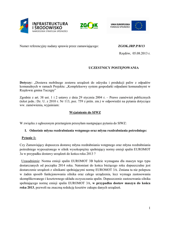 Numer referencyjny nadany sprawie przez zamawiającego: ZGOK.JRP.P/8/13 Rzędów, 05.08.2013 r. UCZESTNICY POSTĘPOWANIA Dotyczy: „Dostawa mobilnego zestawu urządzeń do odzysku i produkcji paliw z odpadów komunalnych w ramach Projektu: „Kompleksowy system gospodarki odpadami komunalnymi w Rzędowie gmina Tuczępy” Zgodnie z art. 38 ust. 1 i 2 ustawy z dnia 29 stycznia 2004 r. – Prawo zamówień publicznych (tekst jedn.: Dz. U. z 2010 r. Nr 113, poz. 759 z późn. zm.) w odpowiedzi na pytania dotyczące ww. zamówienia, wyjaśniam: Wyjaśnienie do SIWZ W związku z ogłoszonym przetargiem przesyłam następujące pytania do SIWZ: I. Odnośnie młyna rozdrabniania wstępnego oraz młyna rozdrabniania pośredniego: Pytanie 1: Czy Zamawiający dopuszcza dostawę młyna rozdrabniania wstępnego oraz młyna rozdrabniania pośredniego wyposażonego w silnik wysokoprężny spełniający normy emisji spalin EUROMOT 3a w przypadku dostawy urządzeń do końca roku 2013 ? Uzasadnienie: Norma emisji spalin EUROMOT 3B będzie wymagana dla maszyn tego typu dostarczanych od początku 2014 roku. Natomiast do końca bieżącego roku dopuszczalne jest dostarczenie urządzeń z silnikami spełniającymi normę EUROMOT 3A. Zmiana ta nie polepsza w żaden sposób funkcjonowania silnika oraz całego urządzenia, lecz wymaga zastosowania skomplikowanego i kosztownego układu oczyszczania spalin. Dopuszczenie zastosowania silnika spełniającego normę emisji spalin EUROMOT 3A, w przypadku dostaw maszyn do końca roku 2013, pozwoli na znaczną redukcję kosztów zakupu danych urządzeń. 1 Odpowiedź Norma emisji spalin młyna rozdrabniania wstępnego oraz młyna pośredniego powinna być zgodna z zapisem OPZ - Część III SIWZ II. Odnośnie hal poligonalnych Pytanie 2. W części III SIWZ – OPZ widnieje warunek: „Linia technologiczna wraz z halą poligonalną – 1 i niezbędnymi elementami logistyki winny zmieścić się na placu z wylewką betonową o powierzchni 43 x 53 m, w sposób umożliwiający wykorzystanie pozostałej jego części jako placu do gotowego kompostu. Położenie Hali poligonalnej – 2 zostanie wskazane przez Zamawiającego w momencie realizacji dostaw” Według wymagań Zamawiającego hala poligonalna musi posiadać wymiary 75 x 30 m nie jest zatem możliwe umieszczenie owej hali w całości na placu o powierzchni 43 x 53 m. Bardzo prosimy o wyjaśnienie tej rozbieżności. Odpowiedź Wymiary hali poligonalnej – 1 powinny być zgodne z OPZ – Część III SIWZ. Wykonawca dostarczy i zamontuje halę poligonalną - 1 na wskazanym przez Zamawiającego placu z wylewką betonową o wymiarach dostosowanych do tego placu. Pozostałe moduły dostarczonej hali mogą być zamontowane w późniejszym terminie, jeżeli do czasu realizacji dostawy Zamawiający nie przygotuje i utwardzi dodatkowego placu. ZATWIERDZAM: PREZES ZARZĄDU CZŁONEK ZARZĄDU Robert Stachowicz Paweł Łodej Dnia: 05.08.2013 r. 2
