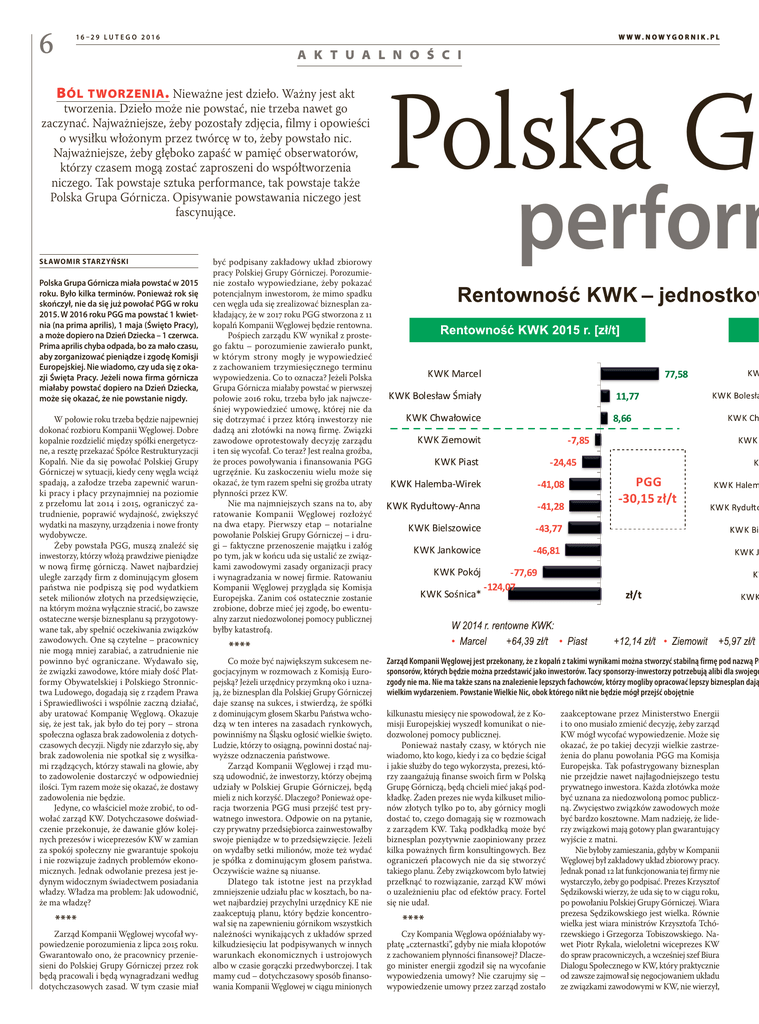 6 W W W.NOW YGORNIK.PL 16 –29 L U T E G O 2016 A K T U A L N O Ś C I B ól tworzenia . Nieważne jest dzieło. Ważny jest akt tworzenia. Dzieło może nie powstać, nie trzeba nawet go zaczynać. Najważniejsze, żeby pozostały zdjęcia, filmy i opowieści o wysiłku włożonym przez twórcę w to, żeby powstało nic. Najważniejsze, żeby głęboko zapaść w pamięć obserwatorów, którzy czasem mogą zostać zaproszeni do współtworzenia niczego. Tak powstaje sztuka performance, tak powstaje także Polska Grupa Górnicza. Opisywanie powstawania niczego jest fascynujące. SŁAWOMIR STARZYŃSKI Polska Grupa Górnicza miała powstać w 2015 roku. Było kilka terminów. Ponieważ rok się skończył, nie da się już powołać PGG w roku 2015. W 2016 roku PGG ma powstać 1 kwietnia (na prima aprilis), 1 maja (Święto Pracy), a może dopiero na Dzień Dziecka – 1 czerwca. Prima aprilis chyba odpada, bo za mało czasu, aby zorganizować pieniądze i zgodę Komisji Europejskiej. Nie wiadomo, czy uda się z okazji Święta Pracy. Jeżeli nowa firma górnicza miałaby powstać dopiero na Dzień Dziecka, może się okazać, że nie powstanie nigdy. W połowie roku trzeba będzie najpewniej dokonać rozbioru Kompanii Węglowej. Dobre kopalnie rozdzielić między spółki energetyczne, a resztę przekazać Spółce Restrukturyzacji Kopalń. Nie da się powołać Polskiej Grupy Górniczej w sytuacji, kiedy ceny węgla wciąż spadają, a załodze trzeba zapewnić warunki pracy i płacy przynajmniej na poziomie z przełomu lat 2014 i 2015, ograniczyć zatrudnienie, poprawić wydajność, zwiększyć wydatki na maszyny, urządzenia i nowe fronty wydobywcze. Żeby powstała PGG, muszą znaleźć się inwestorzy, którzy włożą prawdziwe pieniądze w nową firmę górniczą. Nawet najbardziej uległe zarządy firm z dominującym głosem państwa nie podpiszą się pod wydatkiem setek milionów złotych na przedsięwzięcie, na którym można wyłącznie stracić, bo zawsze ostateczne wersje biznesplanu są przygotowywane tak, aby spełnić oczekiwania związków zawodowych. One są czytelne – pracownicy nie mogą mniej zarabiać, a zatrudnienie nie powinno być ograniczane. Wydawało się, że związki zawodowe, które miały dość Platformy Obywatelskiej i Polskiego Stronnictwa Ludowego, dogadają się z rządem Prawa i Sprawiedliwości i wspólnie zaczną działać, aby uratować Kompanię Węglową. Okazuje się, że jest tak, jak było do tej pory – strona społeczna ogłasza brak zadowolenia z dotychczasowych decyzji. Nigdy nie zdarzyło się, aby brak zadowolenia nie spotkał się z wysiłkami rządzących, którzy stawali na głowie, aby to zadowolenie dostarczyć w odpowiedniej ilości. Tym razem może się okazać, że dostawy zadowolenia nie będzie. Jedyne, co właściciel może zrobić, to odwołać zarząd KW. Dotychczasowe doświadczenie przekonuje, że dawanie głów kolejnych prezesów i wiceprezesów KW w zamian za spokój społeczny nie gwarantuje spokoju i nie rozwiązuje żadnych problemów ekonomicznych. Jednak odwołanie prezesa jest jedynym widocznym świadectwem posiadania władzy. Władza ma problem: Jak udowodnić, że ma władzę? **** Zarząd Kompanii Węglowej wycofał wypowiedzenie porozumienia z lipca 2015 roku. Gwarantowało ono, że pracownicy przeniesieni do Polskiej Grupy Górniczej przez rok będą pracowali i będą wynagradzani według dotychczasowych zasad. W tym czasie miał Polska Gr perform być podpisany zakładowy układ zbiorowy pracy Polskiej Grupy Górniczej. Porozumienie zostało wypowiedziane, żeby pokazać potencjalnym inwestorom, że mimo spadku cen węgla uda się zrealizować biznesplan zakładający, że w 2017 roku PGG stworzona z 11 kopalń Kompanii Węglowej będzie rentowna. Pośpiech zarządu KW wynikał z prostego faktu – porozumienie zawierało punkt, w którym strony mogły je wypowiedzieć z zachowaniem trzymiesięcznego terminu wypowiedzenia. Co to oznacza? Jeżeli Polska Grupa Górnicza miałaby powstać w pierwszej połowie 2016 roku, trzeba było jak najwcześniej wypowiedzieć umowę, której nie da się dotrzymać i przez którą inwestorzy nie dadzą ani złotówki na nową firmę. Związki zawodowe oprotestowały decyzję zarządu i ten się wycofał. Co teraz? Jest realna groźba, że proces powoływania i finansowania PGG ugrzęźnie. Ku zaskoczeniu wielu może się okazać, że tym razem spełni się groźba utraty płynności przez KW. Nie ma najmniejszych szans na to, aby ratowanie Kompanii Węglowej rozłożyć na dwa etapy. Pierwszy etap – notarialne powołanie Polskiej Grupy Górniczej – i drugi – faktyczne przenoszenie majątku i załóg po tym, jak w końcu uda się ustalić ze związkami zawodowymi zasady organizacji pracy i wynagradzania w nowej firmie. Ratowaniu Kompanii Węglowej przygląda się Komisja Europejska. Zanim coś ostatecznie zostanie zrobione, dobrze mieć jej zgodę, bo ewentualny zarzut niedozwolonej pomocy publicznej byłby katastrofą. **** Co może być największym sukcesem negocjacyjnym w rozmowach z Komisją Europejską? Jeżeli urzędnicy przymkną oko i uznają, że biznesplan dla Polskiej Grupy Górniczej daje szansę na sukces, i stwierdzą, że spółki z dominującym głosem Skarbu Państwa wchodzą w ten interes na zasadach rynkowych, powinniśmy na Śląsku ogłosić wielkie święto. Ludzie, którzy to osiągną, powinni dostać najwyższe odznaczenia państwowe. Zarząd Kompanii Węglowej i rząd muszą udowodnić, że inwestorzy, którzy obejmą udziały w Polskiej Grupie Górniczej, będą mieli z nich korzyść. Dlaczego? Ponieważ operacja tworzenia PGG musi przejść test prywatnego inwestora. Odpowie on na pytanie, czy prywatny przedsiębiorca zainwestowałby swoje pieniądze w to przedsięwzięcie. Jeżeli on wydałby setki milionów, może też wydać je spółka z dominującym głosem państwa. Oczywiście ważne są niuanse. Dlatego tak istotne jest n