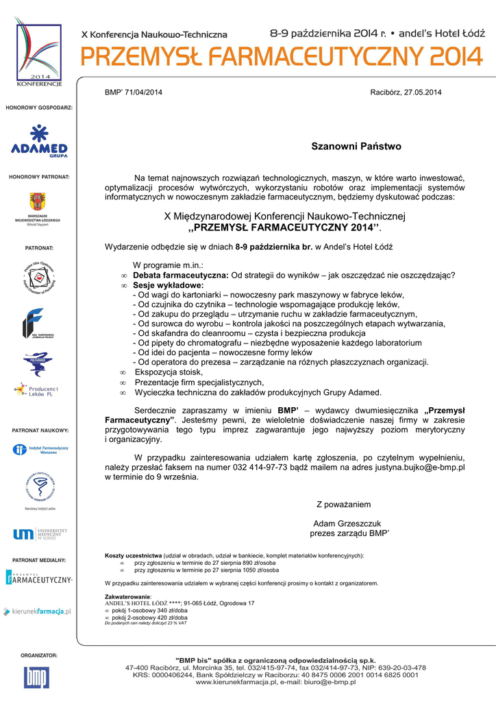 Racibórz, 27.05.2014 BMP’ 71/04/2014 Szanowni Państwo Na temat najnowszych rozwiązań technologicznych, maszyn, w które warto inwestować, optymalizacji procesów wytwórczych, wykorzystaniu robotów oraz implementacji systemów informatycznych w nowoczesnym zakładzie farmaceutycznym, będziemy dyskutować podczas: X Międzynarodowej Konferencji Naukowo-Technicznej ,,PRZEMYSŁ FARMACEUTYCZNY 2014’’. Wydarzenie odbędzie się w dniach 8-9 października br. w Andel’s Hotel Łódź W programie m.in.: • Debata farmaceutyczna: Od strategii do wyników – jak oszczędzać nie oszczędzając? • Sesje wykładowe: - Od wagi do kartoniarki – nowoczesny park maszynowy w fabryce leków, - Od czujnika do czytnika – technologie wspomagające produkcję leków, - Od zakupu do przeglądu – utrzymanie ruchu w zakładzie farmaceutycznym, - Od surowca do wyrobu – kontrola jakości na poszczególnych etapach wytwarzania, - Od skafandra do cleanroomu – czysta i bezpieczna produkcja - Od pipety do chromatografu – niezbędne wyposażenie każdego laboratorium - Od idei do pacjenta – nowoczesne formy leków - Od operatora do prezesa – zarządzanie na różnych płaszczyznach organizacji. • Ekspozycja stoisk, • Prezentacje firm specjalistycznych, • Wycieczka techniczna do zakładów produkcyjnych Grupy Adamed. Serdecznie zapraszamy w imieniu BMP’ – wydawcy dwumiesięcznika „Przemysł Farmaceutyczny”. Jesteśmy pewni, że wieloletnie doświadczenie naszej firmy w zakresie przygotowywania tego typu imprez zagwarantuje jego najwyższy poziom merytoryczny i organizacyjny. W przypadku zainteresowania udziałem kartę zgłoszenia, po czytelnym wypełnieniu, należy przesłać faksem na numer 032 414-97-73 bądź mailem na adres [email protected] w terminie do 9 września. Z poważaniem Adam Grzeszczuk prezes zarządu BMP’ Koszty uczestnictwa (udział w obradach, udział w bankiecie, komplet materiałów konferencyjnych): • przy zgłoszeniu w terminie do 27 sierpnia 890 zł/osoba • przy zgłoszeniu w terminie po 27 sierpnia 1050 zł/osoba W przypadku zainteresowania udziałem w wybranej części konferencji prosimy o kontakt z organizatorem. Zakwaterowanie: ANDEL’S HOTEL ŁÓDŹ ****; 91-065 Łódź, Ogrodowa 17 • pokój 1-osobowy 340 zł/doba • pokój 2-osobowy 420 zł/doba Do podanych cen należy doliczyć 23 % VAT ................................................ ............................................. (miejscowość i data) (pieczęć firmy) ZZ G G ŁŁ O O SS ZZ EE N N II EE U UC C ZZ EE SS TT N N II C C TT W WA A Zgłaszamy udział przedstawicieli naszej firmy w konferencji „Przemysł Farmaceutyczny 2014”: Liczba uczestniczących osób……………………… ……………………………………………. …… (imię i nazwisko - drukowanymi literami) ............................................................... (stanowisko) ..................................................... (adres e-mail) ……………………………………………. …… (imię i nazwisko - drukowanymi literami) ............................................................... (stanowisko) ..................................................... (adres e-mail) ……………………………………………. …… (imię i nazwisko - drukowanymi literami) ............................................................... (stanowisko) ..................................................... (adres e-mail) ……………………………………………. …… (imię i nazwisko - drukowanymi literami) ............................................................... (stanowisko) ..................................................... (adres e-mail) ……………………………………………. …… (imię i nazwisko - drukowanymi literami) ............................................................... (stanowisko) ..................................................... (adres e-mail) Rezerwujemy miejsce noclegowe (decyduje kolejność zgłoszeń, doba hotelowa zgodnie z regulaminem hotelu) 8.10 / 9.10. 2014 ................ (*) * zaznacz, dla ilu osób nocleg pok. 1-os. pok. 2-os. właściwe zakreślić Wycieczka techniczna do zakładu produkcyjnego □ tak □ nie Dodatkowe dane osoba kontaktowa: ....................................................................................... numer tel...................................................... kontaktowy adres e-mail ............................................................................. ...................nr faksu:.................................... (Na powyższy adres e-mail zostanie wysłane potwierdzenie uczestnictwa oraz pro forma, na podstawie której należy dokonać płatności.) NIP PŁATNIKA : ............................................. Niniejszym wyrażamy zgodę na wystawienie faktury VAT bez naszego podpisu. UWAGI:.......................................................................................................................................................................... ................................................. (pieczęć firmy) Wypełnione zgłoszenie uczestnictwa należy przesłać faksem lub mailem. * Oświadczamy, iż zapoznaliśmy się z regulaminem sympozjum/konferencji firmy „BMP bis” Spółka z ograniczoną odpowiedzialnością Sp. k. (regulamin jest dostępny na stronie: www.kierunekfarmacja.pl) ** Na podstawie art. 23 ust. 1 pkt 1 ustawy z dn. 29.08.1997 r. o ochronie danych osobowych (Dz. U. z 2002 r. Nr 101, poz. 926 z późn. zm.) oraz w związku z zapisami zawartymi w regulaminie sympozjum, wyrażam zgodę na przetwarzanie moich danych osobowych zawartych w karcie uczestnictwa złożonej organizatorowi w celach jak w ww. regulaminie. ORGANIZATOR: „BMP bis”Spółka z ograniczoną odpowiedzialnością Sp. k., 47-400 Racibórz, ul. Morcinka 35, NIP: 639-20-03-478 Kontakt: Justyna Bujko,tel. 32/ 415 97 74 w.41; fax 32 414 97 73 e-mail: [em