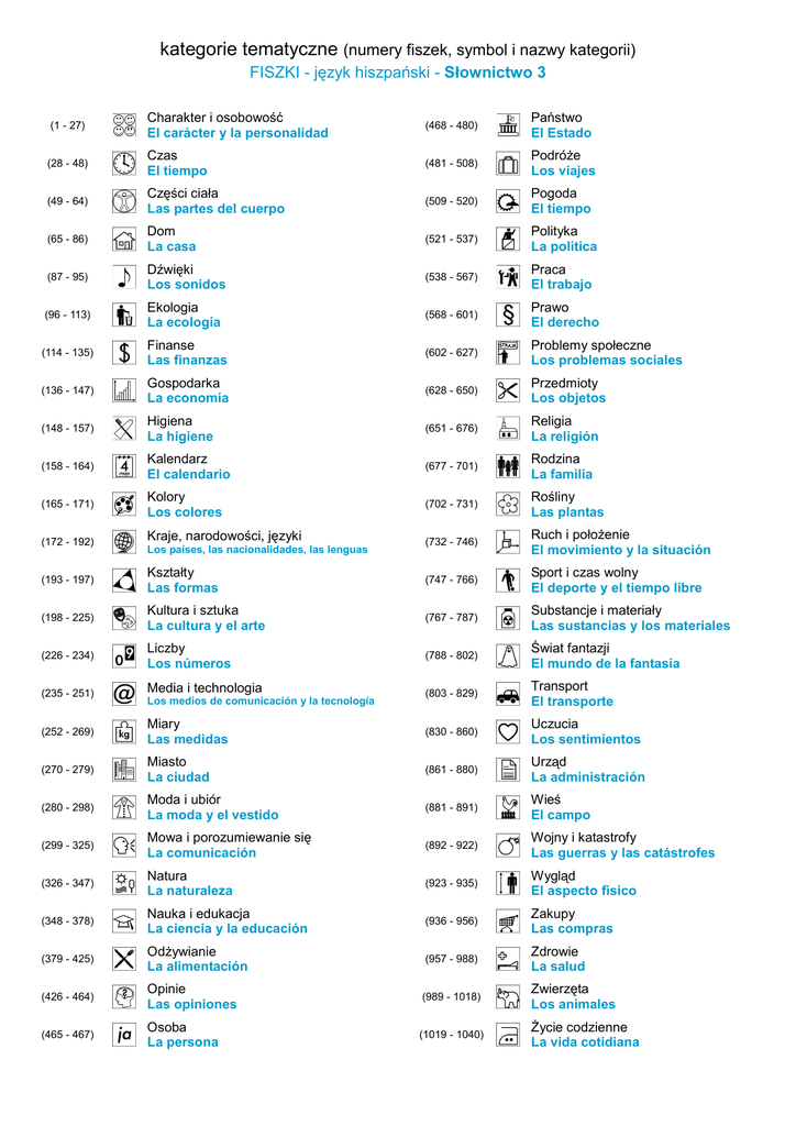 kategorie tematyczne (numery fiszek, symbol i nazwy kategorii) FISZKI - język hiszpański - Słownictwo 3 (1 - 27) Charakter i osobowość El carácter y la personalidad (468 - 480) Państwo El Estado (28 - 48) Czas El tiempo (481 - 508) Podróże Los viajes (49 - 64) Części ciała Las partes del cuerpo (509 - 520) Pogoda El tiempo (65 - 86) Dom La casa (521 - 537) Polityka La política (87 - 95) Dźwięki Los sonidos (538 - 567) Praca El trabajo (96 - 113) Ekologia La ecología (568 - 601) Prawo El derecho (114 - 135) Finanse Las finanzas (602 - 627) Problemy społeczne Los problemas sociales (136 - 147) Gospodarka La economía (628 - 650) Przedmioty Los objetos (148 - 157) Higiena La higiene (651 - 676) Religia La religión (158 - 164) Kalendarz El calendario (677 - 701) Rodzina La familia (165 - 171) Kolory Los colores (702 - 731) Rośliny Las plantas (732 - 746) Ruch i położenie El movimiento y la situación (172 - 192) Kraje, narodowości, języki Los países, las nacionalidades, las lenguas (193 - 197) Kształty Las formas (747 - 766) Sport i czas wolny El deporte y el tiempo libre (198 - 225) Kultura i sztuka La cultura y el arte (767 - 787) Substancje i materiały Las sustancias y los materiales (226 - 234) Liczby Los números (788 - 802) Świat fantazji El mundo de la fantasía (803 - 829) Transport El transporte (235 - 251) Media i technologia Los medios de comunicación y la tecnología (252 - 269) Miary Las medidas (830 - 860) Uczucia Los sentimientos (270 - 279) Miasto La ciudad (861 - 880) Urząd La administración (280 - 298) Moda i ubiór La moda y el vestido (881 - 891) Wieś El campo (299 - 325) Mowa i porozumiewanie się La comunicación (892 - 922) Wojny i katastrofy Las guerras y las catástrofes (326 - 347) Natura La naturaleza (923 - 935) Wygląd El aspecto físico (348 - 378) Nauka i edukacja La ciencia y la educación (936 - 956) Zakupy Las compras (379 - 425) Odżywianie La alimentación (957 - 988) Zdrowie La salud (426 - 464) Opinie Las opiniones (989 - 1018) Zwierzęta Los animales (465 - 467) Osoba La persona (1019 - 1040) Życie codzienne La vida cotidiana