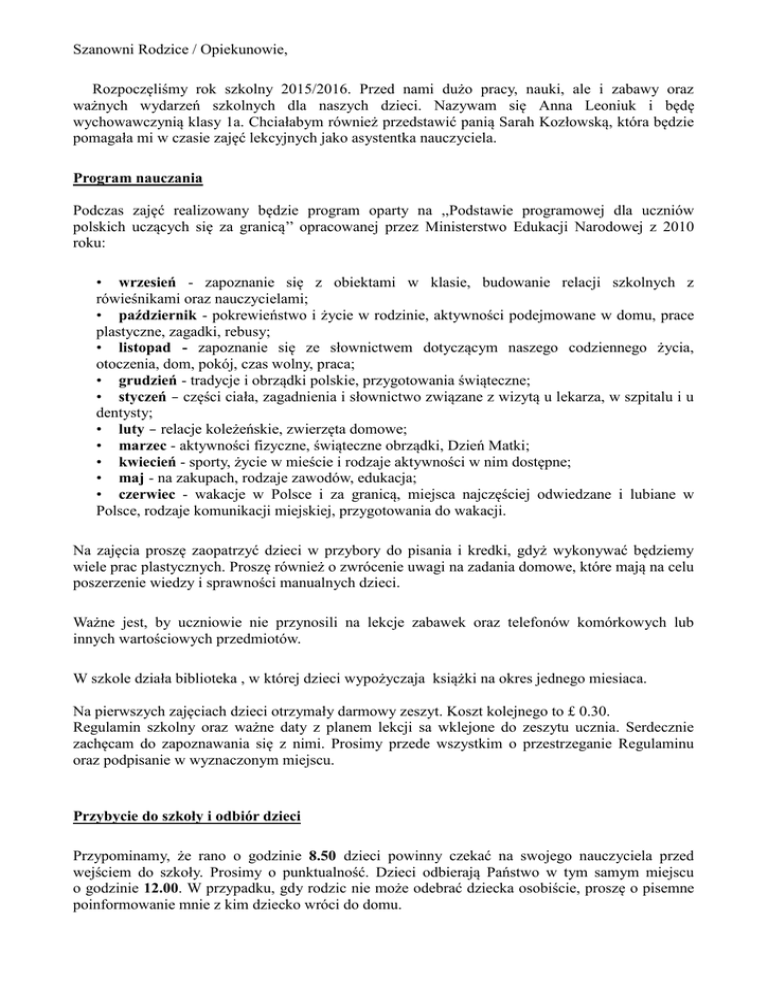 Szanowni Rodzice / Opiekunowie, Rozpoczęliśmy rok szkolny 2015/2016. Przed nami dużo pracy, nauki, ale i zabawy oraz ważnych wydarzeń szkolnych dla naszych dzieci. Nazywam się Anna Leoniuk i będę wychowawczynią klasy 1a. Chciałabym również przedstawić panią Sarah Kozłowską, która będzie pomagała mi w czasie zajęć lekcyjnych jako asystentka nauczyciela. Program nauczania Podczas zajęć realizowany będzie program oparty na ,,Podstawie programowej dla uczniów polskich uczących się za granicą’’ opracowanej przez Ministerstwo Edukacji Narodowej z 2010 roku: • wrzesień - zapoznanie się z obiektami w klasie, budowanie relacji szkolnych z rówieśnikami oraz nauczycielami; • październik - pokrewieństwo i życie w rodzinie, aktywności podejmowane w domu, prace plastyczne, zagadki, rebusy; • listopad - zapoznanie się ze słownictwem dotyczącym naszego codziennego życia, otoczenia, dom, pokój, czas wolny, praca; • grudzień - tradycje i obrządki polskie, przygotowania świąteczne; • styczeń – części ciała, zagadnienia i słownictwo związane z wizytą u lekarza, w szpitalu i u dentysty; • luty – relacje koleżeńskie, zwierzęta domowe; • marzec - aktywności fizyczne, świąteczne obrządki, Dzień Matki; • kwiecień - sporty, życie w mieście i rodzaje aktywności w nim dostępne; • maj - na zakupach, rodzaje zawodów, edukacja; • czerwiec - wakacje w Polsce i za granicą, miejsca najczęściej odwiedzane i lubiane w Polsce, rodzaje komunikacji miejskiej, przygotowania do wakacji. Na zajęcia proszę zaopatrzyć dzieci w przybory do pisania i kredki, gdyż wykonywać będziemy wiele prac plastycznych. Proszę również o zwrócenie uwagi na zadania domowe, które mają na celu poszerzenie wiedzy i sprawności manualnych dzieci. Ważne jest, by uczniowie nie przynosili na lekcje zabawek oraz telefonów komórkowych lub innych wartościowych przedmiotów. W szkole działa biblioteka , w której dzieci wypożyczaja książki na okres jednego miesiaca. Na pierwszych zajęciach dzieci otrzymały darmowy zeszyt. Koszt kolejnego to £ 0.30. Regulamin szkolny oraz ważne daty z planem lekcji sa wklejone do zeszytu ucznia. Serdecznie zachęcam do zapoznawania się z nimi. Prosimy przede wszystkim o przestrzeganie Regulaminu oraz podpisanie w wyznaczonym miejscu. Przybycie do szkoły i odbiór dzieci Przypominamy, że rano o godzinie 8.50 dzieci powinny czekać na swojego nauczyciela przed wejściem do szkoły. Prosimy o punktualność. Dzieci odbierają Państwo w tym samym miejscu o godzinie 12.00. W przypadku, gdy rodzic nie może odebrać dziecka osobiście, proszę o pisemne poinformowanie mnie z kim dziecko wróci do domu. Przerwa i sklepik W szkole działa sklepik, w którym w czasie przerwy możliwy jest zakup napojów i słodyczy oraz małych przekąsek. Proszę nie dawać dzieciom do szkoły dużych śniadań, ponieważ przerwa na jedzenie trwa tylko 20 minut. Prosimy pamietac o kurtkach, bluzach tak aby dzieci mogły w tym czasie przebywać na dworze. Dane osobowe Ze względu na bezpieczeństwo dzieci szkoła musi posiadać aktualne dane dziecka i rodziców. Jakiekolwiek zmiany w danych osobowych prosimy przekazać pisemnie do sekretariatu szkoły. Zajęcia pozalekcyjne W godzinach od 12:00 do 13:00 odbywać się będą zajęcia pozalekcyjne. Wszystkie istotne informacje, również o zajęciach pozalekcyjnych, dostępne sa na stronie internetowej naszej szkoły: www.polishschoolnottingham.co.uk Zachęcamy do polubienia naszej strony na Facebook. Jeśli mają Państwo pytania lub wątpliwości chętnie udzielę odpowiedzi po lekcjach. Z poważaniem, Anna Leoniuk Sarah Kozłowska