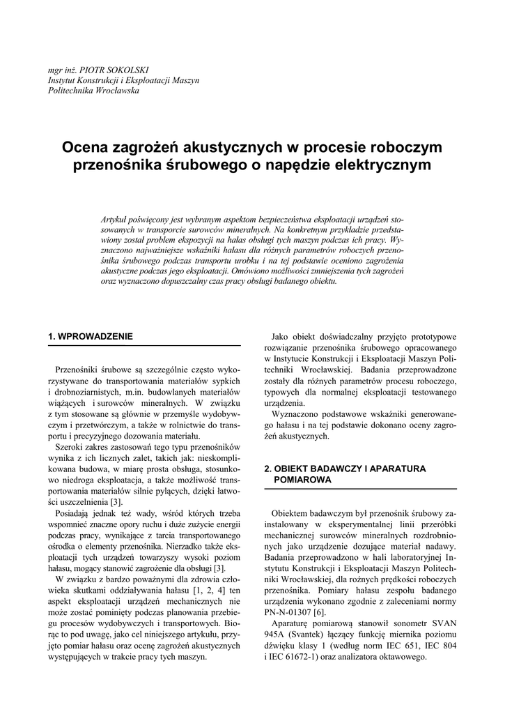 mgr inż. PIOTR SOKOLSKI Instytut Konstrukcji i Eksploatacji Maszyn Politechnika Wrocławska Ocena zagrożeń akustycznych w procesie roboczym przenośnika śrubowego o napędzie elektrycznym Artykuł poświęcony jest wybranym aspektom bezpieczeństwa eksploatacji urządzeń stosowanych w transporcie surowców mineralnych. Na konkretnym przykładzie przedstawiony został problem ekspozycji na hałas obsługi tych maszyn podczas ich pracy. Wyznaczono najważniejsze wskaźniki hałasu dla różnych parametrów roboczych przenośnika śrubowego podczas transportu urobku i na tej podstawie oceniono zagrożenia akustyczne podczas jego eksploatacji. Omówiono możliwości zmniejszenia tych zagrożeń oraz wyznaczono dopuszczalny czas pracy obsługi badanego obiektu. 1. WPROWADZENIE Przenośniki śrubowe są szczególnie często wykorzystywane do transportowania materiałów sypkich i drobnoziarnistych, m.in. budowlanych materiałów wiążących i surowców mineralnych. W związku z tym stosowane są głównie w przemyśle wydobywczym i przetwórczym, a także w rolnictwie do transportu i precyzyjnego dozowania materiału. Szeroki zakres zastosowań tego typu przenośników wynika z ich licznych zalet, takich jak: nieskomplikowana budowa, w miarę prosta obsługa, stosunkowo niedroga eksploatacja, a także możliwość transportowania materiałów silnie pylących, dzięki łatwości uszczelnienia [3]. Posiadają jednak też wady, wśród których trzeba wspomnieć znaczne opory ruchu i duże zużycie energii podczas pracy, wynikające z tarcia transportowanego ośrodka o elementy przenośnika. Nierzadko także eksploatacji tych urządzeń towarzyszy wysoki poziom hałasu, mogący stanowić zagrożenie dla obsługi [3]. W związku z bardzo poważnymi dla zdrowia człowieka skutkami oddziaływania hałasu [1, 2, 4] ten aspekt eksploatacji urządzeń mechanicznych nie może zostać pominięty podczas planowania przebiegu procesów wydobywczych i transportowych. Biorąc to pod uwagę, jako cel niniejszego artykułu, przyjęto pomiar hałasu oraz ocenę zagrożeń akustycznych występujących w trakcie pracy tych maszyn. Jako obiekt doświadczalny przyjęto prototypowe rozwiązanie przenośnika śrubowego opracowanego w Instytucie Konstrukcji i Eksploatacji Maszyn Politechniki Wrocławskiej. Badania przeprowadzone zostały dla różnych parametrów procesu roboczego, typowych dla normalnej eksploatacji testowanego urządzenia. Wyznaczono podstawowe wskaźniki generowanego hałasu i na tej podstawie dokonano oceny zagrożeń akustycznych. 2. OBIEKT BADAWCZY I APARATURA POMIAROWA Obiektem badawczym był przenośnik śrubowy zainstalowany w eksperymentalnej linii przeróbki mechanicznej surowców mineralnych rozdrobnionych jako urządzenie dozujące materiał nadawy. Badania przeprowadzono w hali laboratoryjnej Instytutu Konstrukcji i Eksploatacji Maszyn Politechniki Wrocławskiej, dla rożnych prędkości roboczych przenośnika. Pomiary hałasu zespołu badanego urządzenia wykonano zgodnie z zaleceniami normy PN-N-01307 [6]. Aparaturę pomiarową stanowił sonometr SVAN 945A (Svantek) łączący funkcję miernika poziomu dźwięku klasy 1 (według norm IEC 651, IEC 804 i IEC 61672-1) oraz analizatora oktawowego. 86 MECHANIZACJA I AUTOMATYZACJA GÓRNICTWA Punkty pomiaru hałasu wyznaczono w czterech miejscach rozmieszczonych wokół przenośnika w odległości 1 m od powierzchni zewnętrznej jego obudowy (punkty pomiarowe 1-12) oraz bezpośrednio w miejscu nadawy materiału do komory roboczej – punkt 13 (rys. 1). Pomiary 1-4 wykonywane były podczas pracy przenośnika z największą prędkością, badania 5-8 ze średnią wartością prędkości, natomiast pomiary 9-12 odpowiadały najmniejszej prędkości pracy. W dalszej części artykułu przyjęto następujące oznaczenia: punkt A – miejsce przeprowadzenia pomiarów 1, 5 i 9; punkt B – miejsce przeprowadzenia pomiarów 2, 6 i 10; punkt C – miejsce przeprowadzenia pomiarów 3, 7 i 11; punkt D – miejsce przeprowadzenia pomiarów 4, 8 i 12; punkt E – miejsce przeprowadzenia pomiaru 13. 3. WYNIKI BADAŃ HAŁASU Rys. 1. Lokalizacja punktów pomiaru hałasu przenośnika śrubowego W toku badań rejestrowano przebiegi czasowe ciśnienia akustycznego oraz wyznaczano m.in. wartości równoważne poziomu dźwięku LAeq (skorygowane według charakterystyki zgodnej z krzywą korekcyjną A) i wartości szczytowe Peak. Przed przystąpieniem do właściwych badań hałasu przenośnika zmierzono poziom tła akustycznego w hali laboratoryjnej przy wyłączonych wszystkich urządzeniach. Następnie – dla zakresu prędkości roboczej ślimaka n=22,5 56,0 obr/min – mierzono m.in. ogólny poziom ciśnienia akustycznego oraz wyznaczano widma hałasu w pasmach oktawowych. Przykładowe wyniki pomiarów przedstawiono na rys. 2-3. Z badań wynika, że najwyższy poziom hałasu występuje przy maksymalnej prędkości roboczej przenośnika nmax=56,0 obr/min. W punktach pomiarowych 1-4 ekwiwalentny poziom ciśnienia akustycznego (dla 8– godzinnego czasu ekspozycji) osiąga wartości rzędu LAeq(max) =85 88 dB, natomiast w punkcie nadawy do komory roboczej przenośnika poziom emisji hałasu wynosił LAeq(max) =93 95 dB. Oszacowany na tej podstawie dopuszczalny czas ekspozycji na hałas pracowników obsługi wynosi Lexp=45 minut. Dla porównania, podczas pracy z najmniejszą prędkością nmin=22,0 obr/min ekwiwalentny poziom ciśnienia akustycznego dla 8-godzinnej ekspozycji wynosił LAeq(max) =78 82 dB. W dalszej kolejności wyznaczono widma oktawowe hałasu w każdym z punktów pomiarowych. Przykładowe wyniki badań dla największych prędkości roboczych przenośnika (pomiary 2 i 13) przedstawione zostały na rysunku 4-5. Na obu wykresach naniesiona została krzywa N80, wyznaczająca dopuszczalne amplitudy hałasu dla kolejnych częstotliwości, wynikające z zaleceń normowych. W przypadku pomiaru 2 (rys. 4) zauważyć można, że w zakresie częstotl