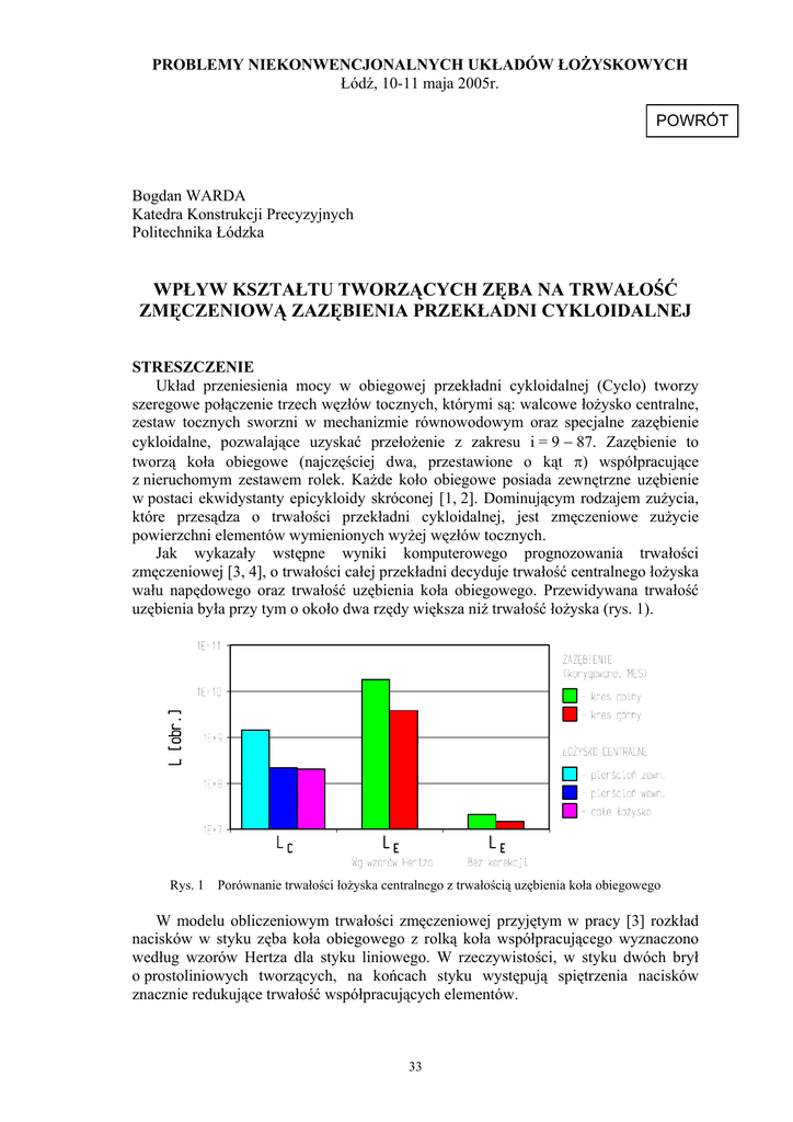 PROBLEMY NIEKONWENCJONALNYCH UKŁADÓW ŁOŻYSKOWYCH Łódź, 10-11 maja 2005r. POWRÓT Bogdan WARDA Katedra Konstrukcji Precyzyjnych Politechnika Łódzka WPŁYW KSZTAŁTU TWORZĄCYCH ZĘBA NA TRWAŁOŚĆ ZMĘCZENIOWĄ ZAZĘBIENIA PRZEKŁADNI CYKLOIDALNEJ STRESZCZENIE Układ przeniesienia mocy w obiegowej przekładni cykloidalnej (Cyclo) tworzy szeregowe połączenie trzech węzłów tocznych, którymi są: walcowe łożysko centralne, zestaw tocznych sworzni w mechanizmie równowodowym oraz specjalne zazębienie cykloidalne, pozwalające uzyskać przełożenie z zakresu i = 9 − 87. Zazębienie to tworzą koła obiegowe (najczęściej dwa, przestawione o kąt π) współpracujące z nieruchomym zestawem rolek. Każde koło obiegowe posiada zewnętrzne uzębienie w postaci ekwidystanty epicykloidy skróconej [1, 2]. Dominującym rodzajem zużycia, które przesądza o trwałości przekładni cykloidalnej, jest zmęczeniowe zużycie powierzchni elementów wymienionych wyżej węzłów tocznych. Jak wykazały wstępne wyniki komputerowego prognozowania trwałości zmęczeniowej [3, 4], o trwałości całej przekładni decyduje trwałość centralnego łożyska wału napędowego oraz trwałość uzębienia koła obiegowego. Przewidywana trwałość uzębienia była przy tym o około dwa rzędy większa niż trwałość łożyska (rys. 1). Rys. 1 Porównanie trwałości łożyska centralnego z trwałością uzębienia koła obiegowego W modelu obliczeniowym trwałości zmęczeniowej przyjętym w pracy [3] rozkład nacisków w styku zęba koła obiegowego z rolką koła współpracującego wyznaczono według wzorów Hertza dla styku liniowego. W rzeczywistości, w styku dwóch brył o prostoliniowych tworzących, na końcach styku występują spiętrzenia nacisków znacznie redukujące trwałość współpracujących elementów. 33 W celu zbadania wpływu kształtu tworzących zęba na trwałość uzębienia koła obiegowego przekładni cykloidalnej opracowano nowy model przewidywania trwałości zmęczeniowej, pozwalający na uwzględnienie lokalnych zmian w trójwymiarowym rozkładzie naprężeń pod powierzchnią styku, wynikających ze złożonego profilu współpracujących powierzchni. W oparciu o powyższy model przygotowano program komputerowy ZCYCLO służący do prognozowania trwałości zmęczeniowej uzębienia koła obiegowego przekładni cykloidalnej. Przy pomocy programu przeprowadzono obliczenia dla prototypu przekładni [2] o przełożeniu i = 19, mocy Np = 3,7 kW i prędkości wału napędowego nh = 750 obr/min, dla której moment wyjściowy M1 = 880 Nm. Pozostałe parametry przekładni to: zs = 19, − liczba zębów koła obiegowego: zk = 20, − liczba rolek koła współpracującego: r = 96 mm, − promień rozmieszczenia rolek: De = 17 mm, − średnica rolki: le = 14,5 mm, − szerokość zęba: e = 3 mm. − mimośród: Rysunek 2 ilustruje rozkłady maksymalnych nacisków występujących w styku zęba i rolki, obciążonych największą siłą Pi, jaka może wystąpić podczas pracy przekładni. Rozkłady sił Pi wyznaczono metodą numeryczną, a następnie poddano analizie statystycznej, obliczając przedział ufności średniej wartości siły, czyli górny i dolny kres wartości [4]. Linią prostą, oznaczoną cyfrą 5, przedstawiono naciski obliczone według wzorów Hertza, natomiast krzywa 1 pokazuje rozkład nacisków, jaki można by otrzymać dzięki zastosowaniu dla tworzących zęba korekcji logarytmicznej modyfikowanej [5]. Wyniki otrzymane dla ostatniego przypadku mogą mieć jedynie znaczenie porównawcze, bowiem w praktyce taka korekcja tworzących zębów koła obiegowego jest bardzo trudna do zrealizowania. Rys. 2 Rozkłady nacisków w styku zęba z rolką dla różnych przypadków kształtu tworzącej zęba Rozkład nacisków odpowiadający prostoliniowej tworzącej zęba przedstawia krzywa 4. Teoretyczne wartości nacisków w spiętrzeniach przekraczają tu 8000 MPa. W rzeczywistości wartość nacisku w spiętrzeniu nie może przekroczyć granicy plastyczności przy umocnieniu, która dla stali łożyskowych wynosi 4500 MPa [6]. 34 W pierwszym okresie pracy przekładni, podczas docierania, można spodziewać się zużycia albo trwałego odkształcenia flanki zęba w pobliżu powierzchni czołowych, wtedy tworząca zęba koła obiegowego może przyjąć kształt typowy dla korekcji łukowej. Potwierdzenie tego faktu wymaga jednak sporządzenia profilogramu zęba koła obiegowego, co będzie dokonane po zakończeniu badań eksploatacyjnych przekładni. Krzywe 2 i 3 prezentują rozkłady nacisków dla tworzącej, której środkowa, prostoliniowa część przechodzi stycznie w łuk o promieniu rk = 70 mm, a następnie tworzy ostrą krawędź z powierzchnią czołową zęba. Obydwa przypadki różnią się jedynie wartością maksymalnej strzałki korekcji. O ile dla strzałki korekcji hmax ≈ 0,007 mm rozkład nacisków praktycznie nie wykazuje spiętrzeń, to dla czterokrotnie mniejszej strzałki (hmax ≈ 0,0017 mm) spiętrzenia nacisków występują, chociaż są mniejsze niż dla przypadku prostoliniowej tworzącej zęba. Spiętrzenia nacisków w styku zęba i rolki zmniejszają trwałość uzębienia koła obiegowego przekładni Cyclo. Na rysunku 3 zestawiono w formie wykresu słupkowego wyniki obliczeń przewidywanej trwałości zmęczeniowej uzębienia otrzymanych dla różnych przypadków kształtu tworzących zęba. Rys. 3 Trwałość uzębienia koła obiegowego dla różnych przypadków kształtu tworzących zęba Zgodnie z oczekiwaniami, największą przewidywaną trwałość otrzymano dla teoretycznego styku liniowego, zaś najmniejszą dla prostoliniowych tworzących zęba koła obiegowego i przy uwzględnieniu spiętrzeń nacisków. W tym drugim przypadku trwałość uzębienia może być o rząd mniejsza od trwałości łożyska centralnego (rys. 1). Jak wynika z rysunku 3, nawet niewielkie zaokrąglenie zewnętrznych krawędzi zęba koł