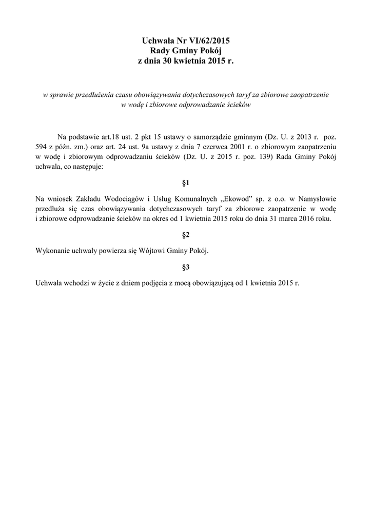 Uchwała Nr VI/62/2015 Rady Gminy Pokój z dnia 30 kwietnia 2015 r. w sprawie przedłużenia czasu obowiązywania dotychczasowych taryf za zbiorowe zaopatrzenie w wodę i zbiorowe odprowadzanie ścieków Na podstawie art.18 ust. 2 pkt 15 ustawy o samorządzie gminnym (Dz. U. z 2013 r. poz. 594 z późn. zm.) oraz art. 24 ust. 9a ustawy z dnia 7 czerwca 2001 r. o zbiorowym zaopatrzeniu w wodę i zbiorowym odprowadzaniu ścieków (Dz. U. z 2015 r. poz. 139) Rada Gminy Pokój uchwala, co następuje: §1 Na wniosek Zakładu Wodociągów i Usług Komunalnych „Ekowod” sp. z o.o. w Namysłowie przedłuża się czas obowiązywania dotychczasowych taryf za zbiorowe zaopatrzenie w wodę i zbiorowe odprowadzanie ścieków na okres od 1 kwietnia 2015 roku do dnia 31 marca 2016 roku. §2 Wykonanie uchwały powierza się Wójtowi Gminy Pokój. §3 Uchwała wchodzi w życie z dniem podjęcia z mocą obowiązującą od 1 kwietnia 2015 r. Załącznik do uchwały Nr VI/62/2015 Rady Gminy Pokój z dnia 30 kwietnia 2015 r. Uzasadnienie wniosku o przedłużenie czasu obowiązywania dotychczasowych taryf dla zbiorowego zaopatrzenia w wodę i zbiorowego odprowadzania ścieków na terenie Gminy Pokój Stosownie do art. 24 ust. 9b ustawy o zbiorowym zaopatrzeniu w wodę i zbiorowym odprowadzaniu ścieków (Dz. U. z 2015 r. poz.139) Spółka EKOWOD zamieszcza wymagane informacje tj: 1. Zakres świadczonych usług i lokalnych uwarunkowań ich świadczenia Zakład Wodociągów i Usług Komunalnych „EKOWOD” Sp. z o.o. prowadzi działalność w zakresie zbiorowego zaopatrzenia w wodę i zbiorowego odprowadzania ścieków. Spółka jest wpisana do Rejestru Przedsiębiorców prowadzonego przez Sąd Rejonowy dla Opola, VIII Wydział Gospodarczy Krajowego Rejestru Sądowego, ul. Plebiscytowa 3 A, numer KRS 0000033145. Obszarem działania Spółki jest teren Gminy Namysłów, Gminy Wilków, Gminy Domaszowice, Gminy Świerczów i Gminy Pokój. Siedzibą Spółki jest miasto Namysłów. Podstawowym przedmiotem działalności gospodarczej Spółki stanowią usługi: 1) dostawy wody i oczyszczania ścieków, 2) komunalne związane z wywozem odpadów stałych, oczyszczaniem ulic i placów oraz selektywną zbiórką odpadów, 3) utrzymania zieleni miejskiej. W ramach usługi dostawy wody i oczyszczania ścieków Spółka wykonuje następujące czynności: - bieżące i stałe dostarczanie wody do jej odbiorców, - odbiór ścieków od odbiorców wody oraz usuwanie i oczyszczanie ścieków, - utrzymanie i eksploatacja sieci wodociągowo – kanalizacyjnych i innych urządzeń służących zaopatrzeniu w wodę oraz usuwaniu i oczyszczaniu ścieków, - dysponowanie i gospodarowanie zasobami wodnymi eksploatowanymi na potrzeby sieci wodociągowej, zgodnie z pozwoleniami wodno – prawnymi, - utrzymanie i eksploatacja urządzeń wodociągowo – kanalizacyjnych służących ochronie wód przed zanieczyszczeniem, - utrzymanie i eksploatacja kanalizacji deszczowej, - prowadzenie stałej i bieżącej kontroli parametrów wody w całym procesie technologicznym w celu utrzymania odpowiednich parametrów ich oczyszczania, - prowadzenie działalności usługowej związanej z eksploatacją sieci wodociągowo kanalizacyjnej, dostarczaniem wody oraz przyjmowaniem ścieków, w szczególności w zakresie wykonywania podłączeń do sieci, zakładania, napraw i legalizacji wodomierzy oraz innych urządzeń wodociągowo-kanalizacyjnych. Spółka na terenie gminy Namysłów eksploatuje 10 studni głębinowych, które ujmują wodę podziemną. Proces jej uzdatniania odbywa się na dwóch stacjach uzdatniania wody. Stacja uzdatniania wody przy ul. Jana Pawła II i stacja uzdatniania wody w Objeździe zaopatrują w wodę miasto Namysłów i wsie zlokalizowane w południowej części gminy. Na terenie gminy Wilków Spółka eksploatuje 3 studnie głębinowe położone przy stacji uzdatniania wody w Jakubowicach, które zaopatrują w wodę pitną całą gminę Wilków oraz część gminy Namysłów. Na terenie gminy zlokalizowana jest pompownia wody w Pągowie, gdzie zamontowany jest hydrofor współpracujący ze zbiornikiem wyrównawczym. Na terenie gminy Domaszowice woda ujmowana jest z 4 studni głębinowych i uzdatniana w dwóch stacjach uzdatniania wody – w automatycznej kontenerowej stacji uzdatniania wody w Woskowicach Górnych oraz stacji uzdatniania wody w Siemysłowie. Gmina Świerczów jest zaopatrywana w wodę pitną z jednej stacji uzdatniania wody położonej w Świerczowie. Na stacji znajdują się 2 studnie głębinowe. Na terenie gminy Pokój woda do mieszkańców dostarczana jest ze stacji uzdatniania wody w Siedlicach, gdzie wodę wydobywa się z dwóch studni głębinowych. EKOWOD jest właścicielem sieci wodociągowej na terenie miasta i gminy Namysłów oraz gminy Wilków, Domaszowice, Świerczów i Pokój dostarczając wodę pitną mieszkańcom. Prowadzi na bieżąco modernizację sieci i przyłączy wodociągowych w celu ich usprawnienia i zwiększenia efektywności działania. Pozwala to również na zmniejszenie awaryjności sieci wodociągowej, a co za tym idzie obniżenie kosztów jej eksploatacji. Planowany zakres działalności Spółki obejmuje rozbudowę sieci wodociągowo – kanalizacyjnych zgodnie z wieloletnim planem rozwoju i modernizacji urządzeń wodociągowych i urządzeń kanalizacyjnych, między innymi uzbrojenie nowych terenów przeznaczonych pod zabudowę mieszkaniową. Ma to na celu zapewnienie dostępu do wody wszystkim mieszkańcom gminy Namysłów, Wilków, Świerczów, Domaszowice i Pokój, jak również zapewnienie odpowiedniej jej jakości. Spółka jest również odpowiedzialna za eksploatację sieci kanalizacji w Namysłowie oraz wsiach: Kamienna, Józefków, Michalice, Objazda, Kowalowice, Jakubowice, Idzikowice, Smarchowice Małe, Krzyków, Smarchowice Wielkie, Smarchowice Nowe, Rychnów, Łączany, Ziemiełowice, Jastrzębie, Gręboszów, Biestrzykowice, Świerczów i w Pokoju. W obsza