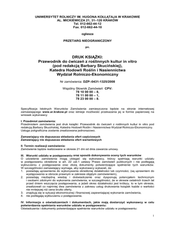 UNIWERSYTET ROLNICZY IM. HUGONA KOŁŁĄTAJA W KRAKOWIE AL. MICKIEWICZA 21, 31–120 KRAKÓW Tel. 012-662-44-12 Fax. 012-662-44-10 ogłasza PRZETARG NIEOGRANICZONY pn. DRUK KSIĄśKI: Przewodnik do ćwiczeń z roślinnych kultur in vitro (pod redakcją Barbary Skucińskiej), Katedra Hodowli Roślin i Nasiennictwa Wydział Rolniczo-Ekonomiczny Nr zamówienia: DZP–0431-1325/2008 Wspólny Słownik Zamówień CPV: 78 10 00 00 – 8, 78 11 00 00 – 1, 78 23 00 00 – 8. Specyfikacja Istotnych Warunków Zamówienia zamieszczona będzie na stronie internetowej zamawiającego www.ar.krakow.pl oraz istnieje moŜliwość przekazania jej w formie papierowej na wniosek wykonawcy I. Przedmiot zamówienia: Przedmiotem zamówienia jest druk ksiąŜki: Przewodnik do ćwiczeń z roślinnych kultur in vitro pod redakcją Barbary Skucińskiej, Katedra Hodowli Roślin i Nasiennictwa Wydział Rolniczo-Ekonomiczny. Usługa poligraficzna zostanie zrealizowana jednorazowo. Zamawiający nie dopuszcza składania ofert częściowych Zamawiający nie dopuszcza składania ofert wariantowych II. Termin realizacji zamówienia: Zamówienie będzie realizowane w okresie 21 dni od dnia zawarcia umowy. III. Warunki udziału w postępowaniu oraz sposób dokonywania oceny tych warunków O udzielenie zamówienia mogą ubiegać się wykonawcy, którzy spełniają warunki udziału w postępowaniu określone w art. 22 ust.1 ustawy Prawo zamówień publicznych i nie podlegają wykluczeniu z postępowania oraz złoŜą dokumenty potwierdzające spełnienie tych warunków. W szczególności zamawiający wymaga, aby wykonawcy wykazali, Ŝe: 1. posiadają uprawnienia do wykonywania określonej działalności lub czynności, (są uprawnieni do występowania w obrocie prawnym w zakresie objętym zamówieniem), 2. posiadają niezbędną wiedzę i doświadczenie oraz dysponują potencjałem technicznym i osobami zdolnymi do wykonania zamówienia, w szczególności, Ŝe w okresie ostatnich trzech lat przed dniem wszczęcia postępowania, a jeŜeli okres działalności jest krótszy, to w tym okresie, zrealizowali co najmniej dwa zamówienia z zakresu usług drukowania ksiąŜek kaŜde o wartości nie mniejszej niŜ cena brutto oferty, 3. znajdują się w sytuacji ekonomicznej i finansowej zapewniającej wykonanie zamówienia, 4. nie podlegają wykluczeniu z postępowania. IV. Informacja o oświadczeniach i dokumentach, jakie mają dostarczyć wykonawcy w celu potwierdzenia spełniania warunków udziału w postępowaniu: Oświadczenia i dokumenty potwierdzające spełnienie warunków udziału w postępowaniu: 1 1. W celu potwierdzenia, Ŝe wykonawca posiada uprawnienia do wykonywania określonej działalności lub czynności oraz nie podlega wykluczeniu z postępowania na podstawie art. 24 ust. 1 i 2 ustawy Prawo zamówień publicznych, zamawiający wymaga załączenia do oferty: a) oświadczenia wykonawcy o spełnieniu warunków określonych w art. 22 ust. 1 ustawy Prawo zamówień publicznych. b) aktualnego odpisu z właściwego rejestru albo aktualnego zaświadczenia o wpisie do ewidencji działalności gospodarczej, jeŜeli odrębne przepisy wymagają wpisu do rejestru lub zgłoszenia do ewidencji działalności gospodarczej, wystawiony nie wcześniej niŜ 6 miesięcy przed upływem terminu składania ofert. 2. W celu potwierdzenia, Ŝe wykonawca posiada niezbędną wiedzę i doświadczenie oraz dysponuje potencjałem technicznych i osobami zdolnymi do wykonania zamówienia, w szczególności, Ŝe w okresie ostatnich trzech lat przed dniem wszczęcia niniejszego postępowania, a jeŜeli okres działalności jest krótszy, to w tym okresie, wykonawca zrealizował co najmniej dwa zamówienia z zakresu usług drukowania ksiąŜek, kaŜde o wartości nie mniejszej niŜ cena brutto oferty, zamawiający wymaga załączenia do oferty: a) wykazu zrealizowanych zamówień w zakresie drukowania ksiąŜek w okresie ostatnich trzech lat przed dniem wszczęcia niniejszego postępowania, a jeŜeli okres prowadzenia działalności jest krótszy, to w tym okresie, z podaniem wartości, przedmiotu, dat wykonania i nazwy odbiorcy. W wykazie naleŜy wymienić co najmniej dwie usługi drukowania ksiąŜek o wartości nie niŜszej niŜ cena brutto oferty, b) dokumentów potwierdzających, Ŝe usługi przedstawione w ww. wykazie zostały wykonane naleŜycie. Kwoty przedstawione w dokumentach winny być co najmniej równe kwotom wykazanym w ww. wykazie. (JeŜeli wykonawca ma siedzibę lub miejsce zamieszkania poza terytorium Rzeczpospolitej Polskiej obowiązuje załączenie odpowiednich dokumentów zgodnych z § 2 Rozporządzenia Prezesa Rady Ministrów z dnia 19 maja 2006 r. (Dz. U. z 2006 r., Nr 87, poz. 605) w sprawie rodzajów dokumentów, jakich moŜe wymagać zamawiający od wykonawcy oraz form, w jakich te dokumenty mogą być składane). Oprócz dokumentów wymienionych powyŜej do oferty naleŜy załączyć: Wypełniony druk „OFERTA”. V. Opis sposobu dokonywania oceny spełniania warunków udziału w postępowaniu: Ocena spełniania warunków udziału w postępowaniu dokonana zostanie zgodnie z formułą „spełnia – nie spełnia” VI. Informacje na temat wadium: Zamawiający nie wymaga wniesienia wadium VII. Kryteria oceny ofert i ich znaczenie: cena – 100 % VIII. Miejsce, termin składania i otwarcia ofert: Oferty naleŜy składać w budynku Uniwersytetu Rolniczego, 31-120 Kraków, Al. Mickiewicza 21, pok. nr 37 – Dział Zamówień Publicznych. 30 Termin składania ofert upływa dnia 24.09.2008 r. o godz. 10 00 Otwarcie ofert nastąpi dnia 24.09.2008 r. o godz. 11 w siedzibie Uniwersytetu Rolniczego im. Hugona Kołłątaja w Krakowie, Al. Mickiewicza 21 - pok. 35 (parter - Dział Zamówień Publicznych). IX. Termin związana ofertą: 30 dni od upływu terminu składania ofert. Zamawiający nie zamierza zawrzeć umowy ramowej. Zamawiający nie zamierza ustanowić dynamicznego systemu zakupów. Zamawiający nie przewiduje wyboru najk