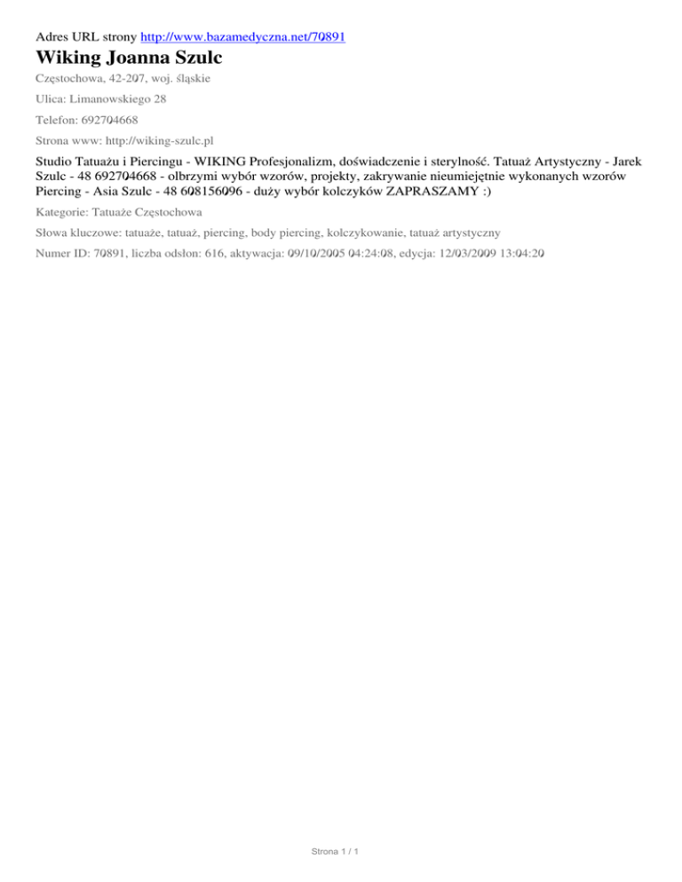 Adres URL strony http://www.bazamedyczna.net/70891 Wiking Joanna Szulc Częstochowa, 42-207, woj. śląskie Ulica: Limanowskiego 28 Telefon: 692704668 Strona www: http://wiking-szulc.pl Studio Tatuażu i Piercingu - WIKING Profesjonalizm, doświadczenie i sterylność. Tatuaż Artystyczny - Jarek Szulc - 48 692704668 - olbrzymi wybór wzorów, projekty, zakrywanie nieumiejętnie wykonanych wzorów Piercing - Asia Szulc - 48 608156096 - duży wybór kolczyków ZAPRASZAMY :) Kategorie: Tatuaże Częstochowa Słowa kluczowe: tatuaże, tatuaż, piercing, body piercing, kolczykowanie, tatuaż artystyczny Numer ID: 70891, liczba odsłon: 616, aktywacja: 09/10/2005 04:24:08, edycja: 12/03/2009 13:04:20 Strona 1 / 1