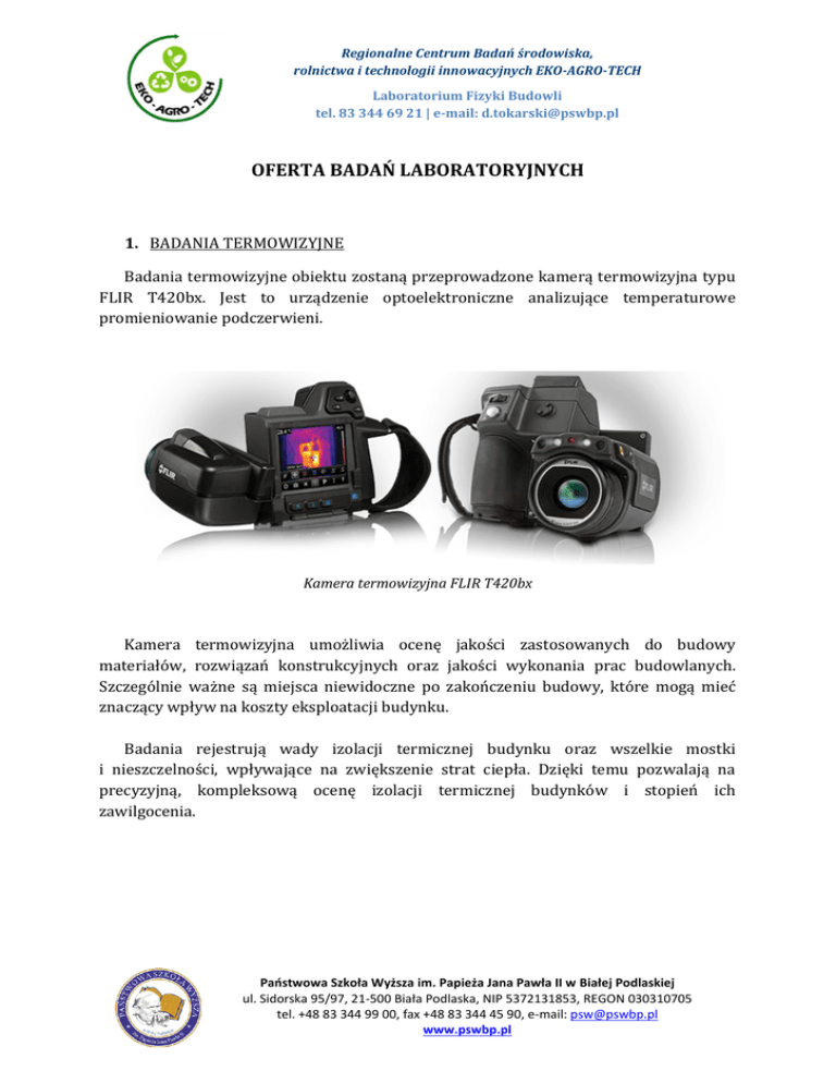 Regionalne Centrum Badań środowiska, rolnictwa i technologii innowacyjnych EKO-AGRO-TECH Laboratorium Fizyki Budowli tel. 83 344 69 21 | e-mail: [email protected] OFERTA BADAŃ LABORATORYJNYCH 1. BADANIA TERMOWIZYJNE Badania termowizyjne obiektu zostaną przeprowadzone kamerą termowizyjna typu FLIR T420bx. Jest to urządzenie optoelektroniczne analizujące temperaturowe promieniowanie podczerwieni. Kamera termowizyjna FLIR T420bx Kamera termowizyjna umożliwia ocenę jakości zastosowanych do budowy materiałów, rozwiązań konstrukcyjnych oraz jakości wykonania prac budowlanych. Szczególnie ważne są miejsca niewidoczne po zakończeniu budowy, które mogą mieć znaczący wpływ na koszty eksploatacji budynku. Badania rejestrują wady izolacji termicznej budynku oraz wszelkie mostki i nieszczelności, wpływające na zwiększenie strat ciepła. Dzięki temu pozwalają na precyzyjną, kompleksową ocenę izolacji termicznej budynków i stopień ich zawilgocenia. Państwowa Szkoła Wyższa im. Papieża Jana Pawła II w Białej Podlaskiej ul. Sidorska 95/97, 21-500 Biała Podlaska, NIP 5372131853, REGON 030310705 tel. +48 83 344 99 00, fax +48 83 344 45 90, e-mail: [email protected] www.pswbp.pl Regionalne Centrum Badań środowiska, rolnictwa i technologii innowacyjnych EKO-AGRO-TECH Laboratorium Fizyki Budowli tel. 83 344 69 21 | e-mail: [email protected] Kontrola rzeczywistego stanu technicznego budynku Termowizja pozwala na ocenę, w jakim stopniu potrzebny jest remont budynku. Odpowiedzieć na pytanie: „Gdzie budynek traci więcej ciepła i ile razy mniej będzie tracił po ewentualnym remoncie”. Zlokalizować miejsca, które ukrywają pod tynkiem zamurowane okna, wyloty kominów wentylacyjnych, czy brak lub niewłaściwe ułożenie izolacji termicznej. Kontrola wykonanych prac ociepleniowych Sprawdzenie, czy wydane fundusze na inwestycje są warte jakości wykonanych prac. Kontrola jakości montażu oraz produkcji stolarki okiennej i drzwiowe Badania termowizyjne stolarki okiennej i drzwiowej pozwalają sprawdzić, czy ich ramy są poprawnie osadzone na ościeżach. Kontrola może wykazać nieszczelności wynikające z niewłaściwego montażu. Diagnoza przyczyn występowania grzybów i pleśni Dzięki kontroli termowizyjnej, przy jednoczesnym pomiarze wilgotności, można wskazać, czy mogą wystąpić problemy z tworzeniem się grzybów i pleśni. Termografia wskazuje, czy źródłem powstawania grzybów i pleśni jest sposób użytkowania pomieszczenia, czy błędy wykonawcze lub projektowe przegród zewnętrznych. Państwowa Szkoła Wyższa im. Papieża Jana Pawła II w Białej Podlaskiej ul. Sidorska 95/97, 21-500 Biała Podlaska, NIP 5372131853, REGON 030310705 tel. +48 83 344 99 00, fax +48 83 344 45 90, e-mail: [email protected] www.pswbp.pl Regionalne Centrum Badań środowiska, rolnictwa i technologii innowacyjnych EKO-AGRO-TECH Laboratorium Fizyki Budowli tel. 83 344 69 21 | e-mail: [email protected] 2. POMIARY HAŁASU Pomiary akustyczne na stanowiskach pracy zostaną przeprowadzone za pomocą analizatora poziomu dźwięku typu SVAN 958, jest on doskonałym narzędziem do wykonywania pomiarów zarówno na stanowiskach prac, jak i w środowisku. Analizator poziomu dźwięku SVAN 958 Pomiary akustyczne umożliwiają dokładna i rzetelną analizę uciążliwości hałasu. Należy jednak pamiętać, że ze względu na fizjologiczne i psychologiczne różnice między ludźmi, stopień uciążliwości nie może być określany na podstawie pojedynczej oceny subiektywnej. Przeprowadzenie pomiarów pozwala na obiektywne porównanie uciążliwości hałasu w różnych warunkach. Pomiary akustyczne pozwalają na ocenę ryzyka uszkodzenia słuchu i wskazania możliwości jego zmniejszenia. Ryzyko uszkodzenia słuchu w danym środowisku akustycznym zależy nie tylko od poziomu hałasu lecz również od czasu jego trwania. Pomiary i analiza dźwięku są ważnym narzędziem diagnostycznym w walce z hałasem na stanowiskach pracy. Państwowa Szkoła Wyższa im. Papieża Jana Pawła II w Białej Podlaskiej ul. Sidorska 95/97, 21-500 Biała Podlaska, NIP 5372131853, REGON 030310705 tel. +48 83 344 99 00, fax +48 83 344 45 90, e-mail: [email protected] www.pswbp.pl
