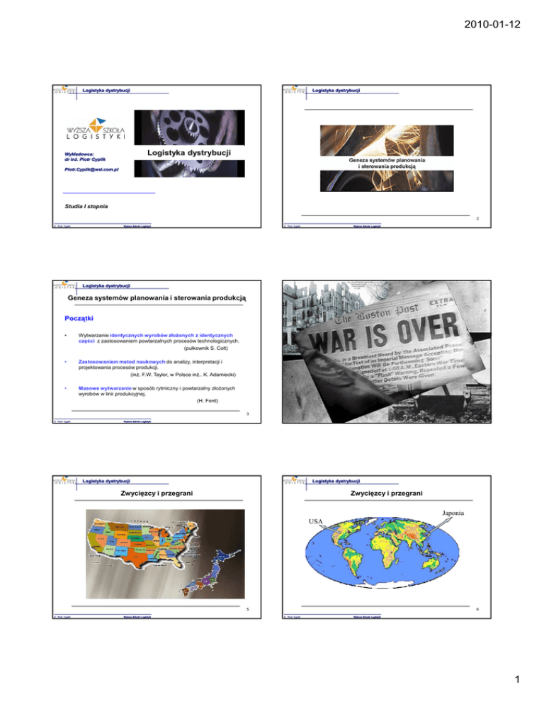 2010-01-12 Logistyka dystrybucji Logistyka dystrybucji Logistyka dystrybucji Wykładowca: dr inŜ. Piotr Cyplik [email protected] Studia I stopnia 2 ® Piotr Cyplik WyŜsza Szkoła Logistyki ® Piotr Cyplik Logistyka dystrybucji WyŜsza Szkoła Logistyki Logistyka dystrybucji Geneza systemów planowania i sterowania produkcją Początki • Wytwarzanie identycznych wyrobów złoŜonych z identycznych części z zastosowaniem powtarzalnych procesów technologicznych. (pułkownik S. Colt) • Zastosowaniem metod naukowych do analizy, interpretacji i projektowania procesów produkcji. (inŜ. F.W. Taylor, w Polsce inŜ.. K. Adamiecki) • Masowe wytwarzanie w sposób rytmiczny i powtarzalny złoŜonych wyrobów w linii produkcyjnej. (H. Ford) 3 ® Piotr Cyplik WyŜsza Szkoła Logistyki 4 ® Piotr Cyplik Logistyka dystrybucji WyŜsza Szkoła Logistyki Logistyka dystrybucji Zwycięzcy i przegrani Zwycięzcy i przegrani Japonia USA 5 ® Piotr Cyplik WyŜsza Szkoła Logistyki 6 ® Piotr Cyplik WyŜsza Szkoła Logistyki 1 2010-01-12 Logistyka dystrybucji Logistyka dystrybucji Zwycięzcy i przegrani Zwycięzcy i przegrani 7 ® Piotr Cyplik WyŜsza Szkoła Logistyki 8 ® Piotr Cyplik Logistyka dystrybucji WyŜsza Szkoła Logistyki Logistyka dystrybucji Zwycięzcy i przegrani Geneza systemów planowania i sterowania produkcją System europejsko-amerykański MONEY Jako nadrzędne kryterium przyjmuje się maksymalizacje wykorzystania zasobów. Dwight David Eisenhower Inne kryteria to: Maksymalizacja podobieństwa technologiczno – organizacyjnego elementów wytwarzanych w danej jednostce organizacyjnej. Minimalizacja liczności zbioru pozycji asortymentowych wytwarzanych w danej jednostce organizacyjnej. Minimalizacja róŜnorodności maszyn i urządzeń oraz ich liczby znajdujących się w danej jednostce organizacyjnej. „Domykanie” procesu produkcyjnego, a więc ograniczanie kooperacji przy wykonywaniu danej pozycji asortymentowej i dąŜenie do wykonywania jej „na gotowo” w jednej jednostce organizacyjnej. Hirohito 9 ® Piotr Cyplik WyŜsza Szkoła Logistyki 10 ® Piotr Cyplik Logistyka dystrybucji Logistyka dystrybucji Geneza systemów planowania i sterowania produkcją Planowanie potrzeb materiałowych - MRP • • WyŜsza Szkoła Logistyki Opracowane zostało przez APICS (American Production and Inventory Control Society) w roku 1957 SłuŜy do racjonalizacji planowania poprzez wydawanie zleceń zakupu i produkcji dokładnie w takim momencie, aby Ŝądany produkt pojawił się w potrzebnej chwili i w wymaganej ilości. System japoński – specyfika powstania rozwiązań klasy Just-in-Time Proces produkcyjny zorganizowany w formie liniowej. Segmenty linii rozdzielone są magazynami – buforami, w których gromadzone są zapasy robót w toku. Poszczególne segmenty linii uzbrojone są w uniwersalne wyposaŜenie. Komunikacja pomiędzy segmentami linii odbywa się w sposób sformalizowany (tak zwane karty „kanban”). W kaŜdym segmencie linii pracuje wzajemnie zastępowalny personel. Zasada elastyczności czasowej. Wynagrodzenie za „gotowość” do pracy. 11 ® Piotr Cyplik WyŜsza Szkoła Logistyki 12 ® Piotr Cyplik WyŜsza Szkoła Logistyki 2 2010-01-12 Logistyka dystrybucji Logistyka dystrybucji O wojnie ekonomicznej z USA wygranej przez Japończyków Just in Time • czyli „dokładnie na czas”, to system działania pozwalający produkować, dostarczać wymagane materiały, surowce lub produkty dokładnie wtedy kiedy są one niezbędne tzn. zgodnie z wymaganiami planu czy teŜ zlecenia. • Ojciec Just in Time • Pracownik TOYOTA od 1932 r. • W roku 1950 rozpoczął testowanie róŜnych technik zmierzających do redukcji czasów ustawiania i przezbrajania maszyn. • Połowa lat 60 –tych wprowadzenie metody Just in Time w Japonii. Taichii Ohno 13 ® Piotr Cyplik WyŜsza Szkoła Logistyki 14 ® Piotr Cyplik Logistyka dystrybucji WyŜsza Szkoła Logistyki Logistyka dystrybucji System planowania potrzeb materiałowych (MRP) Idea rozwiązania Metoda MRP opracowana została przez APICS (American Production and Inventory Control Society) w roku 1957, rozpowszechniona w połowie lat sześćdziesiątych ubiegłego stulecia. Za twórcę metody i największy autorytet uznawany jest Joseph Orlicky. Metoda MRP bazuje na sprawdzonym w praktyce algorytmie planowania potrzeb materiałowych dla części składowych produkowanych wyrobów gotowych. 15 ® Piotr Cyplik WyŜsza Szkoła Logistyki 16 ® Piotr Cyplik Logistyka dystrybucji Logistyka dystrybucji System planowania potrzeb materiałowych (MRP) System planowania potrzeb materiałowych (MRP) Algorytm realizacji funkcji planowania potrzeb materiałowych Zamówienia Podstawowymi informacjami wsadowymi metody MRP są: Prognozy • • • Główny harmonogram produkcji Struktura złoŜoności wyrobu Zapotrzebowanie brutto Zapotrzebowanie netto Marszruty technologiczne WyŜsza Szkoła Logistyki Sterowanie produkcją Główny harmonogram produkcji (MPS – Master Production Schedule), Struktura złoŜoności wyrobu (BOM – Bill of Material), Stan zapasów (IS – Inventory Status) Wynik realizacji procedury MRP: Informacje o potrzebach materiałowych rozplanowane w czasie, na podstawie cykli produkcyjnych oraz cykli zaopatrzenia (Lead Time) stanowią podstawę do sterowania przepływem produkcji oraz realizacji funkcji zaopatrzenia. Stany magazynowe Planowanie zaopatrzeniem Cykle dostawy 17 ® Piotr Cyplik WyŜsza Szkoła Logistyki 18 ® Piotr Cyplik WyŜsza Szkoła Logistyki 3 2010-01-12 Logistyka dystrybucji Zarządzanie operacyjne Logistyka dystrybucji łańcuchem dostaw Planowanie potrzeb materiałowych - Fundamentalne załoŜenia Podział na popyt : NiezaleŜny - popyt prognozowany z określonym stopniem niepewności ZaleŜny - odbicie wyraŜonych przez strukturę produktu związków zachodzących pomiędzy poszczególnymi komponentami na poszczególnych szczeblach struktury wyrobu. Przy określonym popycie na wyroby finalne, zap