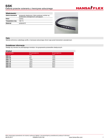 SSK Osłona przeciw ocieraniu z tworzywa sztucznego Właściwości Zakres stosowania Kolor przewody elastyczne, które podczas ruchów są poddawane obciążeniom szorującym czarny Temperatura max. 120 °C Materiał poliamid 6 Opis Spirala ochronna z płaskiego profilu z tworzywa sztucznego chroni wąż przed ścieraniem zewnętrznym. Dodatkowe informacje Nadaje się również do późniejszego montażu i do grupowania przewodów elastycznych. Artykuł Oznaczenie SSK SSK SSK SSK SSK SSK SSK 07 09 13 16 20 25 30 Ø wewnętrzna Ø zewnętrzna (mm) (mm) 7,5 9,5 13,0 15,0 20,0 25,0 30,0 10,0 12,0 16,0 18,0 24,0 29,0 35,4 Mimo starannego sprawdzenia nie możemy wykluczyć błędów i nie gwarantujemy prawidłowości podanych informacji. 08.03.2017 HANSA-FLEX AG www.hansa-flex.com 1