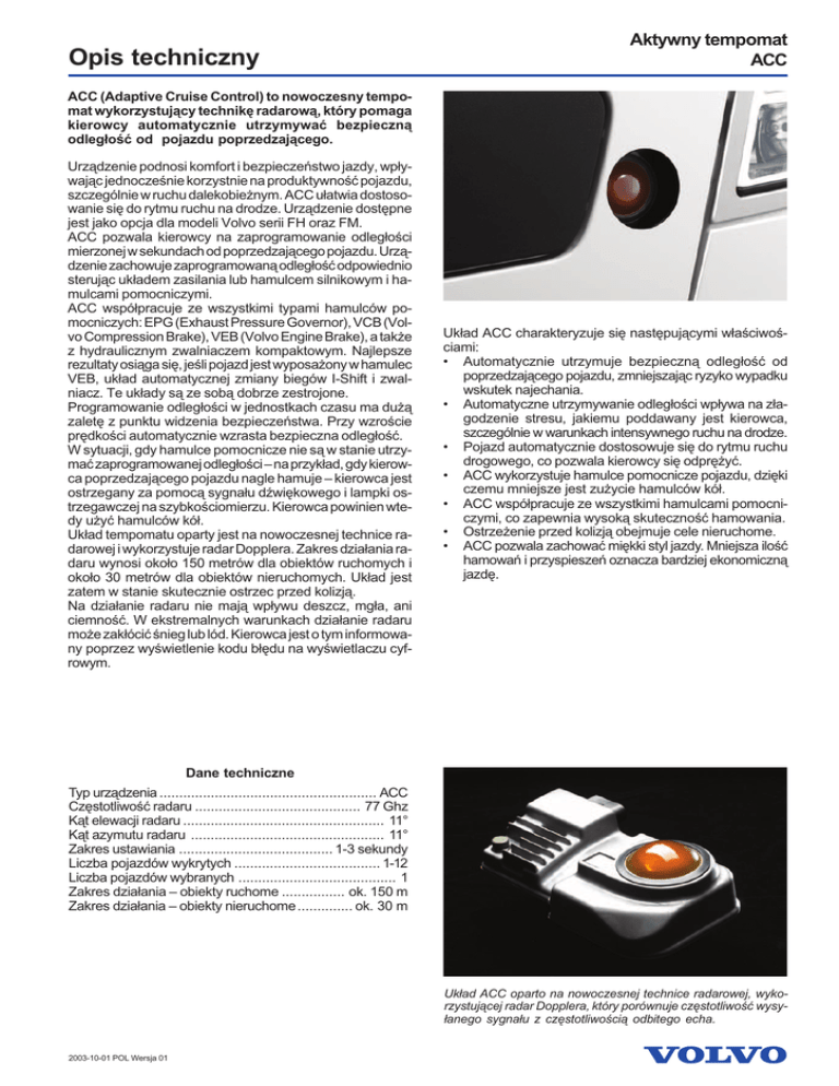 Opis techniczny Aktywny tempomat ACC ACC (Adaptive Cruise Control) to nowoczesny tempomat wykorzystujący technikę radarową, który pomaga kierowcy automatycznie utrzymywać bezpieczną odległość od pojazdu poprzedzającego. Urządzenie podnosi komfort i bezpieczeństwo jazdy, wpływając jednocześnie korzystnie na produktywność pojazdu, szczególnie w ruchu dalekobieżnym. ACC ułatwia dostosowanie się do rytmu ruchu na drodze. Urządzenie dostępne jest jako opcja dla modeli Volvo serii FH oraz FM. ACC pozwala kierowcy na zaprogramowanie odległości mierzonej w sekundach od poprzedzającego pojazdu. Urządzenie zachowuje zaprogramowaną odległość odpowiednio sterując układem zasilania lub hamulcem silnikowym i hamulcami pomocniczymi. ACC współpracuje ze wszystkimi typami hamulców pomocniczych: EPG (Exhaust Pressure Governor), VCB (Volvo Compression Brake), VEB (Volvo Engine Brake), a także z hydraulicznym zwalniaczem kompaktowym. Najlepsze rezultaty osiąga się, jeśli pojazd jest wyposażony w hamulec VEB, układ automatycznej zmiany biegów I-Shift i zwalniacz. Te układy są ze sobą dobrze zestrojone. Programowanie odległości w jednostkach czasu ma dużą zaletę z punktu widzenia bezpieczeństwa. Przy wzroście prędkości automatycznie wzrasta bezpieczna odległość. W sytuacji, gdy hamulce pomocnicze nie są w stanie utrzymać zaprogramowanej odległości – na przykład, gdy kierowca poprzedzającego pojazdu nagle hamuje – kierowca jest ostrzegany za pomocą sygnału dźwiękowego i lampki ostrzegawczej na szybkościomierzu. Kierowca powinien wtedy użyć hamulców kół. Układ tempomatu oparty jest na nowoczesnej technice radarowej i wykorzystuje radar Dopplera. Zakres działania radaru wynosi około 150 metrów dla obiektów ruchomych i około 30 metrów dla obiektów nieruchomych. Układ jest zatem w stanie skutecznie ostrzec przed kolizją. Na działanie radaru nie mają wpływu deszcz, mgła, ani ciemność. W ekstremalnych warunkach działanie radaru może zakłócić śnieg lub lód. Kierowca jest o tym informowany poprzez wyświetlenie kodu błędu na wyświetlaczu cyfrowym. Układ ACC charakteryzuje się następującymi właściwościami: • Automatycznie utrzymuje bezpieczną odległość od poprzedzającego pojazdu, zmniejszając ryzyko wypadku wskutek najechania. • Automatyczne utrzymywanie odległości wpływa na złagodzenie stresu, jakiemu poddawany jest kierowca, szczególnie w warunkach intensywnego ruchu na drodze. • Pojazd automatycznie dostosowuje się do rytmu ruchu drogowego, co pozwala kierowcy się odprężyć. • ACC wykorzystuje hamulce pomocnicze pojazdu, dzięki czemu mniejsze jest zużycie hamulców kół. • ACC współpracuje ze wszystkimi hamulcami pomocniczymi, co zapewnia wysoką skuteczność hamowania. • Ostrzeżenie przed kolizją obejmuje cele nieruchome. • ACC pozwala zachować miękki styl jazdy. Mniejsza ilość hamowań i przyspieszeń oznacza bardziej ekonomiczną jazdę. Dane techniczne Typ urządzenia ....................................................... ACC Częstotliwość radaru .......................................... 77 Ghz Kąt elewacji radaru ................................................... 11° Kąt azymutu radaru ................................................. 11° Zakres ustawiania ....................................... 1-3 sekundy Liczba pojazdów wykrytych ..................................... 1-12 Liczba pojazdów wybranych ........................................ 1 Zakres działania – obiekty ruchome ................ ok. 150 m Zakres działania – obiekty nieruchome .............. ok. 30 m Układ ACC oparto na nowoczesnej technice radarowej, wykorzystującej radar Dopplera, który porównuje częstotliwość wysyłanego sygnału z częstotliwością odbitego echa. 2003-10-01 POL Wersja 01 Aktywny tempomat ACC Opis techniczny Nowoczesny radar Dopplera – rozwiązanie stosowane w lotnictwie Rozwiązania zastosowane w urządzeniu ACC zostały przejęte z samolotów myśliwskich. Głównym elementem jest nowoczesny radar, który czuwa nad prędkością pojazdu. Technika ta wykorzystuje tzw. efekt Dopplera – to znaczy zmianę częstotliwości fali dźwiękowej w zależności od tego, czy się zbliżamy do źródła dźwięku, czy się od niego oddalamy. Radar Dopplera porównuje częstotliwość wysłanego sygnału z częstotliwością powracającego echa. W ten sposób możliwe jest określenie prędkości obiektu wywołującego echo. Radar ACC jest w stanie wychwycić nawet niewielkie różnice prędkości między pojazdem, w którym został zamontowany, a pojazdem poprzedzającym. Ustalenie w porę odległości od poprzedzającego pojazdu Zwykły tempomat pozwala ustawić żądaną prędkość jazdy, natomiast układ ACC dodatkowo pozwala ustawić odległość mierzoną w czasie od poprzedzającego pojazdu. Jeśli kierowca ustali, że margines bezpieczeństwa wynosi 3 sekundy, układ ACC będzie automatycznie czuwał nad zachowaniem tej odległości, odpowiednio sterując układem zasilania pojazdu oraz hamulcami pomocniczymi. Urządzenie można wyłączyć za pomocą przycisku na dźwigni sterującej ACC lub poprzez wciśnięcie pedału hamulca, ewentualnie pedału sprzęgła. Ostrzeżenie przed kolizją Jeśli pojazd poprzedzający zwolniłby na tyle gwałtownie, że hamulce pomocnicze nie dałyby rady wyhamować pojazdu, układ błyskawicznie uruchamia alarm. Wszystkie diody zapalają się na czerwono, włącza się także sygnał akustyczny. Jest to sygnał dla kierowcy, że należy użyć hamulców kół. Różne rodzaje detekcji Radar działa w dość wąskim polu przed pojazdem. Wysyłane fale rozchodzą się w obszarze stożka o kącie rozwarcia 11 stopni. W tym obszarze radar dzieli pojazdy na dwie kategorie: pojazdy wykryte i wybrany obiekt. Liczba wykrytych pojazdów może sięgać dwunastu, natomiast wybrany obiekt może być tylko jeden. Właśnie do wybra