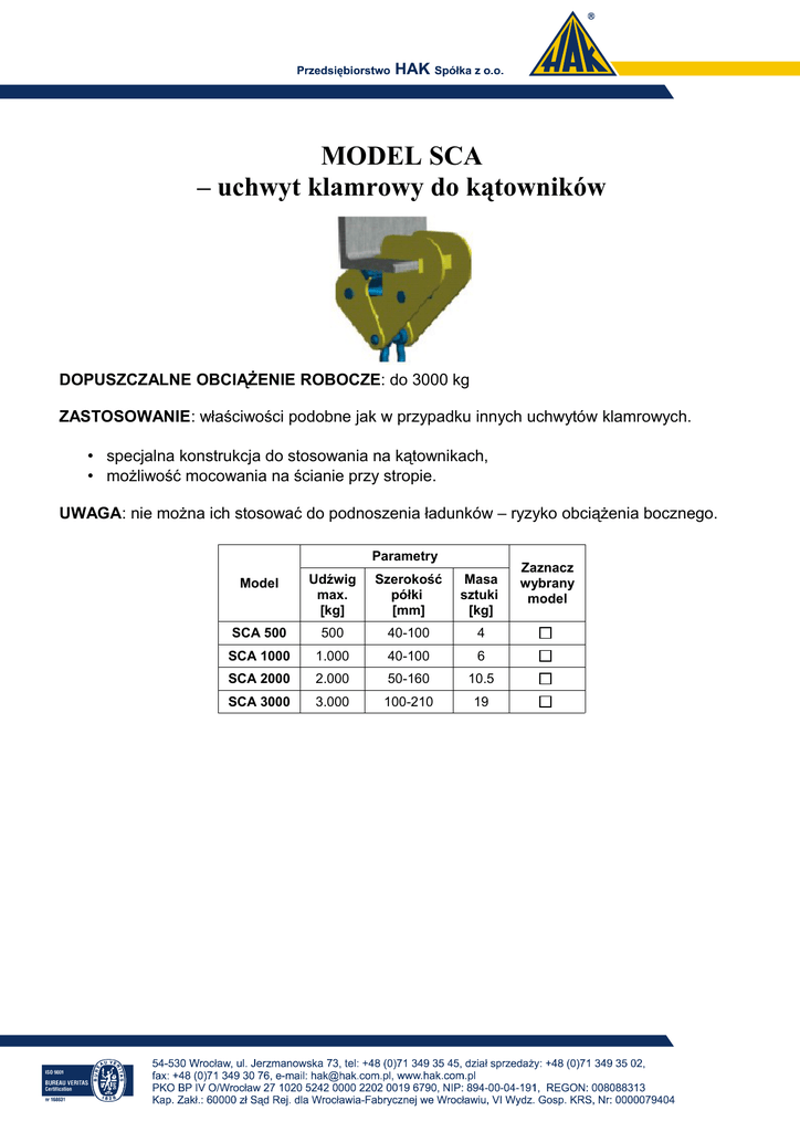 MODEL SCA – uchwyt klamrowy do kątowników DOPUSZCZALNE OBCIĄŻENIE ROBOCZE: do 3000 kg ZASTOSOWANIE: właściwości podobne jak w przypadku innych uchwytów klamrowych. • specjalna konstrukcja do stosowania na kątownikach, • możliwość mocowania na ścianie przy stropie. UWAGA: nie można ich stosować do podnoszenia ładunków – ryzyko obciążenia bocznego. Parametry Model Udźwig max. [kg] Szerokość półki [mm] Masa sztuki [kg] SCA 500 500 40-100 4 SCA 1000 1.000 40-100 6 SCA 2000 2.000 50-160 10.5 SCA 3000 3.000 100-210 19 Zaznacz wybrany model
