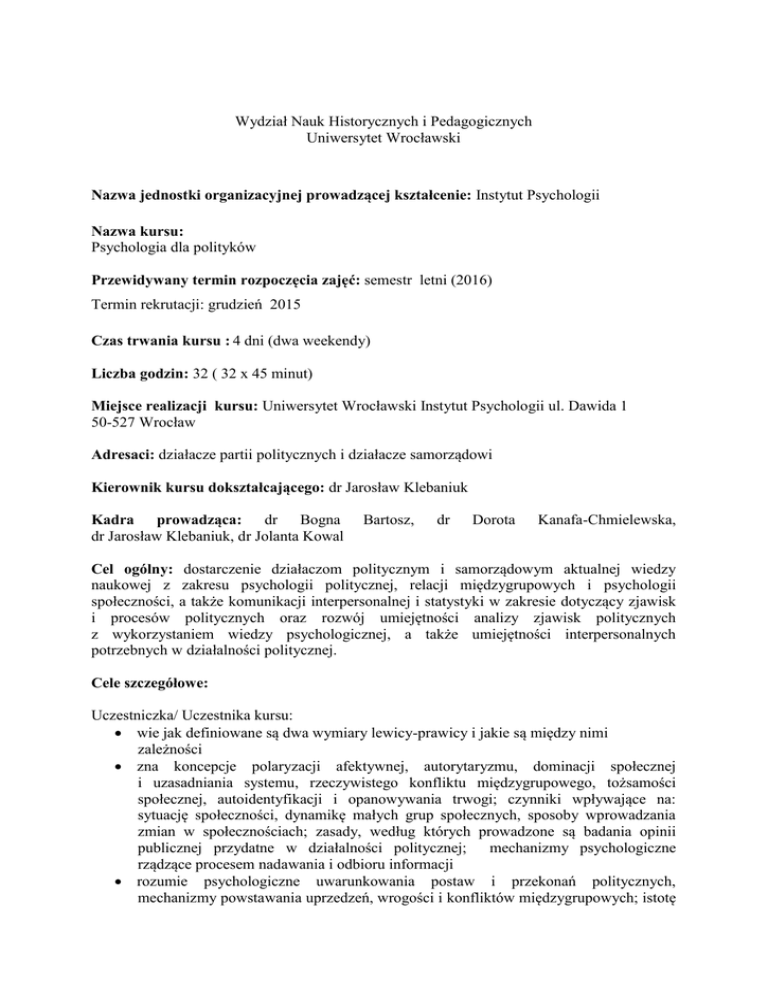 Wydział Nauk Historycznych i Pedagogicznych Uniwersytet Wrocławski Nazwa jednostki organizacyjnej prowadzącej kształcenie: Instytut Psychologii Nazwa kursu: Psychologia dla polityków Przewidywany termin rozpoczęcia zajęć: semestr letni (2016) Termin rekrutacji: grudzień 2015 Czas trwania kursu : 4 dni (dwa weekendy) Liczba godzin: 32 ( 32 x 45 minut) Miejsce realizacji kursu: Uniwersytet Wrocławski Instytut Psychologii ul. Dawida 1 50-527 Wrocław Adresaci: działacze partii politycznych i działacze samorządowi Kierownik kursu dokształcającego: dr Jarosław Klebaniuk Kadra prowadząca: dr Bogna dr Jarosław Klebaniuk, dr Jolanta Kowal Bartosz, dr Dorota Kanafa-Chmielewska, Cel ogólny: dostarczenie działaczom politycznym i samorządowym aktualnej wiedzy naukowej z zakresu psychologii politycznej, relacji międzygrupowych i psychologii społeczności, a także komunikacji interpersonalnej i statystyki w zakresie dotyczący zjawisk i procesów politycznych oraz rozwój umiejętności analizy zjawisk politycznych z wykorzystaniem wiedzy psychologicznej, a także umiejętności interpersonalnych potrzebnych w działalności politycznej. Cele szczegółowe: Uczestniczka/ Uczestnika kursu: wie jak definiowane są dwa wymiary lewicy-prawicy i jakie są między nimi zależności zna koncepcje polaryzacji afektywnej, autorytaryzmu, dominacji społecznej i uzasadniania systemu, rzeczywistego konfliktu międzygrupowego, tożsamości społecznej, autoidentyfikacji i opanowywania trwogi; czynniki wpływające na: sytuację społeczności, dynamikę małych grup społecznych, sposoby wprowadzania zmian w społecznościach; zasady, według których prowadzone są badania opinii publicznej przydatne w działalności politycznej; mechanizmy psychologiczne rządzące procesem nadawania i odbioru informacji rozumie psychologiczne uwarunkowania postaw i przekonań politycznych, mechanizmy powstawania uprzedzeń, wrogości i konfliktów międzygrupowych; istotę esencjalizmu grupowego, dehumanizacji i infrahumanizacji; sposoby zarządzania ludźmi zgodne z założeniami psychologii społeczności; metodologię prowadzenia sondaży opinii publicznej potrafi definiować problemy społeczne napotykane w praktyce działań politycznych i samorządowych w kategoriach psychologicznych, a także poszukiwać rozwiązań tych problemów z wykorzystaniem wiedzy psychologicznej; poprawnie odczytywać i interpretować wyniki badań opinii publicznej; zastosować wiedzę psychologiczną z zakresu komunikacji interpersonalnej (werbalnej i niewerbalnej), wykorzystać różnego typu argumentacje w przekazie, opracować strategię autoprezentacji opartą o znajomość zasad psychologicznych Formuła zajęć: wykłady, ćwiczenia Plan kursu dokształcającego: Liczba godzin wykładów Liczba godzin ćwiczeń I Poglądy polityczne i orientacje społeczne 4 4 2 Psychologia relacji międzygrupowych 4 4 L.p. 3 4 5 Blok tematyczny Psychologia społeczności 4 Komunikacja interpersonalna dla polityków 2 Interpretacja danych statystycznych i wyników sondaży opinii publicznej 4 6 Program kursu dokształcającego: Blok I Poglądy polityczne i orientacje społeczne Podstawowe kategorie ideologii (wolność, równość) i dwa wymiary (ekonomiczny i kulturowy) przekonań politycznych (lewica – prawica) w kontekście teorii i badań psychologicznych Koncepcje polaryzacji afektywnej, autorytaryzmu, dominacji społecznej i uzasadniania systemu, ich uwarunkowania i znaczenie w praktyce politycznej W trakcie ćwiczeń ramy teoretyczne zarysowane na wykładzie posłużą do porządkowania konkretnych przekonań, preferencji politycznych i rozwiązań problemów społecznych, i samorządowy jakie napotyka współczesny działacz polityczny Blok II Psychologia relacji międzygrupowych Współczesne koncepcje i badania dotyczące implikacji przynależności do grup społecznych Teorie rzeczywistego konfliktu międzygrupowego, tożsamości społecznej, autoidentyfikacji i opanowywanie trwogi posłużą do wyjaśniania animozji i konfliktów międzygrupowych Wiedza na temat esencjalizmu grupowego, dehumanizacji i infrahumanizacji, a także stereotypów i uprzedzeń, ich powstawania, zapobiegania im i osłabiania zostanie wykorzystana w trakcie ćwiczeń, których celem będzie doskonalenie umiejętności budowania pozytywnych relacji międzygrupowych Blok III Psychologia społeczności Założenia psychologii społeczności w polityce, a w szczególności: czynniki wpływające na sytuację społeczności, dynamikę małych grup społecznych, zarządzanie ludźmi zgodne z założeniami psychologii społeczności, sposoby wprowadzania zmian w społecznościach oraz prowadzenie badań opinii publicznej z perspektywy psychologii społeczności Blok IV Komunikacja interpersonalna dla polityków Wprowadzenie do psychologii komunikowania interpersonalnego w polityce Psychologiczne modele i rodzaje komunikacji interpersonalnej (komunikacja werbalna, paralingwistyczna, niewerbalna, w tym proksemiczna, kinezyjna i inne) oraz znaczenie efektywnej komunikacji w polityce Wyznaczniki skutecznej komunikacji interpersonalnej w polityce, rola komunikacji werbalnej i niewerbalnej (ćwiczenia i analiza przykładów), skuteczna autoprezentacja z wykorzystaniem zasad psychologicznych, komunikację interpersonalna w kontekście wpływu społecznego, perswazji i manipulacji; „demonstracja” władzy oraz bariery komunikacyjne i sposoby ich przezwyciężania Blok V Interpretacja danych statystycznych i wyników sondaży opinii publicznej Zasady, według których prowadzone są badania opinii publicznej dostarczające informacji użytecznych w działalności politycznej, a także sposobu, w jaki należy te dane odczytywać i interpretować Metodologia prowadzenia sondaży i opracowywania danych statystycznych, a także ograniczeń z nimi związanych, może być pomocnym narzędziem w ręku polityka Warunki ukończenia kursu dokształcającego: obecno