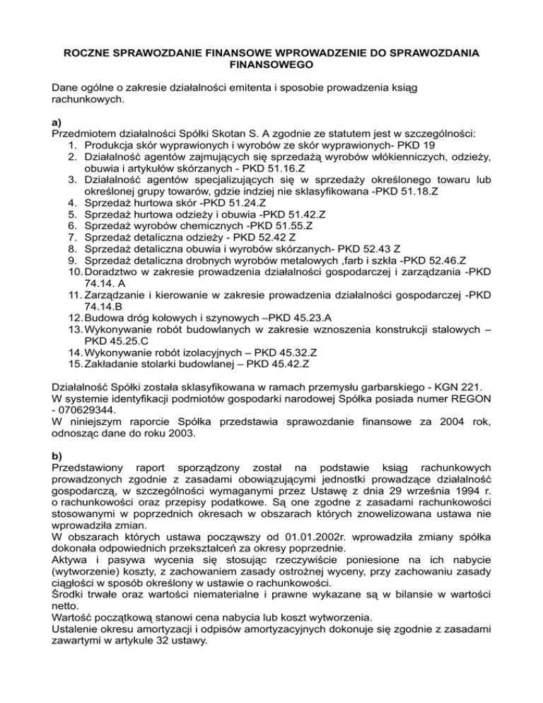 ROCZNE SPRAWOZDANIE FINANSOWE WPROWADZENIE DO SPRAWOZDANIA FINANSOWEGO Dane ogólne o zakresie działalności emitenta i sposobie prowadzenia ksiąg rachunkowych. a) Przedmiotem działalności Spółki Skotan S. A zgodnie ze statutem jest w szczególności: 1. Produkcja skór wyprawionych i wyrobów ze skór wyprawionych- PKD 19 2. Działalność agentów zajmujących się sprzedażą wyrobów włókienniczych, odzieży, obuwia i artykułów skórzanych - PKD 51.16.Z 3. Działalność agentów specjalizujących się w sprzedaży określonego towaru lub określonej grupy towarów, gdzie indziej nie sklasyfikowana -PKD 51.18.Z 4. Sprzedaż hurtowa skór -PKD 51.24.Z 5. Sprzedaż hurtowa odzieży i obuwia -PKD 51.42.Z 6. Sprzedaż wyrobów chemicznych -PKD 51.55.Z 7. Sprzedaż detaliczna odzieży - PKD 52.42 Z 8. Sprzedaż detaliczna obuwia i wyrobów skórzanych- PKD 52.43 Z 9. Sprzedaż detaliczna drobnych wyrobów metalowych ,farb i szkła -PKD 52.46.Z 10. Doradztwo w zakresie prowadzenia działalności gospodarczej i zarządzania -PKD 74.14. A 11. Zarządzanie i kierowanie w zakresie prowadzenia działalności gospodarczej -PKD 74.14.B 12. Budowa dróg kołowych i szynowych –PKD 45.23.A 13. Wykonywanie robót budowlanych w zakresie wznoszenia konstrukcji stalowych – PKD 45.25.C 14. Wykonywanie robót izolacyjnych – PKD 45.32.Z 15. Zakładanie stolarki budowlanej – PKD 45.42.Z Działalność Spółki została sklasyfikowana w ramach przemysłu garbarskiego - KGN 221. W systemie identyfikacji podmiotów gospodarki narodowej Spółka posiada numer REGON - 070629344. W niniejszym raporcie Spółka przedstawia sprawozdanie finansowe za 2004 rok, odnosząc dane do roku 2003. b) Przedstawiony raport sporządzony został na podstawie ksiąg rachunkowych prowadzonych zgodnie z zasadami obowiązującymi jednostki prowadzące działalność gospodarczą, w szczególności wymaganymi przez Ustawę z dnia 29 września 1994 r. o rachunkowości oraz przepisy podatkowe. Są one zgodne z zasadami rachunkowości stosowanymi w poprzednich okresach w obszarach których znowelizowana ustawa nie wprowadziła zmian. W obszarach których ustawa począwszy od 01.01.2002r. wprowadziła zmiany spółka dokonała odpowiednich przekształceń za okresy poprzednie. Aktywa i pasywa wycenia się stosując rzeczywiście poniesione na ich nabycie (wytworzenie) koszty, z zachowaniem zasady ostrożnej wyceny, przy zachowaniu zasady ciągłości w sposób określony w ustawie o rachunkowości. Środki trwałe oraz wartości niematerialne i prawne wykazane są w bilansie w wartości netto. Wartość początkową stanowi cena nabycia lub koszt wytworzenia. Ustalenie okresu amortyzacji i odpisów amortyzacyjnych dokonuje się zgodnie z zasadami zawartymi w artykule 32 ustawy. Środki trwałe oraz wartości niematerialne i prawne, których jednostkowa wartość początkowa jest niższa od 3.500,- zł. amortyzowane są w sposób uproszczony poprzez jednorazowy pełny odpis wartości początkowej w miesiącu wydania do użytkowania. Środki trwałe w budowie wycenia się w wysokości ogółu kosztów pozostających w bezpośrednim związku z ich nabyciem lub wytworzeniem ,pomniejszonym o odpisy z tytułu trwałej utraty ich wartości. Udziały w innych jednostkach oraz inne inwestycje zaliczane do aktywów trwałych: - ewidencjonowane są wg cen nabycia, pomniejszonej o odpisy aktualizujące w przypadku trwałej utraty ich wartości. Przychód i rozchód udziałów odbywa się wg zasady FIFO. Zapasy materiałów i surowców wycenia się według cen zakupu nie wyższych od ich cen sprzedaży netto nadzień bilansowy. Rozchód materiałów i surowców wycenia się według zasady FIFO. Na przewidywane straty z tytułu utraty cech użytkowych lub przydatności oraz likwidacji materiałów zbędnych jednostka dokonuje odpisów aktualizacyjnych w ciężar pozostałych kosztów operacyjnych. Zapasy półproduktów i produkcji w toku wycenia się w ciągu roku obrotowego według kosztów zużycia materiałów bezpośrednich obejmujących surowiec (skórę) oraz środki chemiczne. Na dzień bilansowy półprodukty i produkcję w toku wycenia się zgodnie z zasadą ostrożnej wyceny wg kosztów zużycia materiałów bezpośrednich, jednak nie wyższych od ich ceny sprzedaży netto na dzień bilansowy. Produkty gotowe wyceniane są w ciągu roku według cen ewidencyjnych ustalonych na poziomie cen zbytu, korygowanych do poziomu kosztu wytworzenia poprzez odchylenia od cen ewidencyjnych produktów gotowych. Na dzień bilansowy produkty gotowe wycenia się zgodnie z zasadą ostrożnej wyceny według kosztu wytworzenia, nie wyższym od ich ceny sprzedaży netto na dzień bilansowy. Należności krótkoterminowe i pożyczki wykazywane są w bilansie w kwocie wymaganej zapłaty z uwzględnieniem odpisów aktualizacyjnych na należności wątpliwe. Odpisy aktualizacyjne na należności wątpliwe tworzone są - z uwzględnieniem prawdopodobieństwa ich zapłaty -po trzykrotnym wezwaniu do zapłaty i braku kontaktu dłużnika ze Spółką, w ciężar pozostałych kosztów operacyjnych. Zobowiązania z wyjątkiem zobowiązań finansowych wykazuje się w kwocie wymagającej zapłaty. Należności wyrażone w walucie obcej na dzień bilansowy przelicza się po kursie kupna stosowanym w tym dniu przez bank z którego korzysta jednostka nie wyższym jednak od kursu średniego ustalonego na ten dzień przez Prezesa NBP . Zobowiązania wyrażone w walucie obcej na dzień bilansowy przelicza się po kursie sprzedaży stosowanym w tym dniu przez bank z którego korzysta jednostka nie niższym jednak od kursu średniego ustalonego na ten dzień przez Prezesa NBP . Na dzień bilansowy nadwyżkę ujemnych różnic kursowych nad dodatnimi zalicza się do kosztów finansowych , zaś nadwyżkę dodatnich różnic kursowych nad ujemnymi zalicza się do pozostałych przychodów operacyjnych. W rachunku zysków i strat różnice kursowe prezentowane są wyn