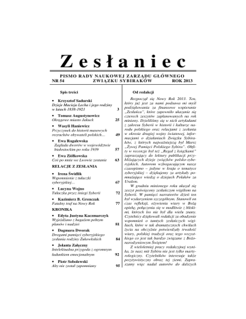 Zesłaniec PISMO RADY NAUK OWEJ ZARZĄDU GŁÓWNEGO NR 54 ZWI ĄZK U SYBIRAK ÓW ROK 2013 Spis treści • Krzysztof Sadurski Dzieje Macieja Lecha i jego rodziny w latach 1838-1921 Od redakcji 3 • Tomasz Augustynowicz Okręgowe miasto Jakuck 25 • Wasyli Haniewicz Przyczynek do historii masowych rozruchów obywateli polskich… 49 • Ewa Rogalewska Zagłada dworów w województwie białostockim po roku 1939 57 • Ewa Ziółkowska Coś po mnie we Lwowie zostanie 63 RELACJE Z ZESŁANIA • Irena Świdlik Wspomnienie z tułaczki syberyjskiej… 67 • Lucyna Wojno Tułaczka przez śniegi Syberii 72 • Kazimierz B. Grenczak Fatalny traf na Nowy Rok 77 KRONIKA • Edyta Justyna Kaczmarczyk Wyjeżdżano z bagażem pełnym planów i nadziei 81 • Dagmara Dworak Drogami pamięci syberyjskiego zesłania rodziny Żukowkskich 84 • Jolanta Załęczny Intelektualna przygoda z ogromnym ładunkiem emocjonalnym 92 • Piotr Sobolewski Aby nie został zapomniany 95 Rozpoczął się Nowy Rok 2013. Ten, który już jest za nami podsuwa mi myśl podziękowania za finansowe wspieranie „Zesłańca”, które zapewniło ukazanie się czterech zeszytów zaplanowanych na rok miniony. Dzieliliśmy się w nich artykułami z zakresu Syberii w historii i kulturze narodu polskiego oraz relacjami z zesłania w okresie drugiej wojny światowej, informacjami o działaniach Związku Sybiraków, z których najważniejszą był Marsz „Żywej Pamięci Polskiego Sybiru”. Obfity w recenzje był też „Regał z książkami” zapraszający do lektury publikacji przybliżających dzieje związków polsko-syberyjskich. Autorom wzbogacającym nasze czasopismo – jedyne w kraju o tematyce syberyjskiej – dziękujemy za artykuły pomnażające wiedzę o dziejach Polaków za Uralem. W grudniu minionego roku ukazał się zeszyt poświęcony zesłańczym wigiliom na Syberii. W pamięci narratorów dzień ten był wydarzeniem szczególnym. Stanowił on czas refleksji, ożywienia wiary w Bożą opiekę, połączenia się w modlitwie z bliskimi, których los nie był dla wielu znany. Czytelnicy dziękowali redakcji za obudzenie wspomnień o tamtych zesłańczych wigiliach, które w tak dramatycznych chwilach życia na obczyźnie potwierdzały trwałość wiary, polskiej tradycji oraz tego wszystkiego co jest tak bardzo związane z Bożonarodzeniowym Świętem! Z wieloletniej pracy redakcyjnej wynika, że nasz mit Sybiru nie jest tylko martyrologiczny. Czytelników interesuje także pozytywistyczny obraz tej ziemi. Zapraszamy więc nadal autorów do dalszych REGAŁ Z KSIĄŻKAMI • Kazimierz Sobolewski, Moja droga do Polski, Sandomierz 2011. (Mirosław Grudzień) 99 • Piotr Cichoracki, Stołpce-ŁowczaLeśna 1924. II Rzeczpospolita wobec najpoważniejszych incydentów zbrojnych…, Łomianki. (Tomasz Dudek) 105 • Krzysztof Walaszczyk, Środkowy Wschód w latach II wojny światowej. Relacje i działania polskich placówek dyplomatycznych i konsularnych w Iranie, Iraku i Afganistanie, Toruń 2012. (Tomasz Dudek) 107 • Stefania Skowron-Markowska, Z Oksfordu na Syberię. Dziedzictwo naukowe Marii Antoniny Czaplickiej, Wrocław 2012 (Antoni Przesmycki) 110 Na okładce: Symboliczna mogiła polskich zesłańców na cmentarzu w Bijsku z napisem: „Pamięci Polaków – zesłańców i ofiar represji stalinowskich, których prochy spoczywają na Ałtaju. Gdzie są ich groby Polsko. Gdzie ich nie ma! Ty wiesz najlepiej i Bóg wie na Niebie.” Fot. Agnieszka Kaniewska (s. 1); Bajkał – skała „Szamanka”. Fot. Dagmara Dworak (s. 4). Zeszyt opublikowany dzięki dotacji Rady Ochrony Pamięci Walk i Męczeństwa Wydawca: Zarząd Główny Związku Sybiraków, ul. Mazowiecka 12 00-048 Warszawa, tel. 22/827 93 71 Redakcja: A. Dobroński, A. Dzienkiewicz, W. Krawczyński, A. Kuczyński (red. nacz.), S. Sikorski, P. Zworski Sekretarz redakcji: M. B. Kuczyńska Wykonawca: Skład, druk i oprawa – QUAESTIO Przemysław Włodarczyk, ul. Paczkowska 26; 50-503 Wrocław Copyright nazwy „Zesłaniec” by A. Kuczyński Adres redakcji: ul. Bystrzycka 61/3 54-215 Wrocław, tel. 71/351 10 94 kontaktów i obiecujemy, że sprawy naszego dziedzictwa syberyjskiego są wciąż jednym z ważniejszych tematów, które będziemy kontynuować. W ten nurt badawczy włączają się także historycy rosyjscy, zwłaszcza z syberyjskiej części Rosji, a niektórzy z nich świadomi są swoich odległych polskich korzeni. Otwieramy więc dla nich łamy „Zesłańca” i dziękujemy za ubogacanie jego tematki kolejnymi tekstami. Naszkicowany tu obraz tematów jest niezmiernie złożony, bo wiele przecież łączyło Polaków z Syberią i składa się to na wielowątkowy katalog pojęć i dobrze, że powracają one przy okazji rocznicowych obchodów, jak np. ma to obecnie miejsce z okazji 150-tej rocznicy Powstania Styczniowego! Oczywiście są to niezmiernie obszerne zagadnienia, niemożliwe na pełniejsze ich zobrazowanie na łamach „Zesłańca”, bywa jednak nieraz i tak, że postulowane przez nas tematy podejmowane są w pełniejszych kontekstach przez historyków oraz stanowią temat polskorosyjskich konferencji naukowych organizowanych przez polskie stowarzyszenia kulturalno-oświatowe na Syberii – Irkuck, Jakuck, Jużno-Sachalińsk, Krasnojarsk, Nowosybirsk, Omsk, Tomsk. Ze smutkiem odnoszę się do ograniczania ilości godzin nauki historii w szkołach. Fakt ten oddala obraz losów wspaniałych postaci ukazywanych na łamach „Zesłańca”, wspomnienia zesłańczego losu, patriotyczne tradycje czy dumę z polskości. Wiele jest pomnikowych postaci, których nie załamała ani carska, ani sowiecka przemoc, syberyjskie deportacje i dramatyczne przeżycia tam za Uralem. Im się należy pamięć oraz miejsce w naszej historii. Wiesław Krawczyński Przewodniczący Rady Naukowej Zarządu Głównego Związku Sybiraków