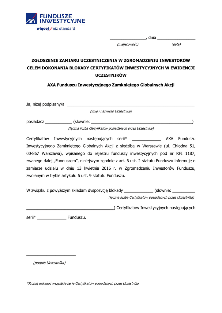 ________________, dnia _________________ (miejscowość) (data) ZGŁOSZENIE ZAMIARU UCZESTNICZENIA W ZGROMADZENIU INWESTORÓW CELEM DOKONANIA BLOKADY CERTYFIKATÓW INWESTYCYJNYCH W EWIDENCJI UCZESTNIKÓW AXA Funduszu Inwestycyjnego Zamkniętego Globalnych Akcji Ja, niżej podpisany/a _________________________________________________________ (imię i nazwisko Uczestnika) posiadacz ____________ (słownie: _____________________________________________) (łączna liczba Certyfikatów posiadanych przez Uczestnika) Certyfikatów Inwestycyjnych następujących serii* _____________ AXA Funduszu Inwestycyjnego Zamkniętego Globalnych Akcji z siedzibą w Warszawie (ul. Chłodna 51, 00-867 Warszawa), wpisanego do rejestru funduszy inwestycyjnych pod nr RFI 1187, zwanego dalej „Funduszem”, niniejszym zgodnie z art. 6 ust. 2 statutu Funduszu informuję o zamiarze udziału w dniu 13 kwietnia 2016 r. w Zgromadzeniu Inwestorów Funduszu, zwołanym w trybie artykułu 6 ust. 9 statutu Funduszu. W związku z powyższym składam dyspozycję blokady _____________ (słownie: __________ (łączna liczba Certyfikatów posiadanych przez Uczestnika) _______________________________________) Certyfikatów Inwestycyjnych następujących serii* _____________ Funduszu. ______________________ (podpis Uczestnika) *Proszę wskazać wszystkie serie Certyfikatów posiadanych przez Uczestnika