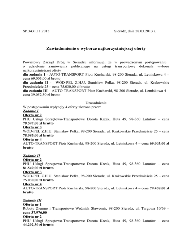 SP.3431.11.2013 Sieradz, dnia 28.03.2013 r. Zawiadomienie o wyborze najkorzystniejszej oferty Powiatowy Zarząd Dróg w Sieradzu informuje, że w prowadzonym postępowaniu o udzielenie zamówienia publicznego na usługi transportowe dokonała wyboru najkorzystniejszej oferty dla zadania I - AUTO-TRANSPORT Piotr Kucharski, 98-200 Sieradz, ul. Letniskowa 4 – cena 69.003,00 zł brutto dla zadania II - WÓD-PEŁ Z.H.U. Stanisław Pełka, 98-200 Sieradz, ul. Krakowskie Przedmieście 25 – cena 75.030,00 zł brutto dla zadania III – AUTO-TRANSPORT Piotr Kucharski, 98-200 Sieradz, ul. Letniskowa 4 – cena 39.052,50 zł brutto Uzasadnienie W postępowaniu wpłynęły 4 oferty złożone przez: Zadanie I Oferta nr 2 PHU Usługi Sprzętowo-Transportowe Dorota Krzak, Huta 49, 98-360 Lututów – cena 78.597,00 zł brutto Oferta nr 3 WÓD-PEŁ Z.H.U. Stanisław Pełka, 98-200 Sieradz, ul. Krakowskie Przedmieście 25 – cena 78.085,00 zł brutto Oferta nr 4 AUTO-TRANSPORT Piotr Kucharski, 98-200 Sieradz, ul. Letniskowa 4 – cena 69.003,00 zł brutto Zadanie II Oferta nr 2 PHU Usługi Sprzętowo-Transportowe Dorota Krzak, Huta 49, 98-360 Lututów – cena 81.549,00 zł brutto Oferta nr 3 WÓD-PEŁ Z.H.U. Stanisław Pełka, 98-200 Sieradz, ul. Krakowskie Przedmieście 25 – cena 75.030,00 zł brutto Oferta nr 4 AUTO-TRANSPORT Piotr Kucharski, 98-200 Sieradz, ul. Letniskowa 4 – cena 79.458,00 zł brutto Zadanie III Oferta nr 1 Roboty Ziemne i Transportowe Woźniak Sławomir, 98-200 Sieradz, ul. Targowa 10/69 – cena 37.976,00 Oferta nr 2 PHU Usługi Sprzętowo-Transportowe Dorota Krzak, Huta 49, 98-360 Lututów – cena 44.292,30 zł brutto Oferta nr 3 WÓD-PEŁ Z.H.U. Stanisław Pełka, 98-200 Sieradz, ul. Krakowskie Przedmieście 25 – cena 39.729,00 zł brutto Oferta nr 4 AUTO-TRANSPORT Piotr Kucharski, 98-200 Sieradz, ul. Letniskowa 4 – cena 39.052,50 zł brutto Wykonawca Roboty Ziemne i Transportowe Woźniak Sławomir, 98-200 Sieradz, ul. Targowa 10/69 nie spełnił warunków uczestnictwa w postępowaniu i zgodnie z art. 24 ust. 2 pkt 4 został wykluczony z postępowania. Zgodnie z kryterium oceny ofert najkorzystniejszą jest: dla zadania I - AUTO-TRANSPORT Piotr Kucharski, 98-200 Sieradz, ul. Letniskowa 4 – cena 69.003,00 zł brutto dla zadania II - WÓD-PEŁ Z.H.U. Stanisław Pełka, 98-200 Sieradz, ul. Krakowskie Przedmieście 25 – cena 75.030,00 zł brutto dla zadania III – AUTO-TRANSPORT Piotr Kucharski, 98-200 Sieradz, ul. Letniskowa 4 – cena 39.052,50 zł brutto Oferty uzyskały następującą liczbę punktów: Zadanie I: oferta nr 2 – 87,79 pkt, oferta nr 3 – 88,37 pkt, oferta nr 4 – 100,00 pkt. Zadanie II: oferta nr 2 – 92,01 pkt, oferta nr 3 – 100,00 pkt, oferta nr 4 – 94,43 pkt. Zadanie III: oferta nr 2 – 88,17 pkt, oferta nr 3 – 98,30 pkt, oferta nr 4 – 100,00 pkt. Informuję, że zgodnie z art. 94 ust. 1 pkt 2 ustawy Prawo zamówień publicznych umowa w sprawie zamówienia publicznego może być podpisana po upływie 5 dni od przesłania niniejszego zawiadomienia faksem, albo 10 dni – jeżeli zostało przesłane pocztą. Otrzymują: 1) PHU Usługi Sprzętowo-Transportowe Dorota Krzak, Huta 49, 98-360 Lututów 2) AUTO-TRANSPORT Piotr Kucharski, 98-200 Sieradz, ul. Letniskowa 4 3) WÓD-PEŁ Z.H.U. Stanisław Pełka, 98-200 Sieradz, ul. Krakowskie Przedmieście 25 4. Roboty Ziemne i Transportowe Woźniak Sławomir, 98-200 Sieradz, ul. Targowa 10/69