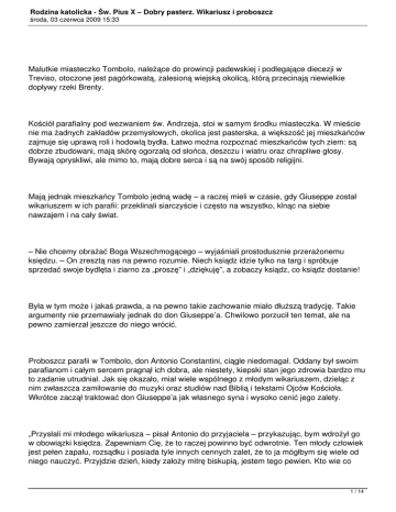 Rodzina katolicka - Św. Pius X – Dobry pasterz. Wikariusz i proboszcz środa, 03 czerwca 2009 15:33 Malutkie miasteczko Tombolo, należące do prowincji padewskiej i podlegające diecezji w Treviso, otoczone jest pagórkowatą, zalesioną wiejską okolicą, którą przecinają niewielkie dopływy rzeki Brenty. Kościół parafialny pod wezwaniem św. Andrzeja, stoi w samym środku miasteczka. W mieście nie ma żadnych zakładów przemysłowych, okolica jest pasterska, a większość jej mieszkańców zajmuje się uprawą roli i hodowlą bydła. Łatwo można rozpoznać mieszkańców tych ziem: są dobrze zbudowani, mają skórę ogorzałą od słońca, deszczu i wiatru oraz chrapliwe głosy. Bywają opryskliwi, ale mimo to, mają dobre serca i są na swój sposób religijni. Mają jednak mieszkańcy Tombolo jedną wadę – a raczej mieli w czasie, gdy Giuseppe został wikariuszem w ich parafii: przeklinali siarczyście i często na wszystko, klnąc na siebie nawzajem i na cały świat. – Nie chcemy obrażać Boga Wszechmogącego – wyjaśniali prostodusznie przerażonemu księdzu. – On zresztą nas na pewno rozumie. Niech ksiądz idzie tylko na targ i spróbuje sprzedać swoje bydlęta i ziarno za „proszę” i „dziękuję”, a zobaczy ksiądz, co ksiądz dostanie! Była w tym może i jakaś prawda, a na pewno takie zachowanie miało dłuższą tradycję. Takie argumenty nie przemawiały jednak do don Giuseppe’a. Chwilowo porzucił ten temat, ale na pewno zamierzał jeszcze do niego wrócić. Proboszcz parafii w Tombolo, don Antonio Constantini, ciągle niedomagał. Oddany był swoim parafianom i całym sercem pragnął ich dobra, ale niestety, kiepski stan jego zdrowia bardzo mu to zadanie utrudniał. Jak się okazało, miał wiele wspólnego z młodym wikariuszem, dzieląc z nim zwłaszcza zamiłowanie do muzyki oraz studiów nad Biblią i tekstami Ojców Kościoła. Wkrótce zaczął traktować don Giuseppe’a jak własnego syna i wysoko cenić jego zalety. „Przysłali mi młodego wikariusza – pisał Antonio do przyjaciela – przykazując, bym wdrożył go w obowiązki księdza. Zapewniam Cię, że to raczej powinno być odwrotnie. Ten młody człowiek jest pełen zapału, rozsądku i posiada tyle innych cennych zalet, że to ja mógłbym się wiele od niego nauczyć. Przyjdzie dzień, kiedy założy mitrę biskupią, jestem tego pewien. Kto wie co 1 / 14 Rodzina katolicka - Św. Pius X – Dobry pasterz. Wikariusz i proboszcz środa, 03 czerwca 2009 15:33 czeka go dalej?” Mimo to, proboszcz robił wszystko, co w jego mocy, by wypełnić powierzone mu zadanie. – Don Bepi – zwracał się do młodego wikariusza. – Nie podobało mi się to czy tamto w twoim ostatnim kazaniu. A kiedy kościół pustoszał, prosił don Bepiego, by stanął na ambonie i wygłosił kazanie, którego treść i formę on sam w międzyczasie krytykował i komentował. Uwagi te były bardzo cenne, ponieważ Antonio był erudytą i doskonałym teologiem. Don Bepi, którego kazania pełne gorliwości i elokwencji zyskiwały sobie coraz większą popularność w okolicy, wysłuchiwał pokornie proboszcza i obiecywał, że spróbuje się poprawić. Dochody młodego wikariusza były niezwykle skąpe, jako że Tombolo należało do biednych parafii. Jednak don Giuseppe nie wymagał luksusów. Jeszcze przed wyświęceniem zaplanował sobie swoje kapłańskie życie i teraz pieczołowicie realizował scenariusz. Żeby prowadzić głębokie studia i w ten sposób przygotować się lepiej do głoszenia Słowa Bożego; żeby czynić jak najwięcej dobra zarówno w konfesjonale, jak i na ambonie, żeby pomagać moralnie i materialnie ludziom w parafii, odwiedzać chorych, pomagać biednym i nauczać tych, którzy wiedzy nie posiadają – oto był jego program, a on z całą energią poświęcał się jego realizacji. Owdowiała siostrzenica Antoniego, która pracowała u swojego wuja jako gospodyni, często widywała palące się światło w oknie skromnego pokoiku don Giuseppe’a zarówno późną nocą, jak i wczesnym świtem. – Czy ksiądz nigdy nie chodzi spać? – zapytała kiedyś przy śniadaniu, bo wikariusz stołował się na plebanii. Don Bepi zaśmiał się. 2 / 14 Rodzina katolicka - Św. Pius X – Dobry pasterz. Wikariusz i proboszcz środa, 03 czerwca 2009 15:33 – Sporo pracuję – odparł. Przyznał później, że sypia po cztery godziny i że taka ilość snu zupełnie mu wystarcza. „Był chudy jak szczapa – relacjonowała kobieta, kiedy w późniejszych latach poproszono ją o wspomnienia dotyczące don Giuseppe’a – bo jadał zbyt mało, żeby jego ciało było tak krzepkie, jak dusza, a ciągle był na nogach”. Rankiem często sam bił w kościelny dzwon, żeby nie budzić kościelnego. Potem szedł po księdza Antoniego, wcześniej przygotowując wszystko, co było potrzebne proboszczowi do odprawienia Mszy świętej. Jednakże zdarzały się dni, kiedy starszy ksiądz nie był w stanie podnieść się z łóżka. – Co się dzieje? – pytał swoim radosnym głosem don Giuseppe. – Znowu ksiądz źle spał? – Obawiam się, że nie dam rady wstać – odpowiadał proboszcz. – Niech ksiądz nawet nie próbuje, proszę leżeć i o nic się nie martwić. Ja się wszystkim zajmę – odpowiadał wikariusz. – Ale ksiądz ma już dzisiaj jedno kazanie do wygłoszenia, drogi don Bepi. – Cóż z tego? Mogę wygłosić dwa. W dniach, w których proboszczowi siły nie dopisywały, don Giuseppe nie tylko wykonywał obowiązki kapłańskie za dwóch, ale i sam opiekował się niedomagającym proboszczem. Jak dawał sobie z tym wszystkim radę, tylko on jeden wiedział. 3 / 14 Rodzina katolicka - Św. Pius X – Dobry pasterz. Wikariusz i proboszcz środa, 03 czerwca 2009 15:33 W tym wszystkim nie zapominał – nawet nie było szansy na to, by zapomniał – o sprawie wulgarnego języka, jakim posługiwali się parafianie. Wikariusz przebywał w ich towarzys