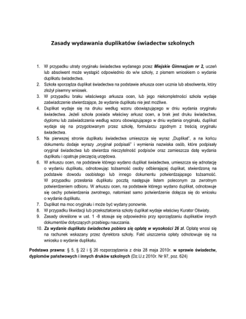 Zasady wydawania duplikatów świadectw szkolnych 1. W przypadku utraty oryginału świadectwa wydanego przez Miejskie Gimnazjum nr 2, uczeń lub absolwent może wystąpić odpowiednio do w/w szkoły, z pismem wnioskiem o wydanie duplikatu świadectwa. 2. Szkoła sporządza duplikat świadectwa na podstawie arkusza ocen ucznia lub absolwenta, który złożył pisemny wniosek. 3. W przypadku braku właściwego arkusza ocen, lub jego niekompletności szkoła wydaje zaświadczenie stwierdzające, że wydanie duplikatu nie jest możliwe. 4. Duplikat wydaje się na druku według wzoru obowiązującego w dniu wydania oryginału świadectwa. Jeżeli szkoła posiada właściwy arkusz ocen, a brak jest druku świadectwa, dyplomu lub zaświadczenia według wzoru obowiązującego w dniu wydania oryginału, duplikat wydaje się na przygotowanym przez szkołę, formularzu zgodnym z treścią oryginału świadectwa. 5. Na pierwszej stronie duplikatu świadectwa umieszcza się wyraz „Duplikat”, a na końcu dokumentu dodaje wyrazy „oryginał podpisali” i wymienia nazwiska osób, które podpisały oryginał świadectwa lub stwierdza nieczytelność podpisów oraz zamieszcza datę wydania duplikatu i opatruje pieczęcią urzędowa. 6. W arkuszu ocen, na podstawie którego wydano duplikat świadectwa, umieszcza się adnotację o wydaniu duplikatu, odnotowując tożsamość osoby odbierającej duplikat, stwierdzoną na podstawie dowodu osobistego lub innego dokumentu potwierdzającego tożsamość. W przypadku przesłania duplikatu pocztą następuje listem poleconym za zwrotnym potwierdzeniem odbioru. W arkuszu ocen, na podstawie którego wydano duplikat, odnotowuje się cechy potwierdzenia zwrotnego, natomiast samo potwierdzenie dołącza się do wniosku o wydanie duplikatu. 7. Duplikat ma moc oryginału i może być wydany ponownie. 8. W przypadku likwidacji lub przekształcenia szkoły duplikat wydaje właściwy Kurator Oświaty. 9. Zasady określone w ust. 1 -8 stosuje się odpowiednio przy sporządzaniu duplikatów innych dokumentów dotyczących przebiegu nauczania. 10. Za wydanie duplikatu świadectwa pobiera się opłatę w wysokości 26 zł. Opłatę wnosi się na rachunek wskazany przez dyrektora szkoły. Fakt uiszczenia opłaty odnotowuje się na wniosku o wydanie duplikatu. Podstawa prawna: § 5, § 22 i § 26 rozporządzenia z dnia 28 maja 2010r. w sprawie świadectw, dyplomów państwowych i innych druków szkolnych (Dz.U.z 2010r. Nr 97, poz. 624)