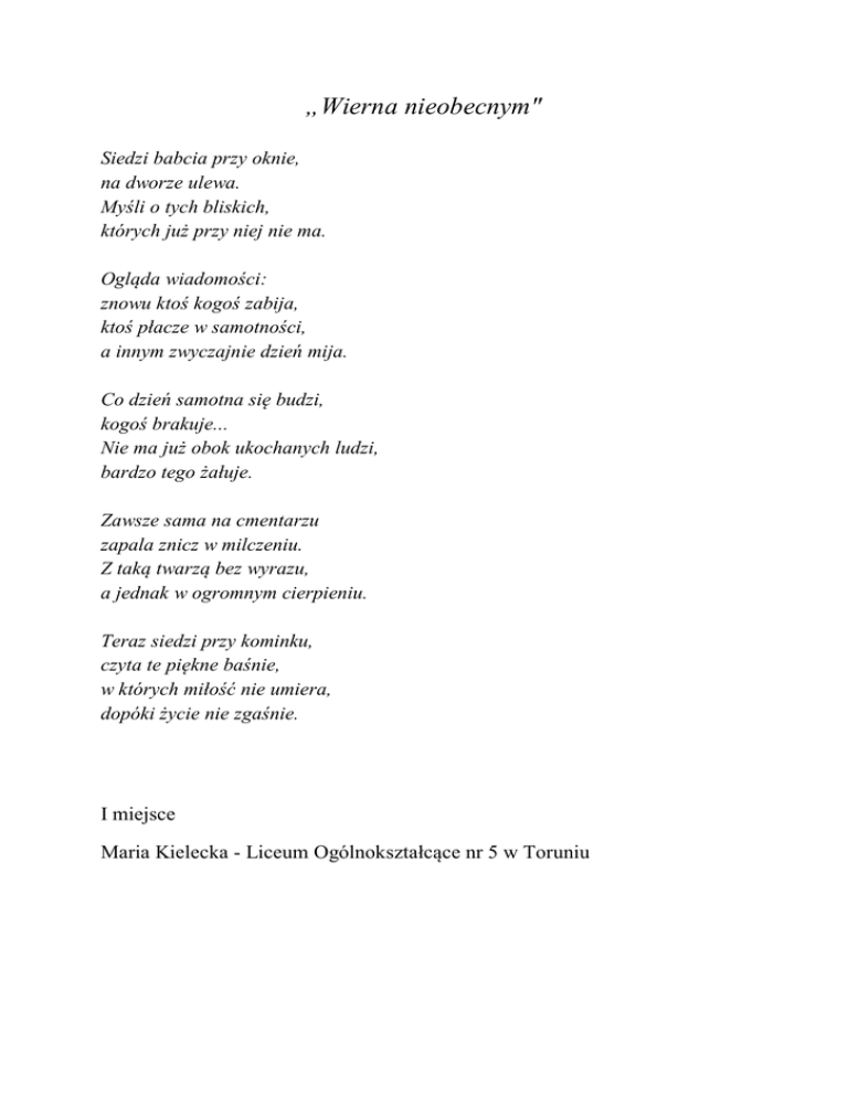 „Wierna nieobecnym" Siedzi babcia przy oknie, na dworze ulewa. Myśli o tych bliskich, których już przy niej nie ma. Ogląda wiadomości: znowu ktoś kogoś zabija, ktoś płacze w samotności, a innym zwyczajnie dzień mija. Co dzień samotna się budzi, kogoś brakuje... Nie ma już obok ukochanych ludzi, bardzo tego żałuje. Zawsze sama na cmentarzu zapala znicz w milczeniu. Z taką twarzą bez wyrazu, a jednak w ogromnym cierpieniu. Teraz siedzi przy kominku, czyta te piękne baśnie, w których miłość nie umiera, dopóki życie nie zgaśnie. I miejsce Maria Kielecka - Liceum Ogólnokształcące nr 5 w Toruniu