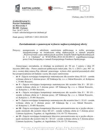 Chełmno, dnia 31.03.2014r. ZAMAWIAJĄCY: Powiat Chełmiński, ul. Harcerska 1 86-200 Chełmno Fax: 56 677 24 21 e-mail: [email protected] Znak sprawy: ZZP.041.7.2013.2014.GN Zawiadomienie o ponownym wyborze najkorzystniejszej oferty Dotyczy: postępowania o udzielenie zamówienia publicznego w trybie przetargu nieograniczonego na świadczenie usług edukacyjnych w ramach projektu „Wyrównywanie szans edukacyjnych uczniów Zespołu Szkół Ogólnokształcących nr 1 w Chełmnie" nr WND-POKL.09.01.02-04-089/13 współfinansowanego przez Unię Europejską w ramach Europejskiego Funduszu Społecznego. Zamawiający zawiadamia, że działając na podstawie art. 94 ust. 3 ustawy z dnia 29 stycznia 2004 roku – Prawo zamówień publicznych (tekst jedn.: Dz. U. z 2013 r. poz. 907 ze zm.), zwanej dalej ustawą Pzp, dokonał ponownego wyboru ofert spośród pozostałych ofert bez przeprowadzania ich badania i oceny dla części zamówienia: − nr 4 - Zajęcia rozwijające kompetencje matematyczne dla uczniów klasy III LO – została wybrana oferta nr 3 złożona przez: AP Edukacja Sp. z o. o. Odział Rzeszów, ul. Kolejowa 1, 35-001 Rzeszów, − nr 5 - Zajęcia rozwijające kompetencje matematyczne dla uczniów klas II i III LO została wybrana oferta nr 3 złożona przez: AP Edukacja Sp. z o. o. Odział Rzeszów, ul. Kolejowa 1, 35-001 Rzeszów, − nr 6 - Zajęcia rozwijające kompetencje matematyczne dla uczniów klas II i III LO została wybrana oferta nr 3 złożona przez: AP Edukacja Sp. z o. o. Odział Rzeszów, ul. Kolejowa 1, 35-001 Rzeszów, − nr 7 - Zajęcia rozwijające kompetencje matematyczne dla uczniów klas I i II LO - została wybrana oferta nr 3 złożona przez: AP Edukacja Sp. z o.o. Odział Rzeszów, ul. Kolejowa 1, 35-001 Rzeszów, − nr 18 - Zajęcia rozwijające kompetencje kluczowe porozumiewania się w języku obcym język niemiecki dla uczniów klasy III LO - została wybrana oferta nr 5 złożona przez: Centrum Językowe, Together, ul. Jagiellońska 3/16, 03-721 Warszawa, − nr 19 - Zajęcia rozwijające kompetencje kluczowe porozumiewania się w języku obcym język niemiecki dla uczniów klas II i III LO - została wybrana oferta nr 5 złożona przez: Centrum Językowe, Together, ul. Jagiellońska 3/16, 03-721 Warszawa, P r o j e k t w s p ó ł f i n a n s o w a n y w r a m a c h E u r o p e j s k i e g o p r z e z U n i ę E u r o p e j s k ą F u n d u s z u S p o ł e c z n e g o − nr 20 - Zajęcia rozwijające kompetencje kluczowe porozumiewania się w języku obcym język niemiecki dla uczniów LO - została wybrana oferta nr 5 złożona przez: Centrum Językowe, Together, ul. Jagiellońska 3/16, 03-721 Warszawa, − nr 21 - Zajęcia rozwijające kompetencje kluczowe porozumiewania się w języku obcym język angielski dla uczniów klasy III LO - została wybrana oferta nr 5 złożona przez: Centrum Językowe, Together, ul. Jagiellońska 3/16, 03-721 Warszawa, − nr 22 - Zajęcia rozwijające kompetencje kluczowe porozumiewania się w języku obcym język angielski dla uczniów klas II i III LO - została wybrana oferta nr 5 złożona przez: Centrum Językowe, Together, ul. Jagiellońska 3/16, 03-721 Warszawa, Uzasadnienie wyboru: Zgodnie z zawiadomieniem o wyborze najkorzystniejszej oferty z dnia 21 marca 2014r. w przedmiotowym postępowaniu o udzielenie zamówienia publicznego wybrane zostały oferty następujących Wykonawców: − w części zamówienia nr 4 - oferta nr 2 złożona przez: Ośrodek Nauczania Języków Obcych Języki Świata, Katarzyna Anna Kowalczuk, ul, Sienkiewicza 43, 15-002 Białystok, − w części zamówienia nr 5 - oferta nr 2 złożona przez: Ośrodek Nauczania Języków Obcych Języki Świata, Katarzyna Anna Kowalczuk, ul, Sienkiewicza 43, 15-002 Białystok, − w części zamówienia nr 6 - oferta nr 2 złożona przez: Ośrodek Nauczania Języków Obcych Języki Świata, Katarzyna Anna Kowalczuk, ul, Sienkiewicza 43, 15-002 Białystok, − w części zamówienia nr 7 - oferta nr 2 złożona przez: Ośrodek Nauczania Języków Obcych Języki Świata, Katarzyna Anna Kowalczuk, ul, Sienkiewicza 43, 15-002 Białystok, − w części zamówienia nr 18 - oferta nr 2 złożona przez: Ośrodek Nauczania Języków Obcych Języki Świata, Katarzyna Anna Kowalczuk, ul, Sienkiewicza 43, 15-002 Białystok, − w części zamówienia nr 19 - oferta nr 2 złożona przez: Ośrodek Nauczania Języków Obcych Języki Świata, Katarzyna Anna Kowalczuk, ul, Sienkiewicza 43, 15-002 Białystok, − w części zamówienia nr 20 - oferta nr 2 złożona przez: Ośrodek Nauczania Języków Obcych Języki Świata, Katarzyna Anna Kowalczuk, ul, Sienkiewicza 43, 15-002 Białystok, − w części zamówienia nr 21 - język angielski dla uczniów klasy III LO - oferta nr 3 złożona przez: AP Edukacja Sp. z o.o. Odział Rzeszów, ul. Kolejowa 1, 35-001 Rzeszów, − w części zamówienia nr 22 - oferta nr 3 złożona przez: AP Edukacja Sp. z o.o. Odział Rzeszów, ul. Kolejowa 1, 35-001 Rzeszów, W związku z uchyleniem się wyższej wymienionych Wykonawcy od zawarcia umów, Zamawiający działając na podstawie art. 94 ust. 3 ustawy Pzp, wybrał oferty najkorzystniejsze w poszczególnych częściach zamówienia spośród pozostałych ofert, bez przeprowadzania ich ponownego badania i oceny. P r o j e k t w s p ó ł f i n a n s o w a n y w r a m a c h E u r o p e j s k i e g o p r z e z U n i ę E u r o p e j s k ą F u n d u s z u S p o ł e c z n e g o Wybrani w poszczególnych częściach zamówienia Wykonawcy spełnili warunki udziału w postępowaniu i nie podlegają wykluczeniu, a oferty przez nich złożone nie podlegają odrzucone. Jednocześnie żądamy zawiadomienia. potwierdzenia otrzymania drogą elektroniczną niniejszego /Wojciech Bińczyk/ /Starosta Chełmiński/ Otrzymują: 1. Ośrodek Nauczania Języków Obcych Języki Świata, Katarzyna Anna Kowalczuk, ul, Sienkiewicza 43, 15-002 Białystok, AP Edukacja Sp. z o.o. Odział Rzesz