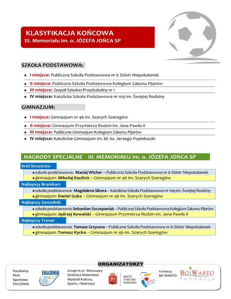 KLASYFIKACJA KOŃCOWA III. Memoriału im. o. JÓZEFA JOŃCA SP SZKOŁA PODSTAWOWA: I miejsce: Publiczna Szkoła Podstawowa nr 6 Sióstr Niepokalanek II miejsce: Publiczna Szkoła Podstawowa Kolegium Zakonu Pijarów III miejsce: Zespół Szkolno-Przedszkolny nr 1 IV miejsce: Katolicka Szkoła Podstawowa nr 109 im. Świętej Rodziny GIMNAZJUM: I miejsce: Gimnazjum nr 46 im. Szarych Szeregów II miejsce: Gimnazjum Przymierza Rodzin im. Jana Pawła II III miejsce: Publiczne Gimnazjum Kolegium Zakonu Pijarów IV miejsce: Katolickie Gimnazjum im. bł. ks. Jerzego Popiełuszki NAGRODY SPECJALNE III. MEMORIAŁU im. o. JÓZEFA JOŃCA SP Król Strzelców szkoła podstawowa: Maciej Wicher – Publiczna Szkoła Podstawowa nr 6 Sióstr Niepokalanek gimnazjum: Mikołaj Kaulinis – Gimnazjum nr 46 im. Szarych Szeregów Najlepszy Bramkarz szkoła podstawowa: Magdalena Sikora – Katolicka Szkoła Podstawowa nr 109 im. Świętej Rodziny gimnazjum: Daniel Guba – Gimnazjum nr 46 im. Szarych Szeregów Najlepszy Zawodnik szkoła podstawowa: Sebastian Szczepaniak – Publiczna Szkoła Podstawowa Kolegium Zakonu Pijarów gimnazjum: Jędrzej Kowalski – Gimnazjum Przymierza Rodzin im. Jana Pawła II Najlepszy Trener szkoła podstawowa: Tomasz Grzywna – Publiczna Szkoła Podstawowa nr 6 Sióstr Niepokalanek gimnazjum: Tomasz Kycko – Gimnazjum nr 46 im. Szarych Szeregów ORGANIZATORZY Parafialny Klub Sportowy FALCONIA Urząd m.st. Warszawy Dzielnica Mokotów/ Wydział Kultury, Sportu i Rekreacji Fundacja BO WARTO