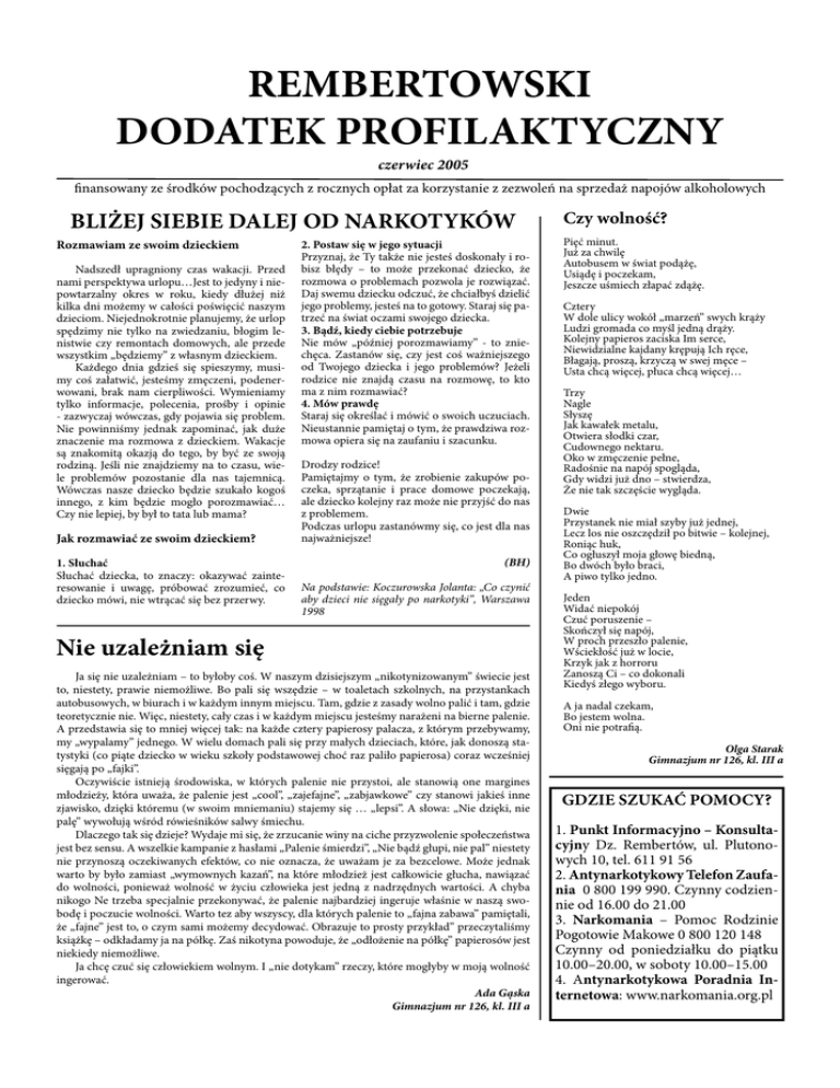 REMBERTOWSKI DODATEK PROFILAKTYCZNY czerwiec 2005 finansowany ze środków pochodzących z rocznych opłat za korzystanie z zezwoleń na sprzedaż napojów alkoholowych BLIŻEJ SIEBIE DALEJ OD NARKOTYKÓW Rozmawiam ze swoim dzieckiem Nadszedł upragniony czas wakacji. Przed nami perspektywa urlopu…Jest to jedyny i niepowtarzalny okres w roku, kiedy dłużej niż kilka dni możemy w całości poświęcić naszym dzieciom. Niejednokrotnie planujemy, że urlop spędzimy nie tylko na zwiedzaniu, błogim lenistwie czy remontach domowych, ale przede wszystkim „będziemy” z własnym dzieckiem. Każdego dnia gdzieś się spieszymy, musimy coś załatwić, jesteśmy zmęczeni, podenerwowani, brak nam cierpliwości. Wymieniamy tylko informacje, polecenia, prośby i opinie - zazwyczaj wówczas, gdy pojawia się problem. Nie powinniśmy jednak zapominać, jak duże znaczenie ma rozmowa z dzieckiem. Wakacje są znakomitą okazją do tego, by być ze swoją rodziną. Jeśli nie znajdziemy na to czasu, wiele problemów pozostanie dla nas tajemnicą. Wówczas nasze dziecko będzie szukało kogoś innego, z kim będzie mogło porozmawiać… Czy nie lepiej, by był to tata lub mama? Jak rozmawiać ze swoim dzieckiem? 1. Słuchać Słuchać dziecka, to znaczy: okazywać zainteresowanie i uwagę, próbować zrozumieć, co dziecko mówi, nie wtrącać się bez przerwy. 2. Postaw się w jego sytuacji Przyznaj, że Ty także nie jesteś doskonały i robisz błędy – to może przekonać dziecko, że rozmowa o problemach pozwola je rozwiązać. Daj swemu dziecku odczuć, że chciałbyś dzielić jego problemy, jesteś na to gotowy. Staraj się patrzeć na świat oczami swojego dziecka. 3. Bądź, kiedy ciebie potrzebuje Nie mów „później porozmawiamy” - to zniechęca. Zastanów się, czy jest coś ważniejszego od Twojego dziecka i jego problemów? Jeżeli rodzice nie znajdą czasu na rozmowę, to kto ma z nim rozmawiać? 4. Mów prawdę Staraj się określać i mówić o swoich uczuciach. Nieustannie pamiętaj o tym, że prawdziwa rozmowa opiera się na zaufaniu i szacunku. Drodzy rodzice! Pamiętajmy o tym, że zrobienie zakupów poczeka, sprzątanie i prace domowe poczekają, ale dziecko kolejny raz może nie przyjść do nas z problemem. Podczas urlopu zastanówmy się, co jest dla nas najważniejsze! (BH) Na podstawie: Koczurowska Jolanta: „Co czynić aby dzieci nie sięgały po narkotyki”, Warszawa 1998 Nie uzależniam się Ja się nie uzależniam – to byłoby coś. W naszym dzisiejszym „nikotynizowanym” świecie jest to, niestety, prawie niemożliwe. Bo pali się wszędzie – w toaletach szkolnych, na przystankach autobusowych, w biurach i w każdym innym miejscu. Tam, gdzie z zasady wolno palić i tam, gdzie teoretycznie nie. Więc, niestety, cały czas i w każdym miejscu jesteśmy narażeni na bierne palenie. A przedstawia się to mniej więcej tak: na każde cztery papierosy palacza, z którym przebywamy, my „wypalamy” jednego. W wielu domach pali się przy małych dzieciach, które, jak donoszą statystyki (co piąte dziecko w wieku szkoły podstawowej choć raz paliło papierosa) coraz wcześniej sięgają po „fajki”. Oczywiście istnieją środowiska, w których palenie nie przystoi, ale stanowią one margines młodzieży, która uważa, że palenie jest „cool”, „zajefajne”, „zabjawkowe” czy stanowi jakieś inne zjawisko, dzięki któremu (w swoim mniemaniu) stajemy się … „lepsi”. A słowa: „Nie dzięki, nie palę” wywołują wśród rówieśników salwy śmiechu. Dlaczego tak się dzieje? Wydaje mi się, że zrzucanie winy na ciche przyzwolenie społeczeństwa jest bez sensu. A wszelkie kampanie z hasłami „Palenie śmierdzi”, „Nie bądź głupi, nie pal” niestety nie przynoszą oczekiwanych efektów, co nie oznacza, że uważam je za bezcelowe. Może jednak warto by było zamiast „wymownych kazań”, na które młodzież jest całkowicie głucha, nawiązać do wolności, ponieważ wolność w życiu człowieka jest jedną z nadrzędnych wartości. A chyba nikogo Ne trzeba specjalnie przekonywać, że palenie najbardziej ingeruje właśnie w naszą swobodę i poczucie wolności. Warto tez aby wszyscy, dla których palenie to „fajna zabawa” pamiętali, że „fajne” jest to, o czym sami możemy decydować. Obrazuje to prosty przykład” przeczytaliśmy książkę – odkładamy ja na półkę. Zaś nikotyna powoduje, że „odłożenie na półkę” papierosów jest niekiedy niemożliwe. Ja chcę czuć się człowiekiem wolnym. I „nie dotykam” rzeczy, które mogłyby w moją wolność ingerować. Ada Gąska Gimnazjum nr 126, kl. III a Czy wolność? Pięć minut. Już za chwilę Autobusem w świat podążę, Usiądę i poczekam, Jeszcze uśmiech złapać zdążę. Cztery W dole ulicy wokół „marzeń” swych krąży Ludzi gromada co myśl jedną drąży. Kolejny papieros zaciska Im serce, Niewidzialne kajdany krępują Ich ręce, Błagają, proszą, krzyczą w swej męce – Usta chcą więcej, płuca chcą więcej… Trzy Nagle Słyszę Jak kawałek metalu, Otwiera słodki czar, Cudownego nektaru. Oko w zmęczenie pełne, Radośnie na napój spogląda, Gdy widzi już dno – stwierdza, Że nie tak szczęście wygląda. Dwie Przystanek nie miał szyby już jednej, Lecz los nie oszczędził po bitwie – kolejnej, Roniąc huk, Co ogłuszył moja głowę biedną, Bo dwóch było braci, A piwo tylko jedno. Jeden Widać niepokój Czuć poruszenie – Skończył się napój, W proch przeszło palenie, Wściekłość już w locie, Krzyk jak z horroru Zanoszą Ci – co dokonali Kiedyś złego wyboru. A ja nadal czekam, Bo jestem wolna. Oni nie potrafią. Olga Starak Gimnazjum nr 126, kl. III a GDZIE SZUKAĆ POMOCY? 1. Punkt Informacyjno – Konsultacyjny Dz. Rembertów, ul. Plutonowych 10, tel. 611 91 56 2. Antynarkotykowy Telefon Zaufania 0 800 199 990. Czynny codziennie od 16.00 do 21.00 3. Narkomania – Pomoc Rodzinie 