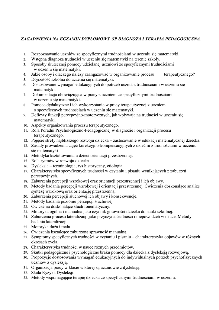 ZAGADNIENIA NA EGZAMIN DYPLOMOWY SP DIAGNOZA I TERAPIA PEDAGOGICZNA. 1. 2. 3. 4. 5. 6. 7. 8. 9. 10. 11. 12. 13. 14. 15. 16. 17. 18. 19. 20. 21. 22. 23. 24. 25. 26. 27. 28. 29. 30. 31. 32. 33. Rozpoznawanie uczniów ze specyficznymi trudnościami w uczeniu się matematyki. Wstępna diagnoza trudności w uczeniu się matematyki na terenie szkoły. Sposoby skutecznej pomocy udzielanej uczniowi ze specyficznymi trudnościami w uczeniu się matematyki. Jakie osoby i dlaczego należy zaangażować w organizowanie procesu terapeutycznego? Dojrzałość szkolna do uczenia się matematyki. Dostosowanie wymagań edukacyjnych do potrzeb ucznia z trudnościami w uczeniu się matematyki. Dokumentacja obowiązująca w pracy z uczniem ze specyficznymi trudnościami w uczeniu się matematyki. Pomoce dydaktyczne i ich wykorzystanie w pracy terapeutycznej z uczniem o specyficznych trudnościach w uczeniu się matematyki. Deficyty funkcji percepcyjno-motorycznych, jak wpływają na trudności w uczeniu się matematyki. Aspekty organizowania procesu terapeutycznego. Rola Poradni Psychologiczno-Pedagogicznej w diagnozie i organizacji procesu terapeutycznego. Pojęcie strefy najbliższego rozwoju dziecka – zastosowanie w edukacji matematycznej dziecka. Zasady prowadzenia zajęć korekcyjno-kompensacyjnych z dziećmi z trudnościami w uczeniu się matematyki Metodyka kształtowania u dzieci orientacji przestrzennej. Rola rytmów w rozwoju dziecka. Dysleksja – terminologia, rys historyczny, etiologia. Charakterystyka specyficznych trudności w czytaniu i pisaniu wynikających z zaburzeń percepcyjnych. Zaburzenia percepcji wzrokowej oraz orientacji przestrzennej i ich objawy. Metody badania percepcji wzrokowej i orientacji przestrzennej. Ćwiczenia doskonalące analizę syntezę wzrokową oraz orientację przestrzenną. Zaburzenia percepcji słuchowej ich objawy i konsekwencje. Metody badania poziomu percepcji słuchowej. Ćwiczenia doskonalące słuch fonematyczny. Motoryka ogólna i manualna jako czynnik gotowości dziecka do nauki szkolnej. Zaburzenia procesu lateralizacji jako przyczyna trudności i niepowodzeń w nauce. Metody badania lateralizacji. Motoryka duża i mała. Ćwiczenia kształcące zaburzoną sprawność manualną. Symptomy specyficznych trudności w czytaniu i pisaniu – charakterystyka objawów w różnych okresach życia. Charakterystyka trudności w nauce różnych przedmiotów. Skutki pedagogiczne i psychologiczne braku pomocy dla dziecka z dysleksją rozwojową. Propozycje dostosowania wymagań edukacyjnych do indywidualnych potrzeb psychofizycznych uczniów z dysleksją. Organizacja pracy w klasie w której są uczniowie z dysleksją. Skala Ryzyka Dysleksji. Metody wspomagające terapię dziecka ze specyficznymi trudnościami w uczeniu. Cele i zasady prowadzenia terapii pedagogicznej. Etapy pracy terapeutycznej. Programowanie pracy korekcyjno-kompensacyjnej. Tworzenie konspektów zajęć korekcyjno-kompensacyjnych. Planowanie jednostki metodycznej. Organizacja pracy w zespołach korekcyjno-kompensacyjnych. Dokumentacja zajęć. Współpraca terapeuty z rodzicami. 39. Analiza opinii poradni psychologiczno-pedagogicznych. 40. Pomoc psychologiczno – pedagogiczna w świetle prawa oświatowego. 34. 35. 36. 37. 38.
