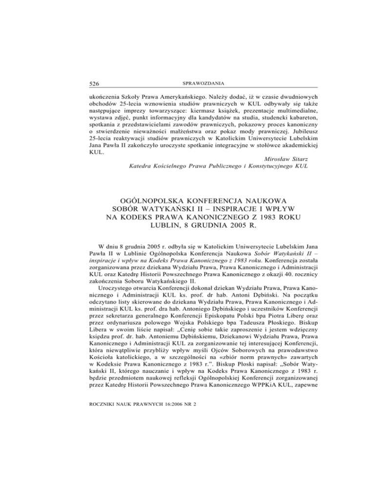526 SPRAWOZDANIA ukończenia Szkoły Prawa Amerykańskiego. Należy dodać, iż w czasie dwudniowych obchodów 25-lecia wznowienia studiów prawniczych w KUL odbywały sie˛ także naste˛pujace ˛ imprezy towarzyszace: ˛ kiermasz ksiażek, ˛ prezentacje multimedialne, wystawa zdje˛ć, punkt informacyjny dla kandydatów na studia, studencki kabareton, spotkania z przedstawicielami zawodów prawniczych, pokazowy proces kanoniczny o stwierdzenie nieważności małżeństwa oraz pokaz mody prawniczej. Jubileusz 25-lecia reaktywacji studiów prawniczych w Katolickim Uniwersytecie Lubelskim Jana Pawła II zakończyło uroczyste spotkanie integracyjne w stołówce akademickiej KUL. Mirosław Sitarz Katedra Kościelnego Prawa Publicznego i Konstytucyjnego KUL OGÓLNOPOLSKA KONFERENCJA NAUKOWA SOBÓR WATYKAŃSKI II – INSPIRACJE I WPŁYW NA KODEKS PRAWA KANONICZNEGO Z 1983 ROKU LUBLIN, 8 GRUDNIA 2005 R. W dniu 8 grudnia 2005 r. odbyła sie˛ w Katolickim Uniwersytecie Lubelskim Jana Pawła II w Lublinie Ogólnopolska Konferencja Naukowa Sobór Watykański II – inspiracje i wpływ na Kodeks Prawa Kanonicznego z 1983 roku. Konferencja została zorganizowana przez dziekana Wydziału Prawa, Prawa Kanonicznego i Administracji KUL oraz Katedre˛ Historii Powszechnego Prawa Kanonicznego z okazji 40. rocznicy zakończenia Soboru Watykańskiego II. Uroczystego otwarcia Konferencji dokonał dziekan Wydziału Prawa, Prawa Kanonicznego i Administracji KUL ks. prof. dr hab. Antoni De˛biński. Na poczatku ˛ odczytano listy skierowane do dziekana Wydziału Prawa, Prawa Kanonicznego i Administracji KUL ks. prof. dra hab. Antoniego De˛bińskiego i uczestników Konferencji przez sekretarza generalnego Konferencji Episkopatu Polski bpa Piotra Libere˛ oraz przez ordynariusza polowego Wojska Polskiego bpa Tadeusza Płoskiego. Biskup Libera w swoim liście napisał: „Cenie˛ sobie takie zaproszenie i jestem wdzie˛czny ksie˛dzu prof. dr. hab. Antoniemu De˛bińskiemu, Dziekanowi Wydziału Prawa, Prawa Kanonicznego i Administracji KUL za zorganizowanie tej interesujacej ˛ Konferencji, która niewatpliwie ˛ przybliży wpływ myśli Ojców Soborowych na prawodawstwo Kościoła katolickiego, a w szczególności na «zbiór norm prawnych» zawartych w Kodeksie Prawa Kanonicznego z 1983 r.”. Biskup Płoski napisał: „Sobór Watykański II, którego nauczanie i wpływ na Kodeks Prawa Kanonicznego z 1983 r. be˛dzie przedmiotem naukowej refleksji Ogólnopolskiej Konferencji zorganizowanej przez Katedre˛ Historii Powszechnego Prawa Kanonicznzego WPPKiA KUL, zapewne ROCZNIKI NAUK PRAWNYCH 16:2006 NR 2 SPRAWOZDANIA 527 wydobył elementy stare i nowe z Tradycji Kościoła, aby wyjść naprzeciw oczekiwaniom i problemom zwiazanym ˛ z rozwojem badań teologicznych i prawnokanonicznych. Przez swoja˛ pracowitość, ofiarność, uczciwość naukowa˛ i dociekliwość w zgłe˛bianiu problemów prawnych Wydział wpływa na stan poznania Kodeksu prawa kanonicznego i korzystanie z jego norm w codziennym życiu. Niech dobry Bóg, który swoja˛ madrości ˛ a˛ przenika umysł człowieka, wspomoże każda˛ twórcza˛ myśl w służbie prawdzie i wolności człowieka”. Sesji pierwszej przewodniczył dziekan Wydziału Prawa Kanonicznego Uniwersytetu Kardynała Stefana Wyszyńskiego w Warszawie ks. prof. dr hab. Józef Wroceński. Pierwszy referat Inicjatywa papieża Jana XXIII dotyczaca ˛ reformy prawa kanonicznego na tle Soboru Watykańskiego II zgodnie z planem Konferencji miał być wygłoszony przez ks. prof. dra hab. Wojciecha Góralskiego. Prelegent nie mógł przybyć na Konferencje˛, nadesłał tekst referatu, który ukaże sie˛ w materiałach pokonferencyjnych. Napisał w nim: „O reformie Kościoła nie można było myśleć bez jednoczesnej woli przeprowadzenia rewizji prawa kościelnego, które każdej reformie służy ze swej natury. Sobór Watykański II, z którego organami pozostawała w ścisłym kontakcie Papieska Komisja do Rewizji KPK, wywierał w sposób decydujacy ˛ swoje pie˛tno na kształtujacym ˛ sie˛ nowym porzadku ˛ prawnym Kościoła”. Drugi referat Odnowa prawa kanonicznego w perspektywie aggiornamento wygłosił ks. prof. dr hab. Janusz Gre˛źlikowski z UKSW z Warszawy. Stwierdził, że „soborowe aggiornamento było źródłem i impulsem oraz miało znaczacy ˛ wpływ na obecnie obowiazuj ˛ ace ˛ prawo kościelne zawarte w Kodeksie. Sobór dał Kościołowi bogaty skarbiec nauki i podniety do działania, ale jednocześnie wytyczył i ukształtował nowe prawo, dziedzictwo obowiazków, ˛ przepisów i zadań. Właśnie odnowa prawa w perspektywie aggiornamento stała sie˛ okolicznościa˛ stymulujac ˛ a˛ aktualizacje˛ prawa kanonicznego pod katem ˛ potrzeb zbawczych i duszpasterskich”. Po dyskusji nad treścia˛ referatu i po przerwie, w czasie której prelegenci i uczestnicy mogli wypić kawe˛, nawiazać ˛ rozmowe˛ i zakupić ksiażki, ˛ nastapiła ˛ druga cze˛ść I sesji. Referat Wpływ nauki Soboru Watykańskiego II na przepisy kościelnego prawa karnego w KPK z 1983 r. wygłosił bp dr Artur Grzegorz Miziński z KUL. Autor podkreślił wpływ nauczania soborowego na zasady rewizji i ostateczny kształt przepisów karnych. W swoim obszernym i wnikliwym referacie dokonał porównania V Ksie˛gi CIC z 1917 r. z procesem odnowy kanonicznego prawa karnego zwiazanym ˛ z wpływem na KPK z 1983 r., jaki wywarł Sobór Watykański II. Zaznaczył, że „Owocem prac Posoborowej Papieskiej Komisji do Rewizji Kodeksu prawa kanonicznego jest prawo karne odnowione, oparte na nauczaniu Soboru Watykańskiego II z jednoczesnym zachowaniem charakteru ściśle prawnego przepisów. Pomimo tak precyzyjnie opracowanej normatywy odnoszacej ˛ sie˛ tak do kary (in genere et in specie), jak i do procesu karnego ad poenas applicandas, widzianych jako ostatnia faza pastoralnej działalności Kościoła i ordynariusza, niepokoi fakt, że w praktyce aż do dnia dzisiejszego przec