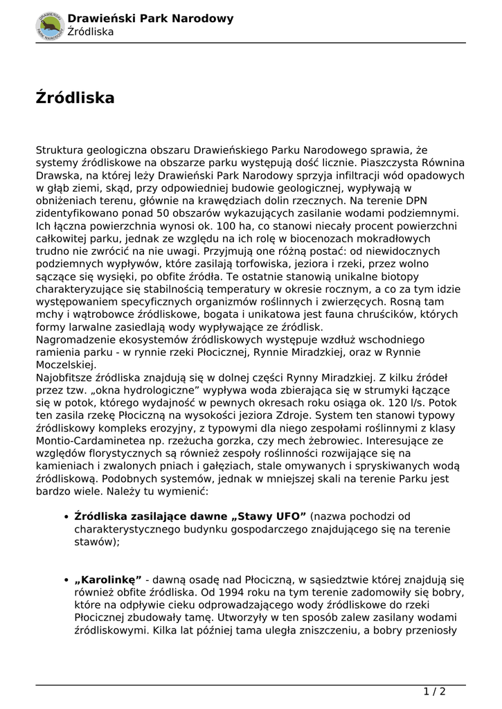 Drawieński Park Narodowy Źródliska Źródliska Struktura geologiczna obszaru Drawieńskiego Parku Narodowego sprawia, że systemy źródliskowe na obszarze parku występują dość licznie. Piaszczysta Równina Drawska, na której leży Drawieński Park Narodowy sprzyja infiltracji wód opadowych w głąb ziemi, skąd, przy odpowiedniej budowie geologicznej, wypływają w obniżeniach terenu, głównie na krawędziach dolin rzecznych. Na terenie DPN zidentyfikowano ponad 50 obszarów wykazujących zasilanie wodami podziemnymi. Ich łączna powierzchnia wynosi ok. 100 ha, co stanowi niecały procent powierzchni całkowitej parku, jednak ze względu na ich rolę w biocenozach mokradłowych trudno nie zwrócić na nie uwagi. Przyjmują one różną postać: od niewidocznych podziemnych wypływów, które zasilają torfowiska, jeziora i rzeki, przez wolno sączące się wysięki, po obfite źródła. Te ostatnie stanowią unikalne biotopy charakteryzujące się stabilnością temperatury w okresie rocznym, a co za tym idzie występowaniem specyficznych organizmów roślinnych i zwierzęcych. Rosną tam mchy i wątrobowce źródliskowe, bogata i unikatowa jest fauna chruścików, których formy larwalne zasiedlają wody wypływające ze źródlisk. Nagromadzenie ekosystemów źródliskowych występuje wzdłuż wschodniego ramienia parku - w rynnie rzeki Płocicznej, Rynnie Miradzkiej, oraz w Rynnie Moczelskiej. Najobfitsze źródliska znajdują się w dolnej części Rynny Miradzkiej. Z kilku źródeł przez tzw. „okna hydrologiczne” wypływa woda zbierająca się w strumyki łączące się w potok, którego wydajność w pewnych okresach roku osiąga ok. 120 l/s. Potok ten zasila rzekę Płociczną na wysokości jeziora Zdroje. System ten stanowi typowy źródliskowy kompleks erozyjny, z typowymi dla niego zespołami roślinnymi z klasy Montio-Cardaminetea np. rzeżucha gorzka, czy mech żebrowiec. Interesujące ze względów florystycznych są również zespoły roślinności rozwijające się na kamieniach i zwalonych pniach i gałęziach, stale omywanych i spryskiwanych wodą źródliskową. Podobnych systemów, jednak w mniejszej skali na terenie Parku jest bardzo wiele. Należy tu wymienić: Źródliska zasilające dawne „Stawy UFO” (nazwa pochodzi od charakterystycznego budynku gospodarczego znajdującego się na terenie stawów); „Karolinkę” - dawną osadę nad Płociczną, w sąsiedztwie której znajdują się również obfite źródliska. Od 1994 roku na tym terenie zadomowiły się bobry, które na odpływie cieku odprowadzającego wody źródliskowe do rzeki Płocicznej zbudowały tamę. Utworzyły w ten sposób zalew zasilany wodami źródliskowymi. Kilka lat później tama uległa zniszczeniu, a bobry przeniosły 1/2 Drawieński Park Narodowy Źródliska się na inne tereny. „Źródliskowy Grąd” - obszar ochrony ścisłej nad brzegiem Drawy na północny zachód od Głuska, porośnięty buczyną. Po obu stronach rzeki występują liczne wysięki i źródliska z interesująca florą i fauną bezkręgowców. Źródliska w rynnie Moczelskiej – system wysięków i źródeł na południowy wschód od Moczeli zasilający Drawę. Data wydruku: 08.03.2017 01:48:30 Adres URL: http://dpn.pl/zrodliska 2/2 Powered by TCPDF (www.tcpdf.org)